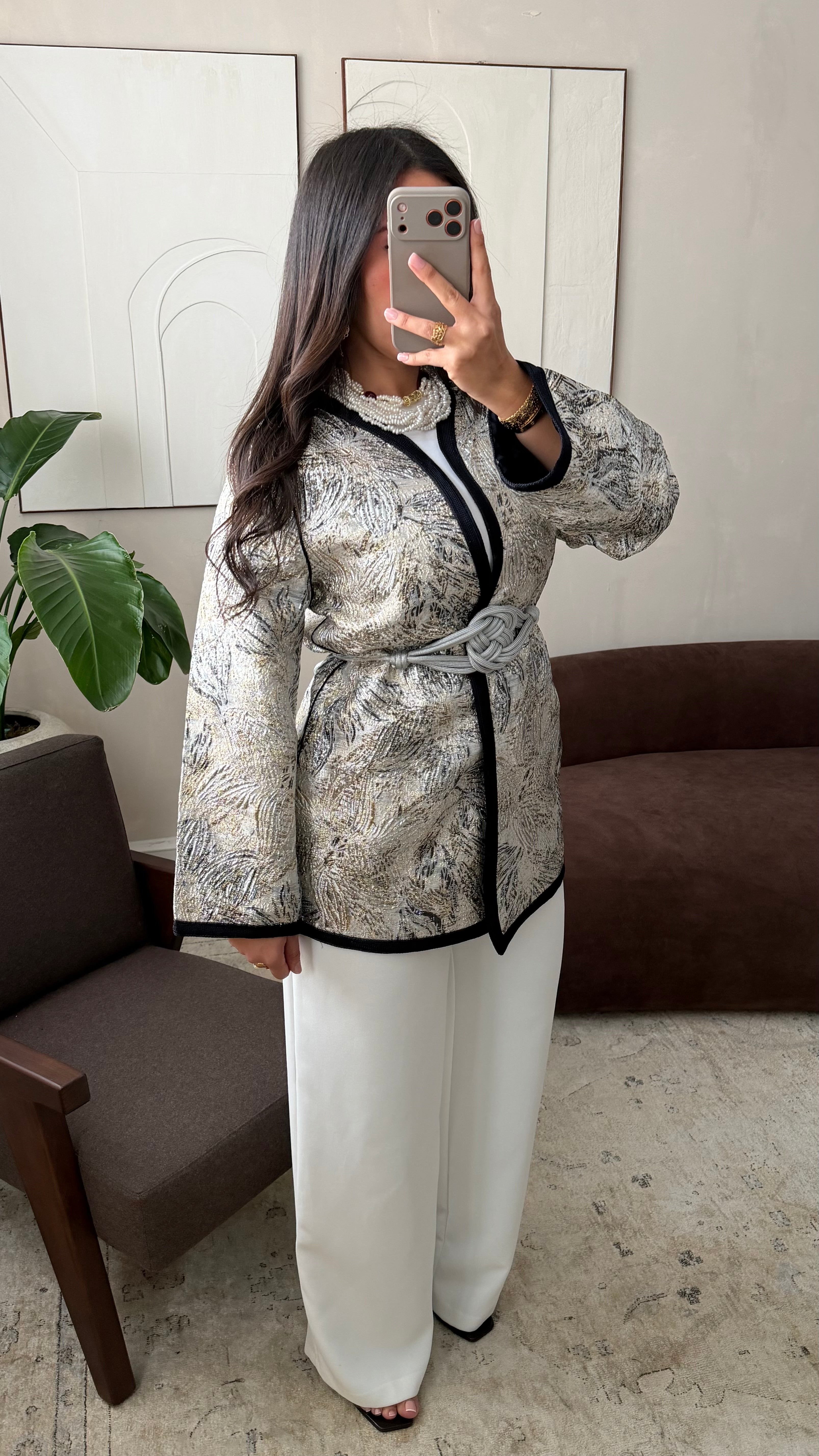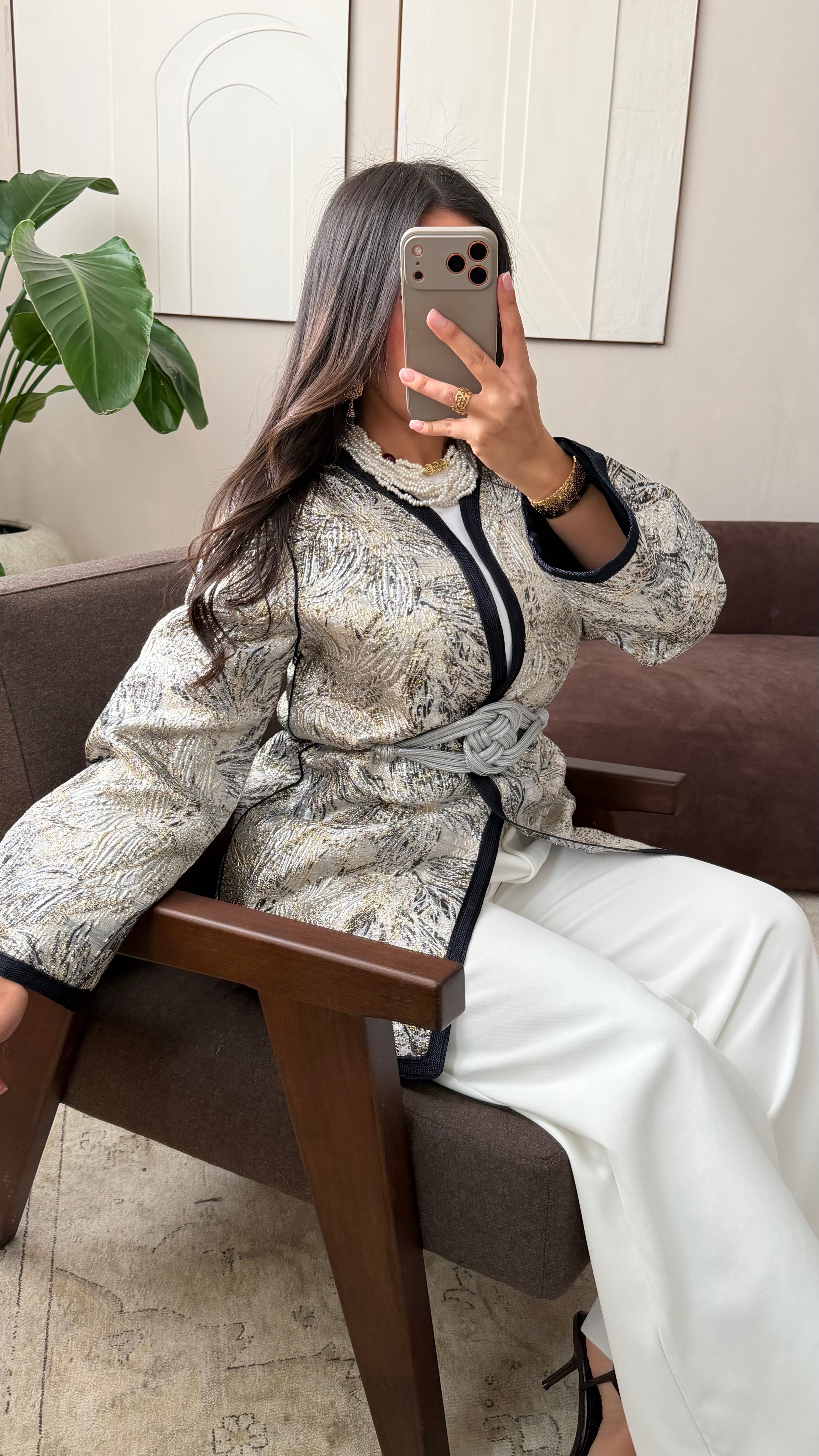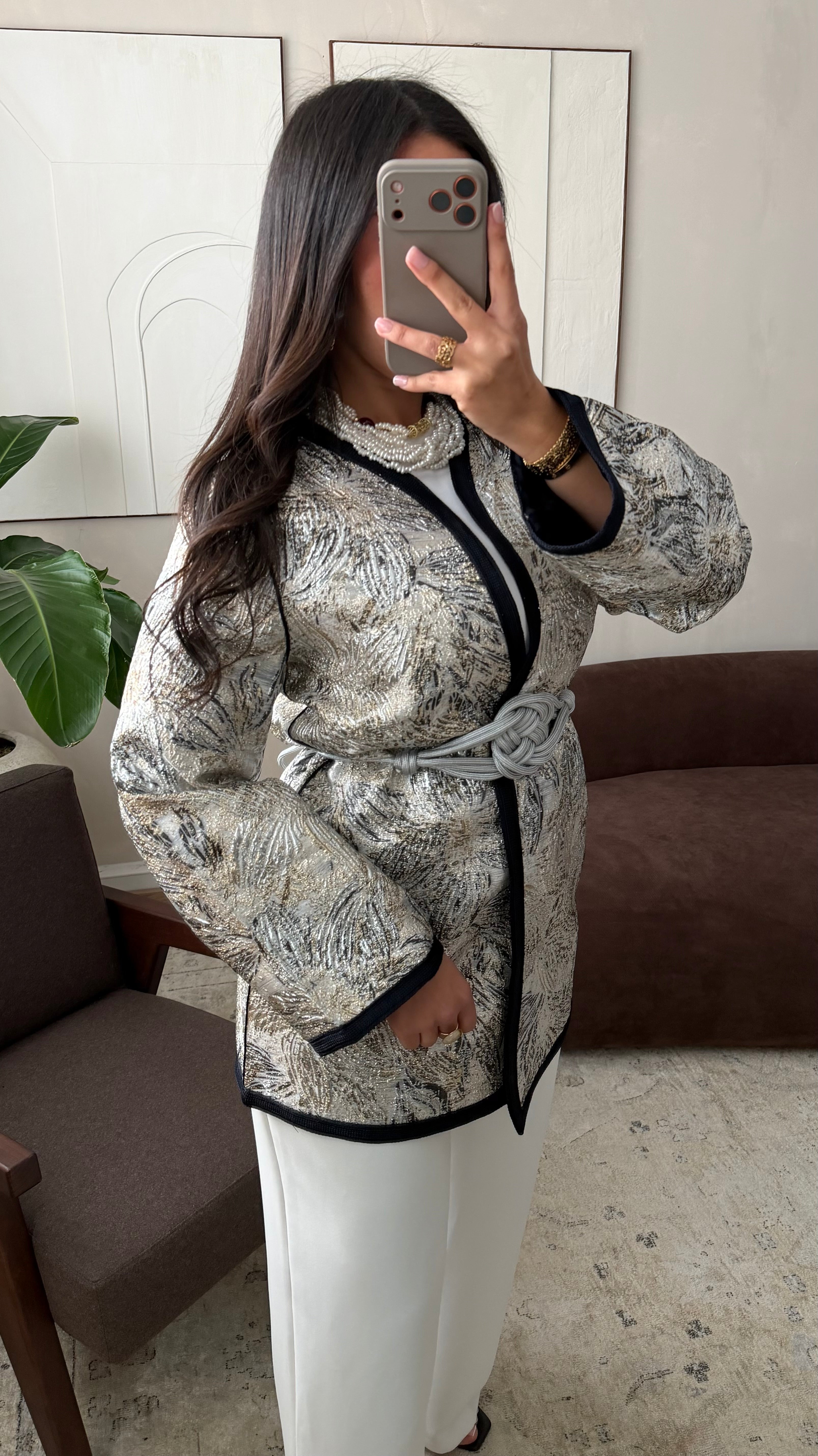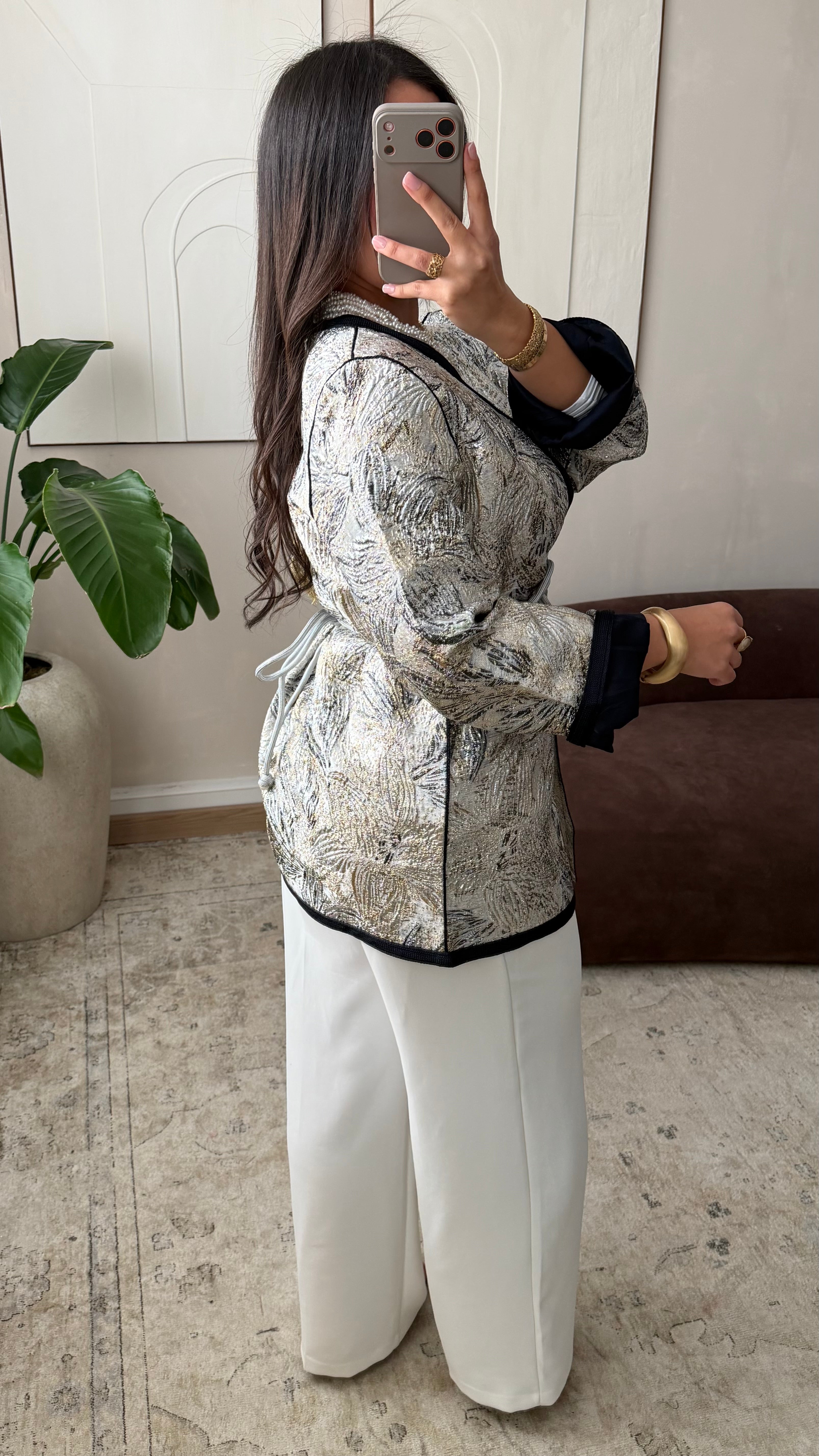 Ce kimono court en brocard est une pièce forte au charme sophistiqué. Sa matière texturée apporte du relief et une touche raffinée, tandis que sa coupe fluide et structurée sublime naturellement la silhouette. Facile à superposer, il vient rehausser instantanément n’importe quelle tenue.