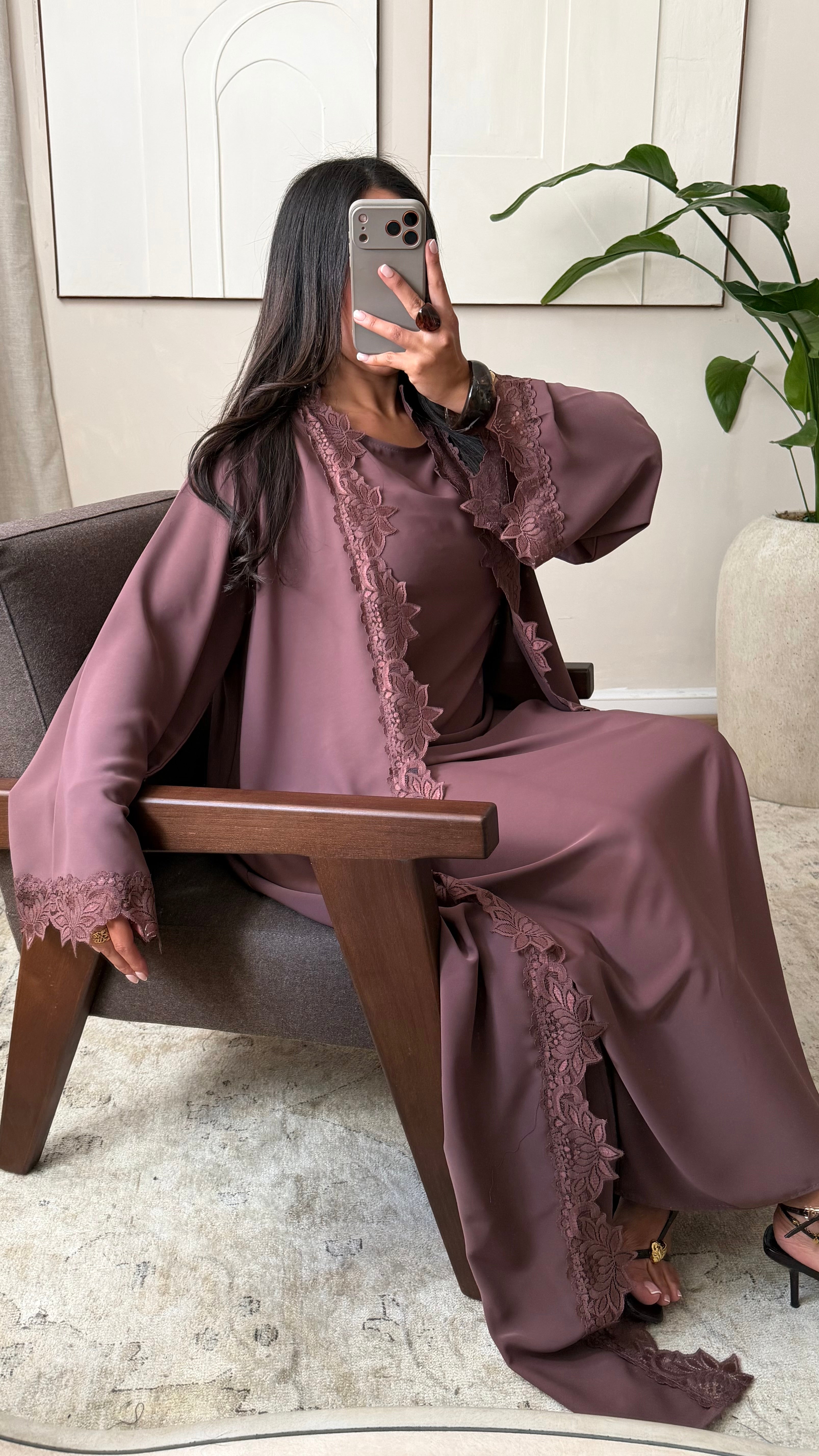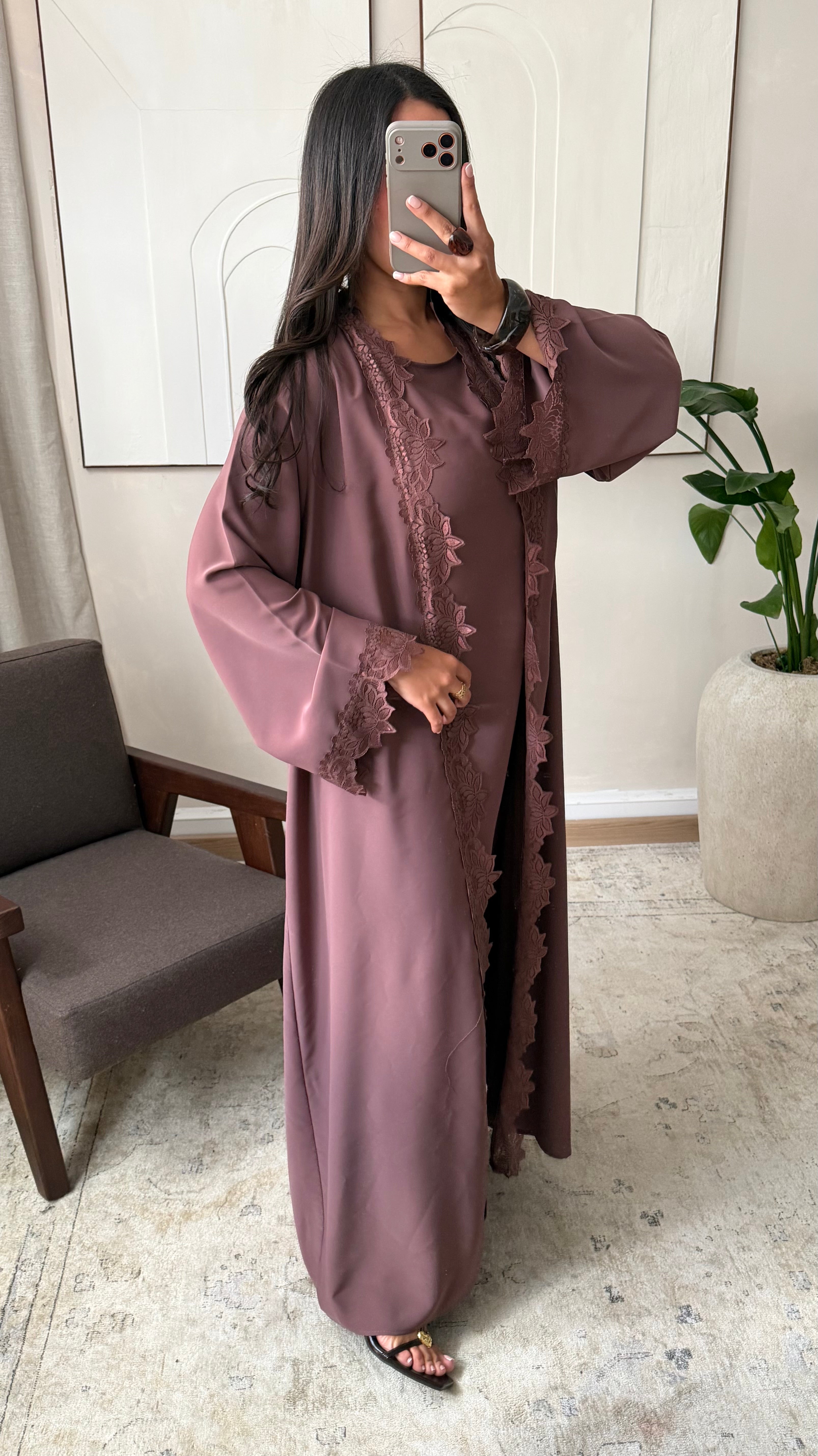 Ensemble abaya kimono dentelle I Rose marron