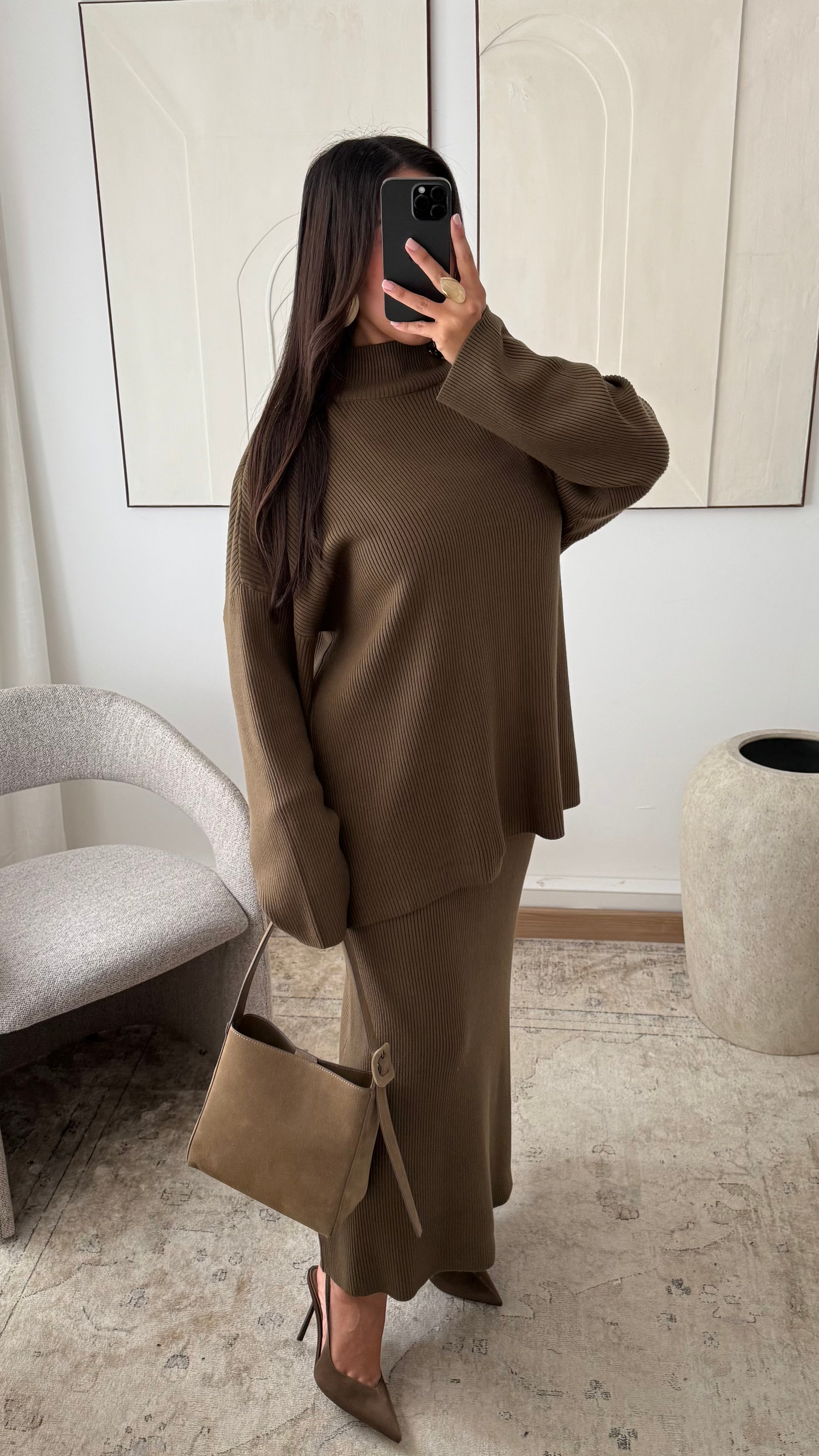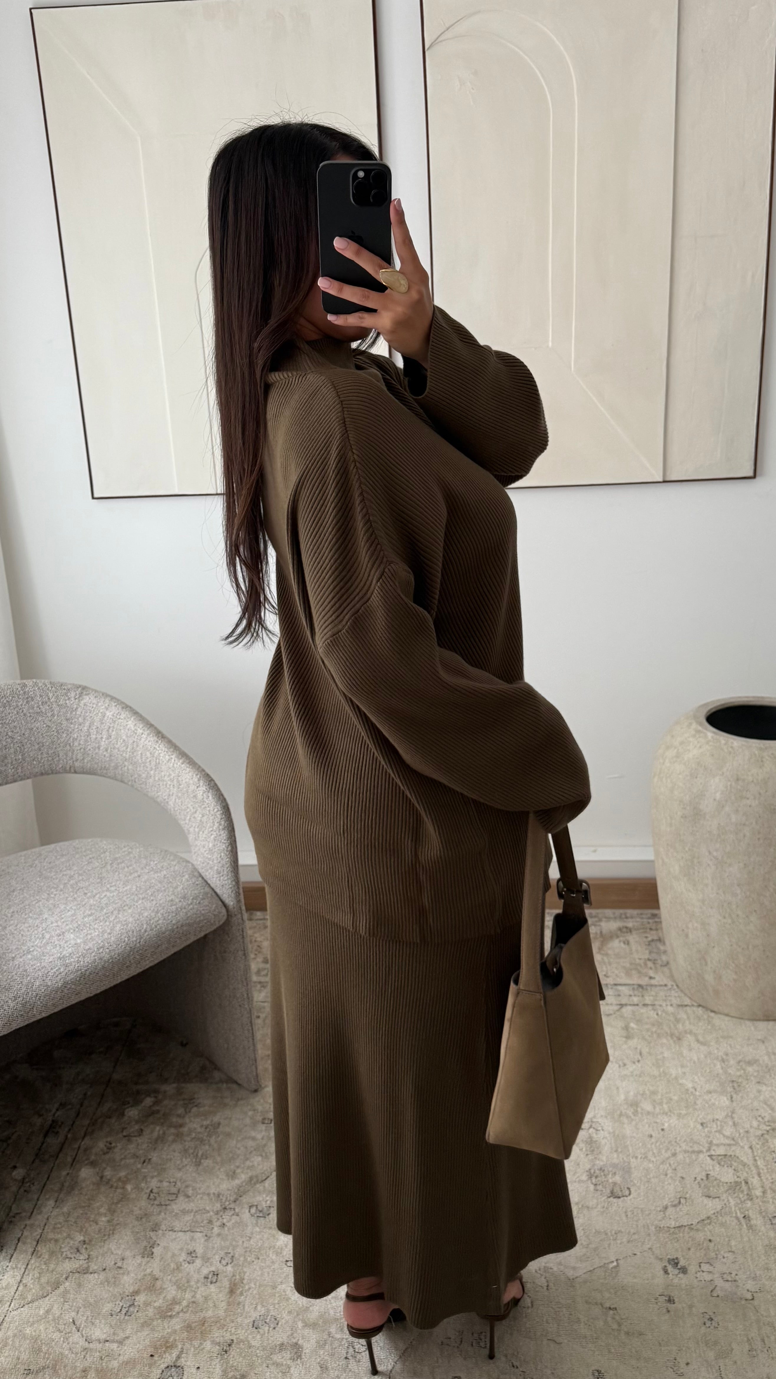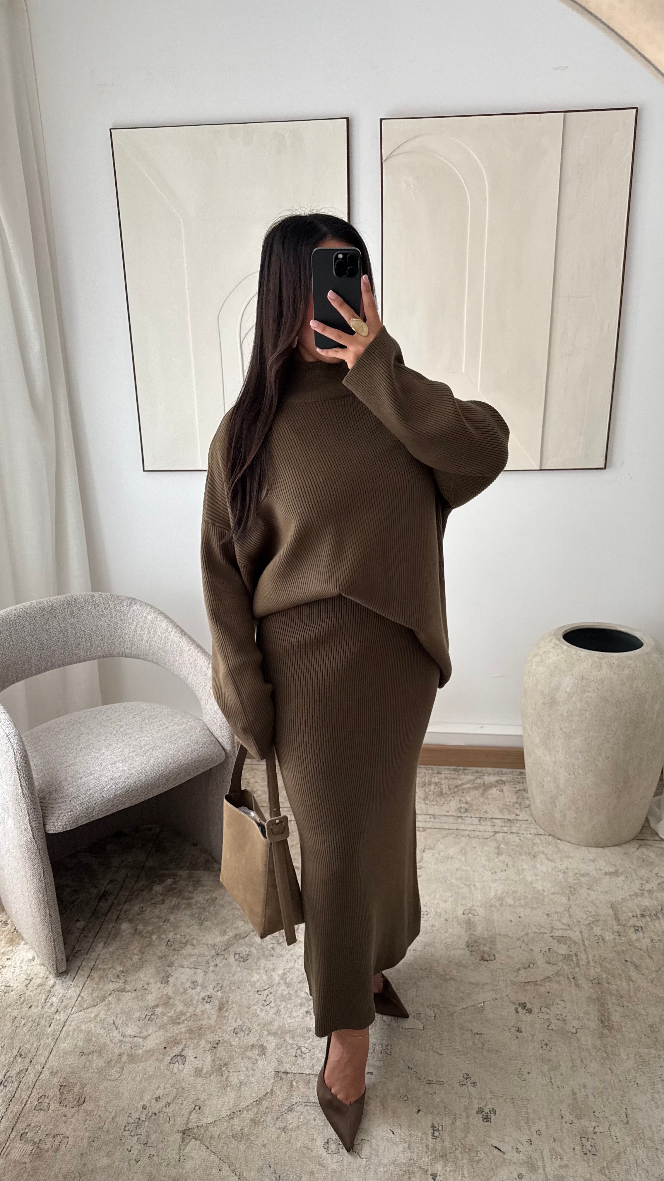 Élégant et confortable, cet ensemble deux pièces est conçu pour les femmes à la recherche d’un style à la fois raffiné et pudique. Le haut à col montant, d'une belle longueur (67 cm), se distingue par sa coupe droite et sa matière douce et fluide. La jupe assortie, longue de 94 cm, épouse délicatement les courbes sans les mouler, pour une silhouette allongée et harmonieuse. Un ensemble facile à porter, parfait pour le quotidien comme pour des occasions plus habillées.