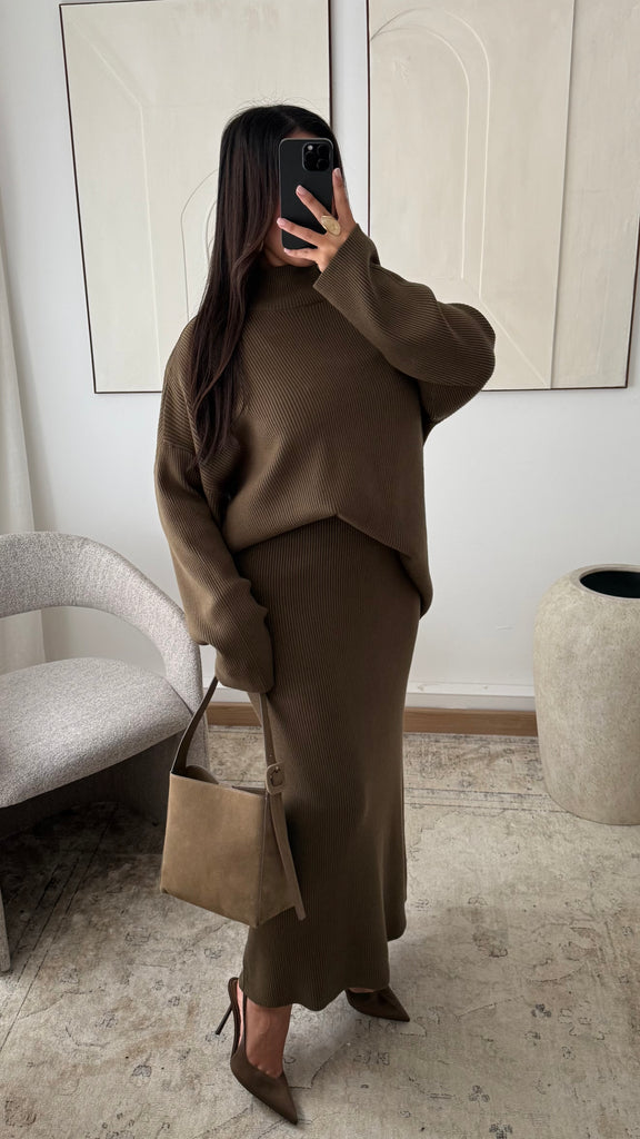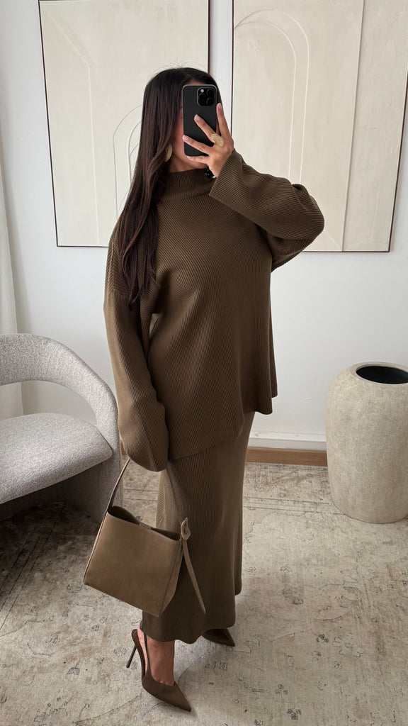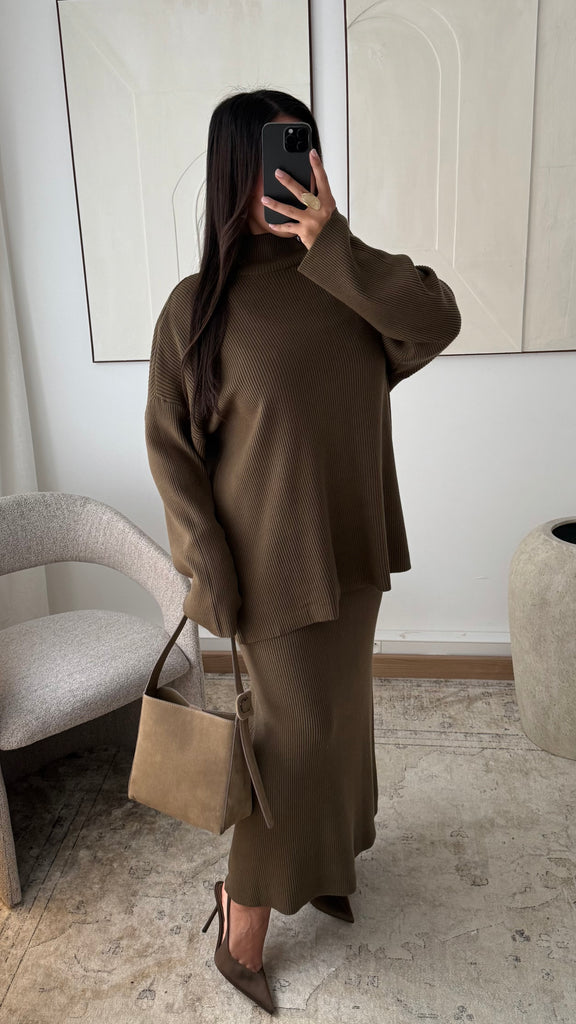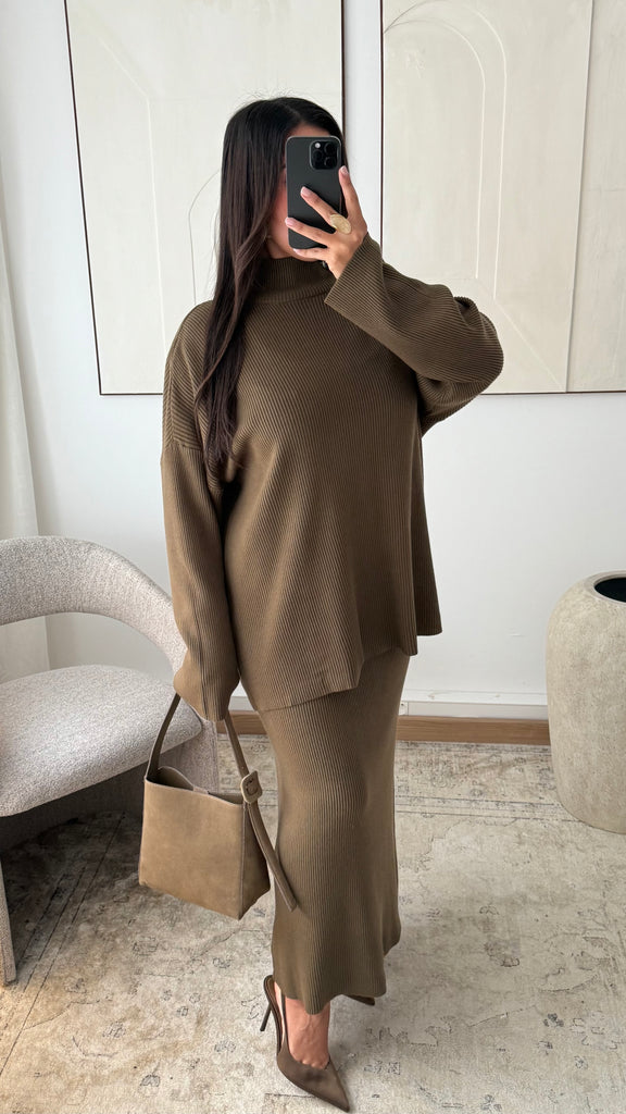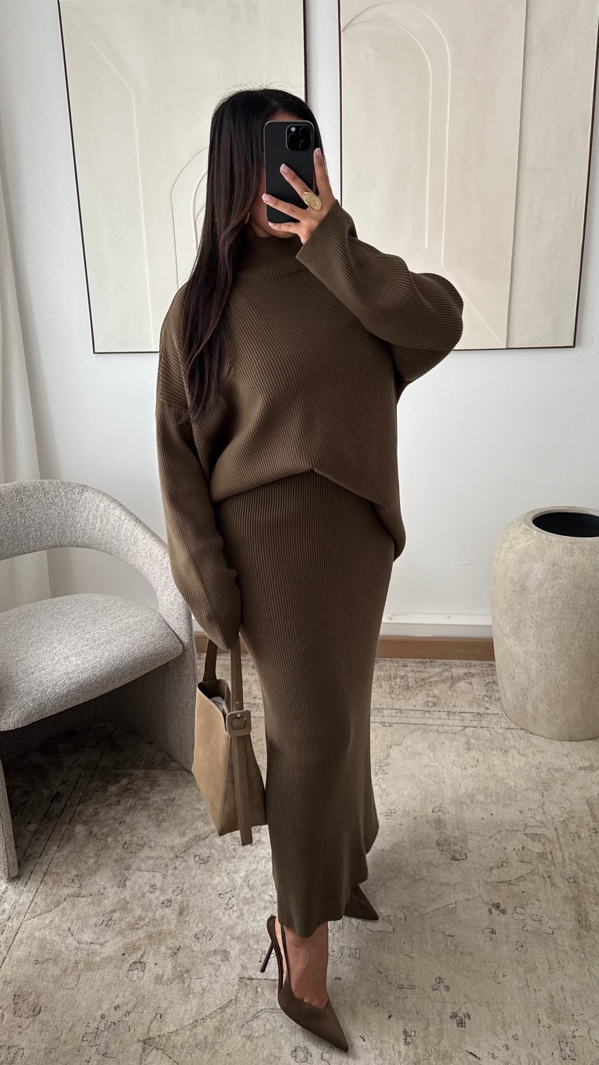 Élégant et confortable, cet ensemble deux pièces est conçu pour les femmes à la recherche d’un style à la fois raffiné et pudique. Le haut à col montant, d'une belle longueur (67 cm), se distingue par sa coupe droite et sa matière douce et fluide. La jupe assortie, longue de 94 cm, épouse délicatement les courbes sans les mouler, pour une silhouette allongée et harmonieuse. Un ensemble facile à porter, parfait pour le quotidien comme pour des occasions plus habillées.