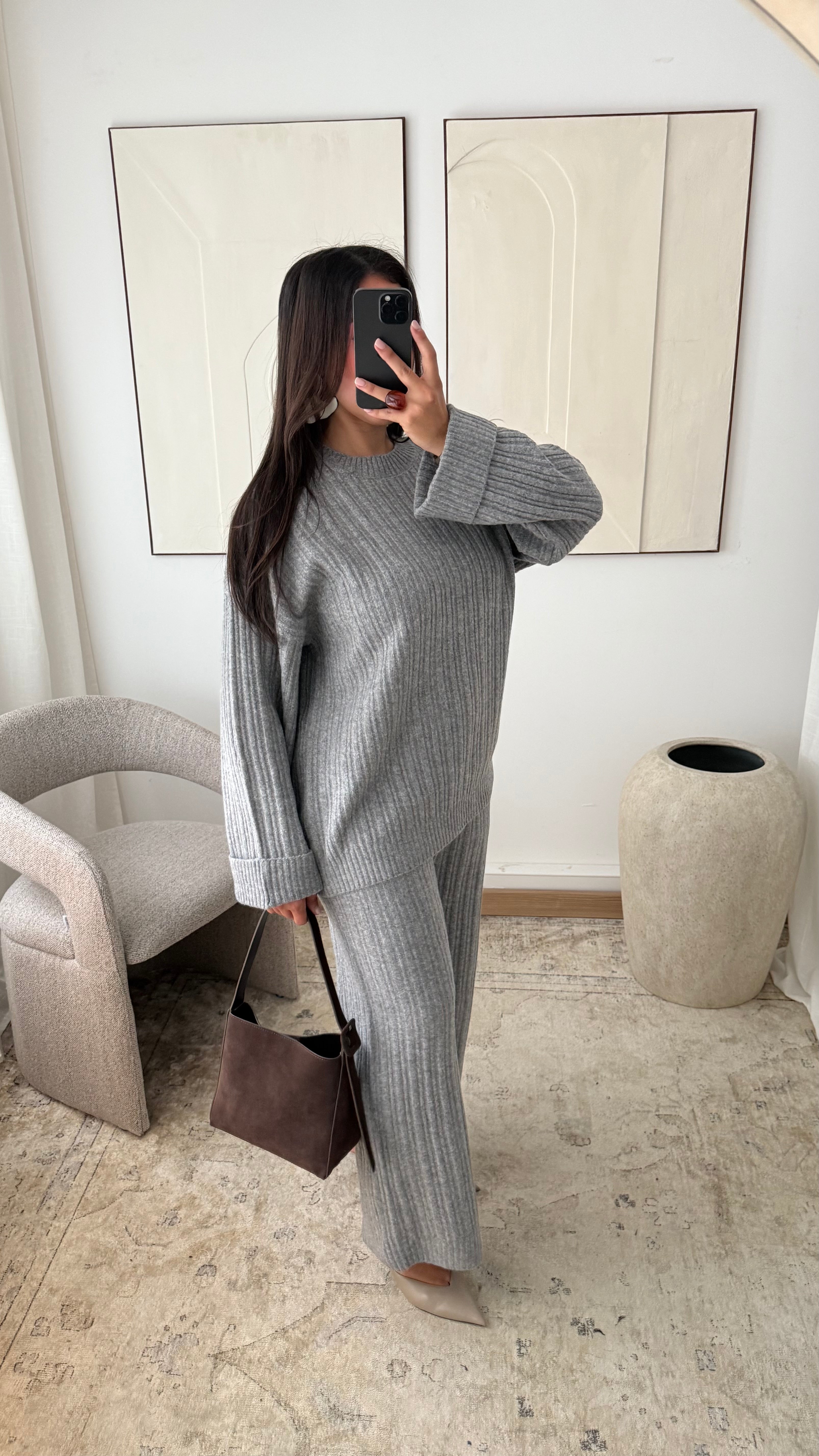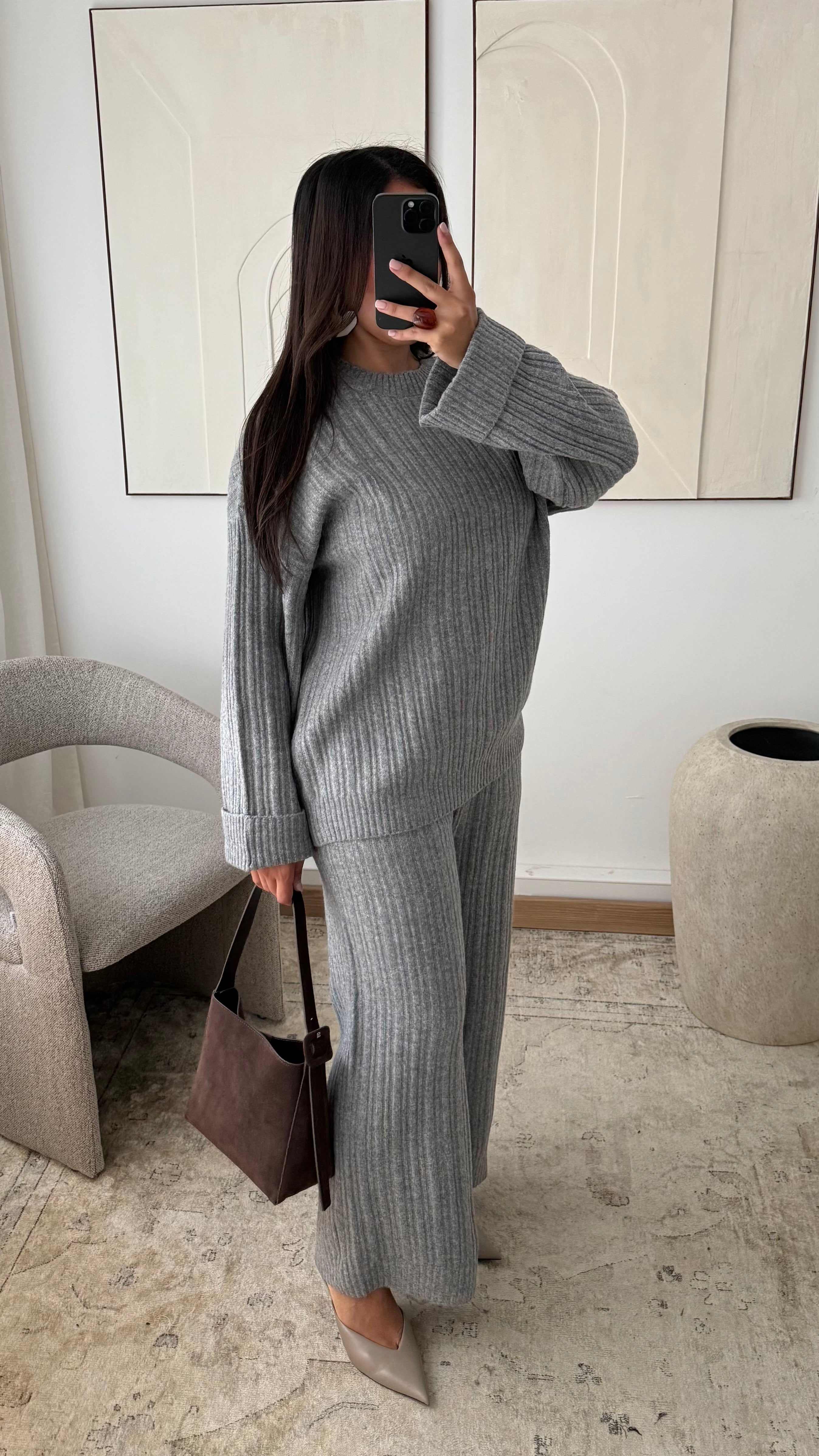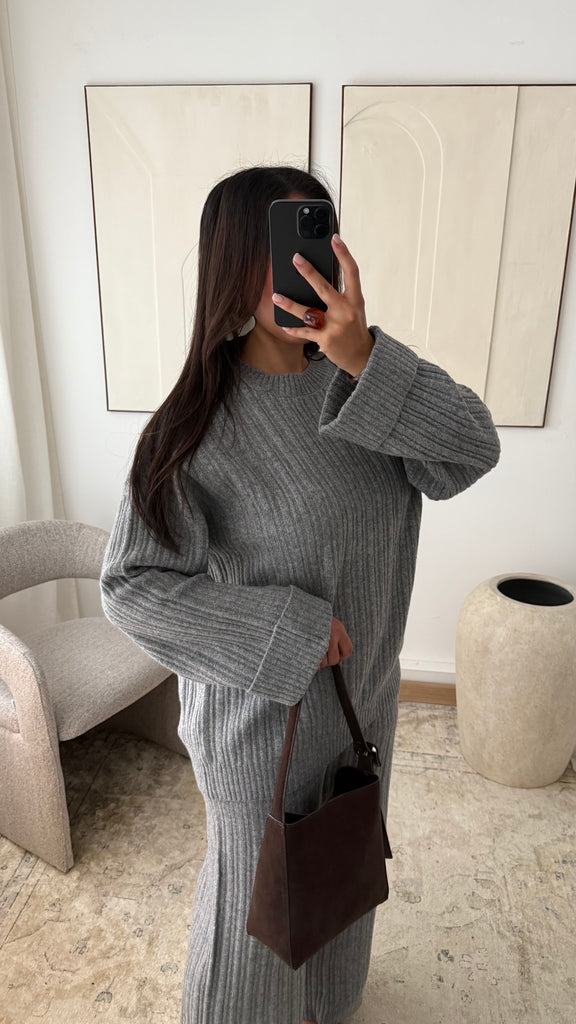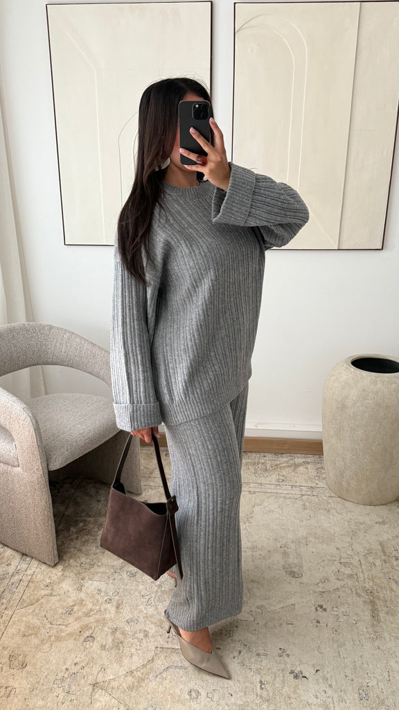 Cet ensemble en maille côtelée incarne l'équilibre parfait entre confort et élégance. Composé d’un pull ample à la coupe droite et d’un pantalon assorti à taille élastiquée, il offre une tenue chaleureuse et agréable à porter au quotidien. Sa matière douce, enrichie en laine mérinos, apporte une touche de chaleur tout en conservant un tombé fluide et structuré. Une silhouette minimaliste, pensée pour les femmes en quête de style et de pudeur.