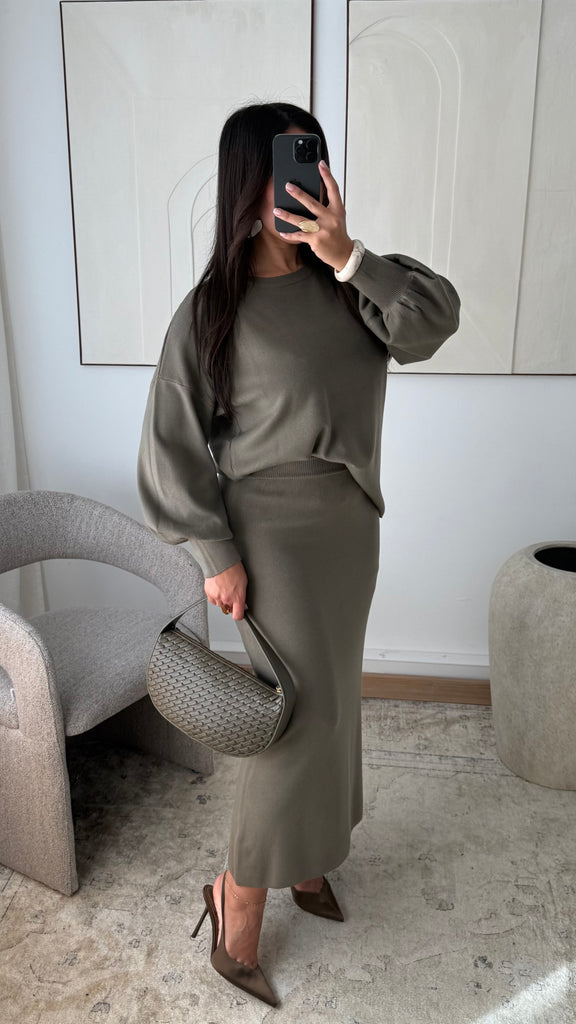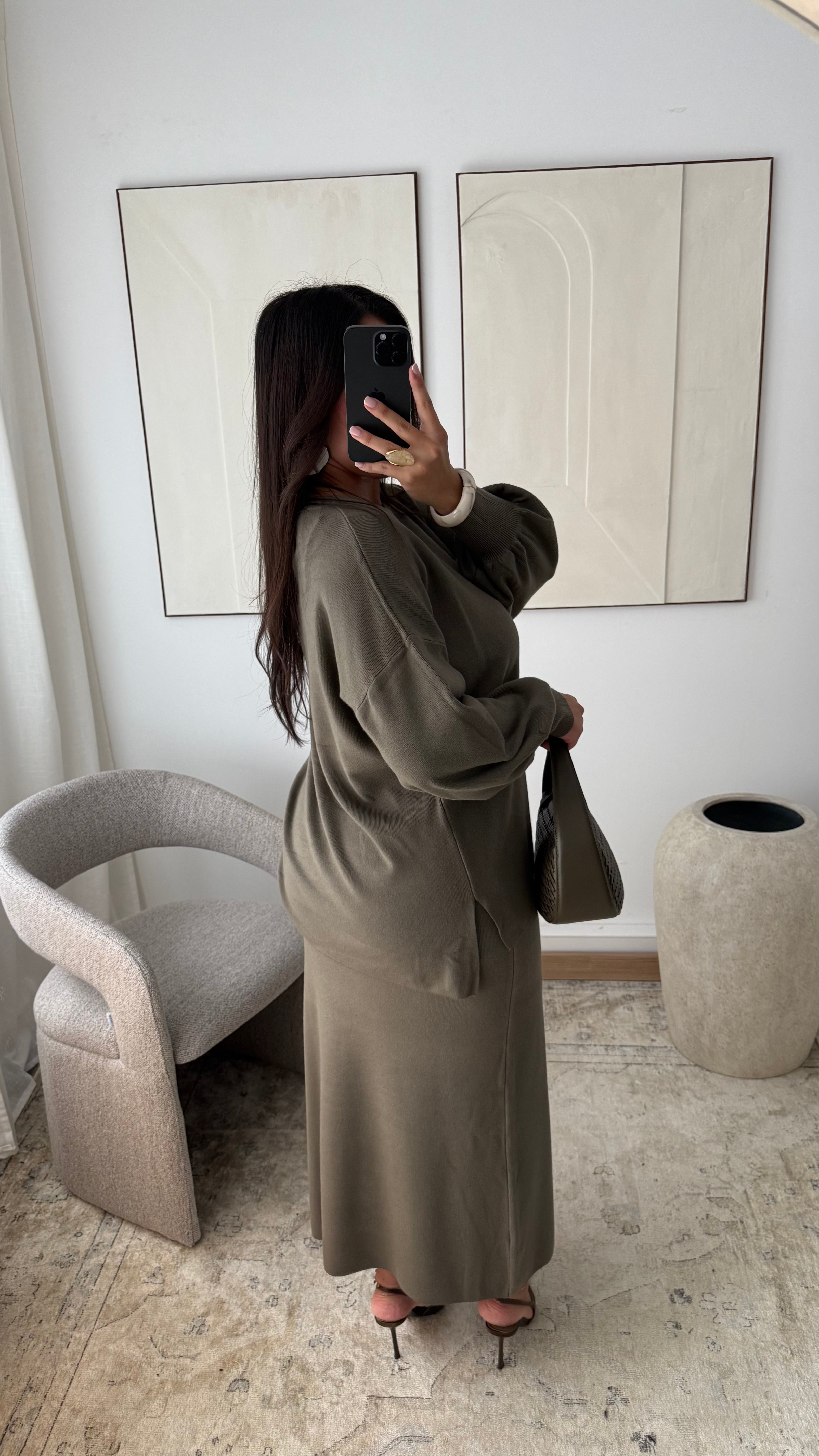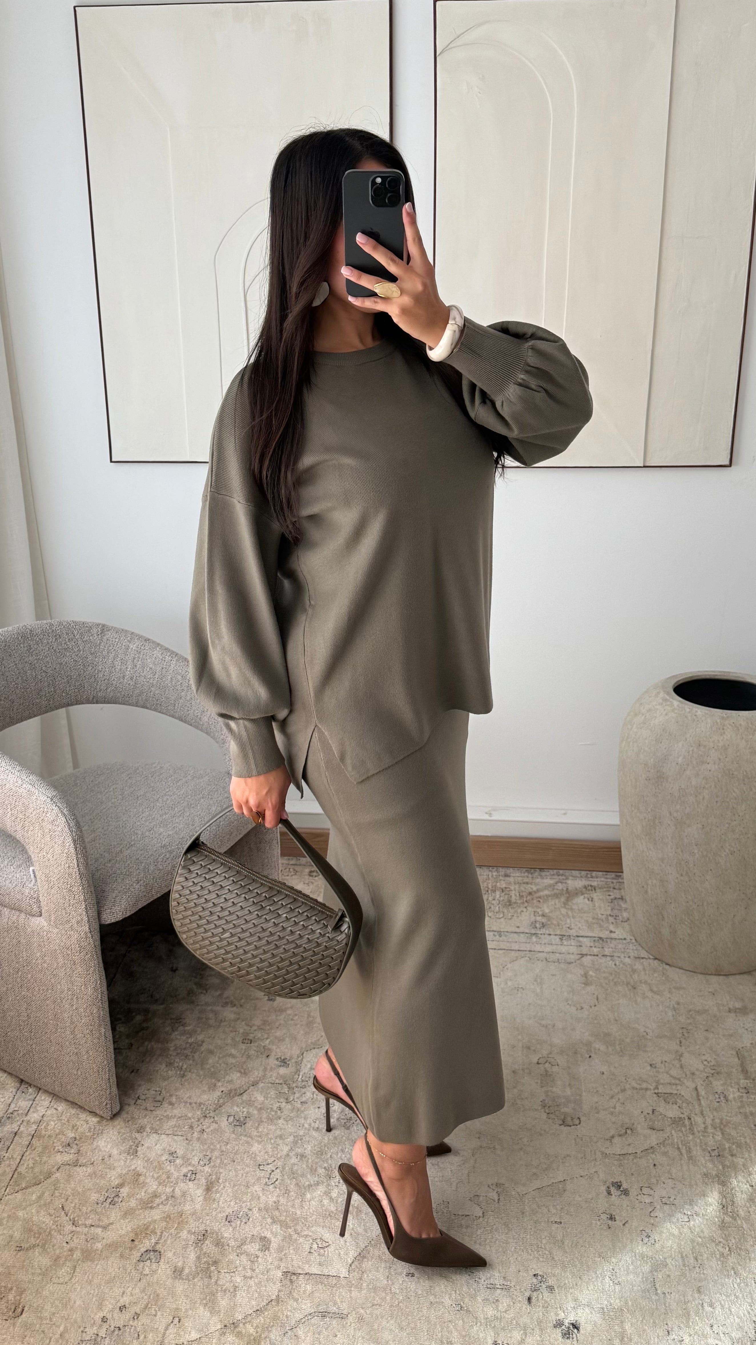 Cet ensemble en maille fine offre un équilibre parfait entre confort et élégance. Le pull à manches longues, resserrées aux poignets, structure joliment la silhouette tout en restant fluide. La jupe assortie, à la coupe droite et taille élastiquée, complète une tenue sobre et facile à porter au quotidien.
