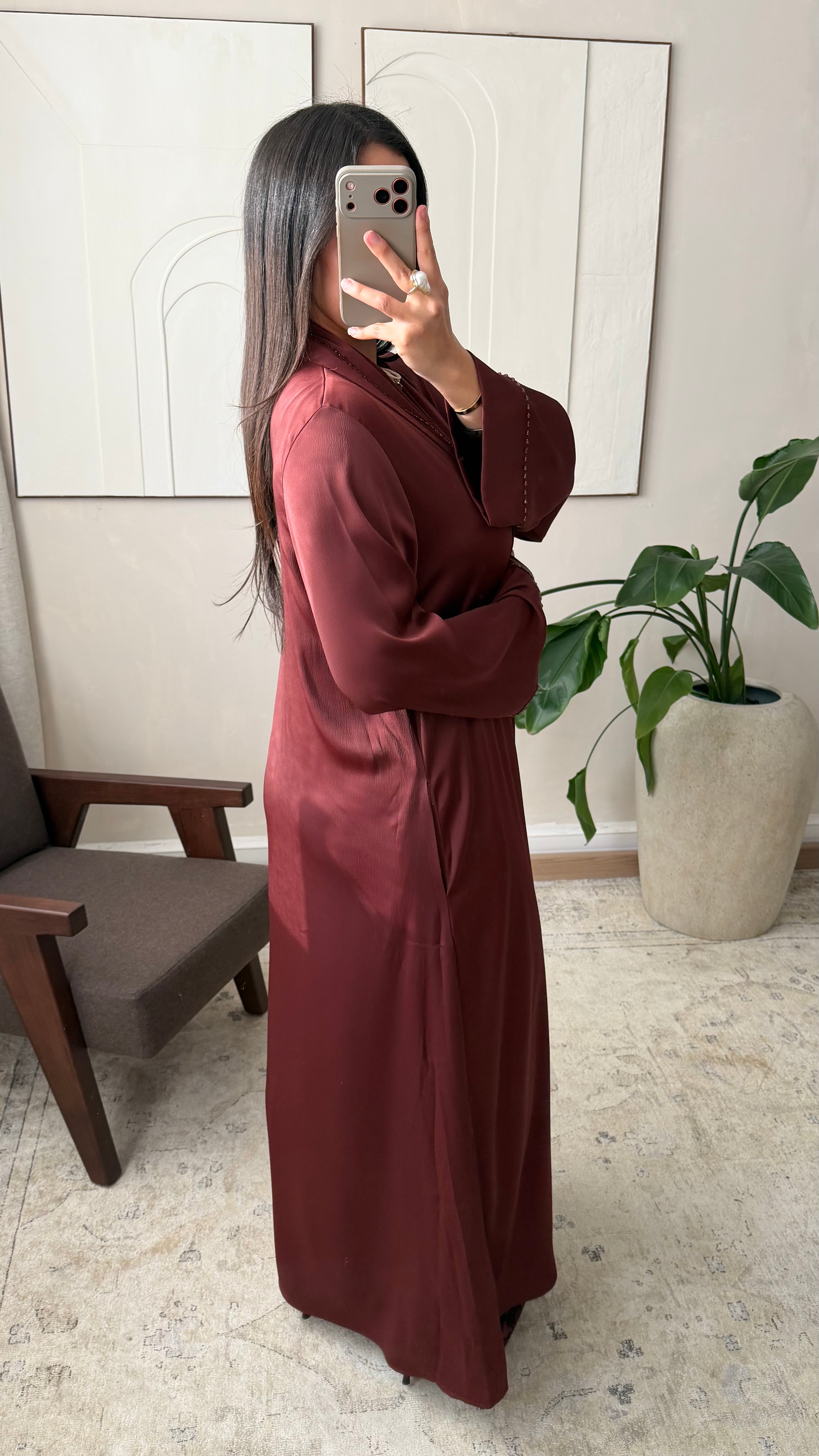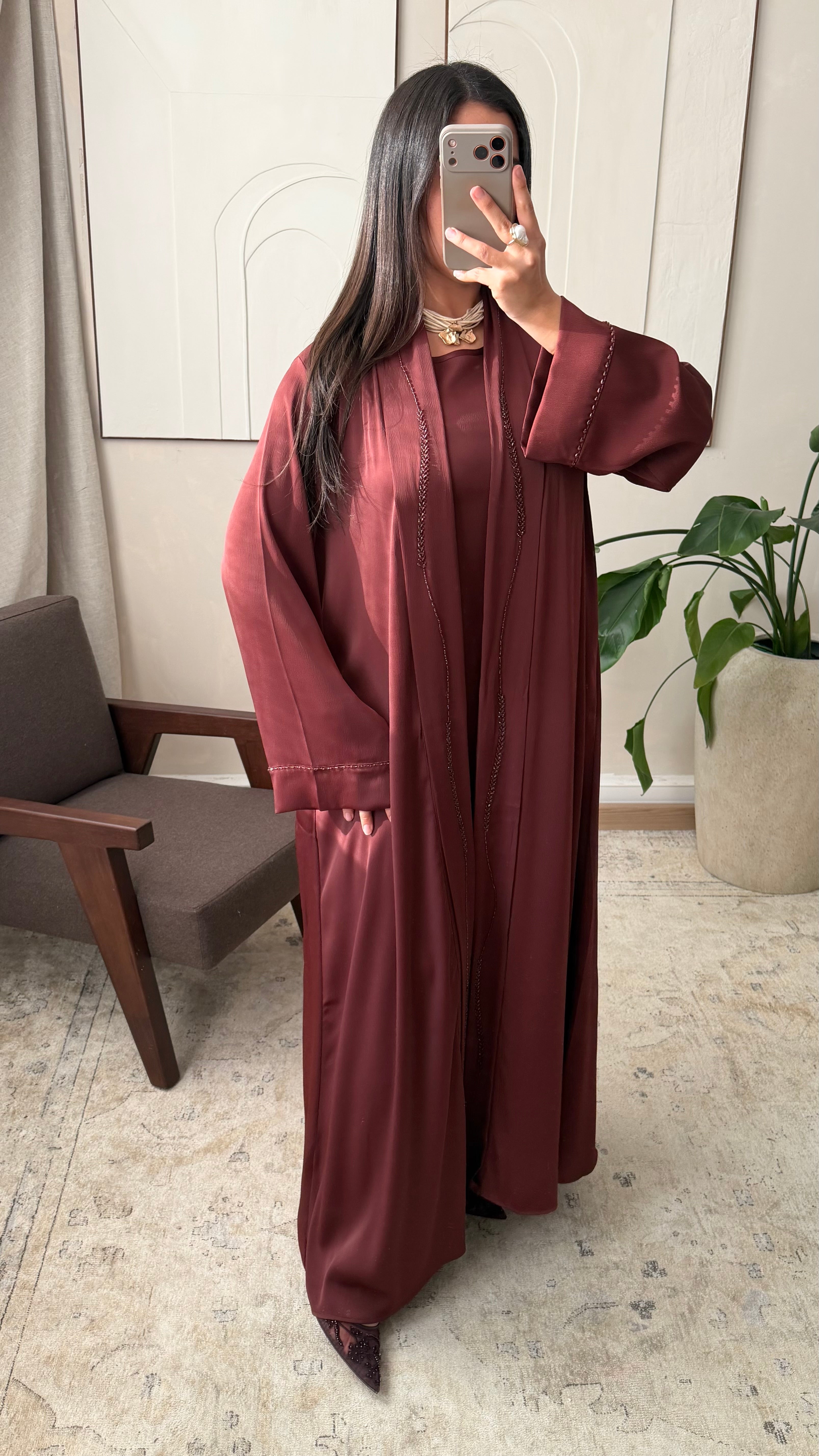 Cette abaya deux pièces élégante, composée d’une robe longue et d’un gilet assorti, séduit par ses détails subtils de strass qui apportent un éclat délicat sans surcharger la tenue. La robe offre une coupe harmonieuse qui sublime la silhouette, tandis que le gilet apporte une touche raffinée et moderne à l’ensemble.