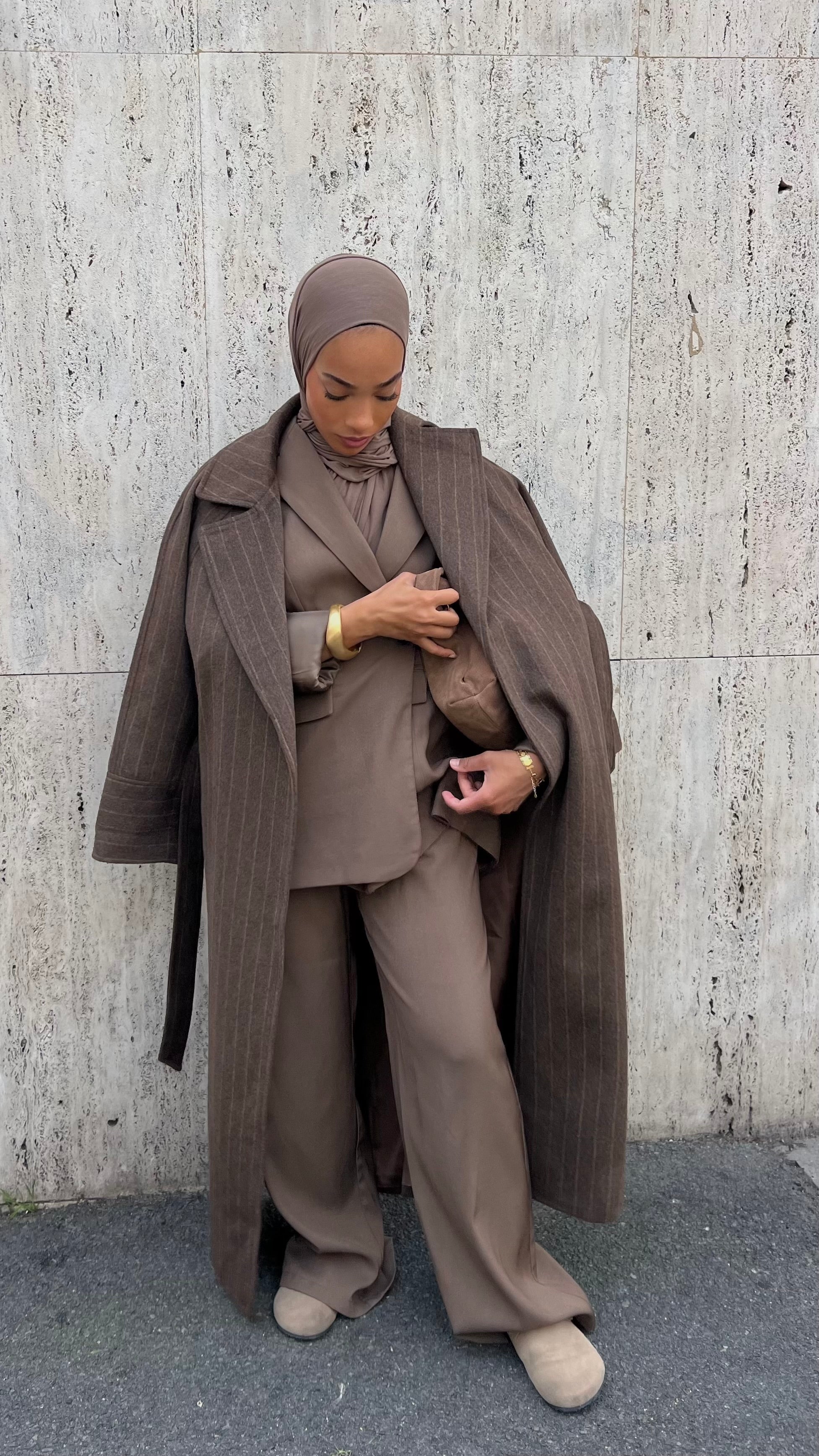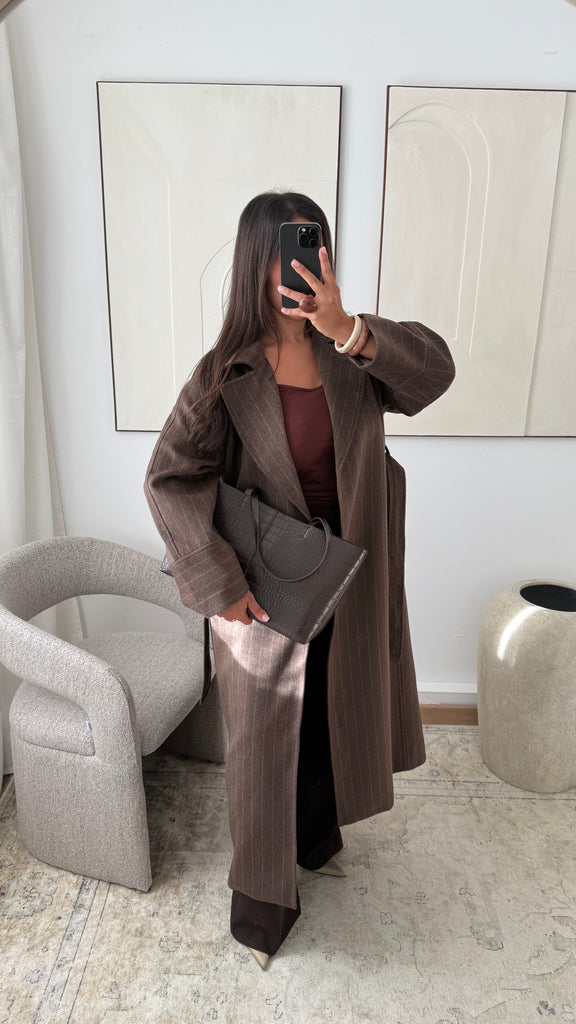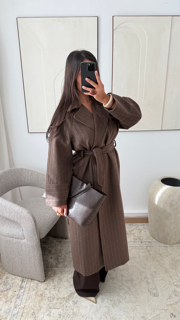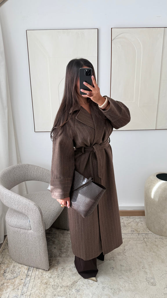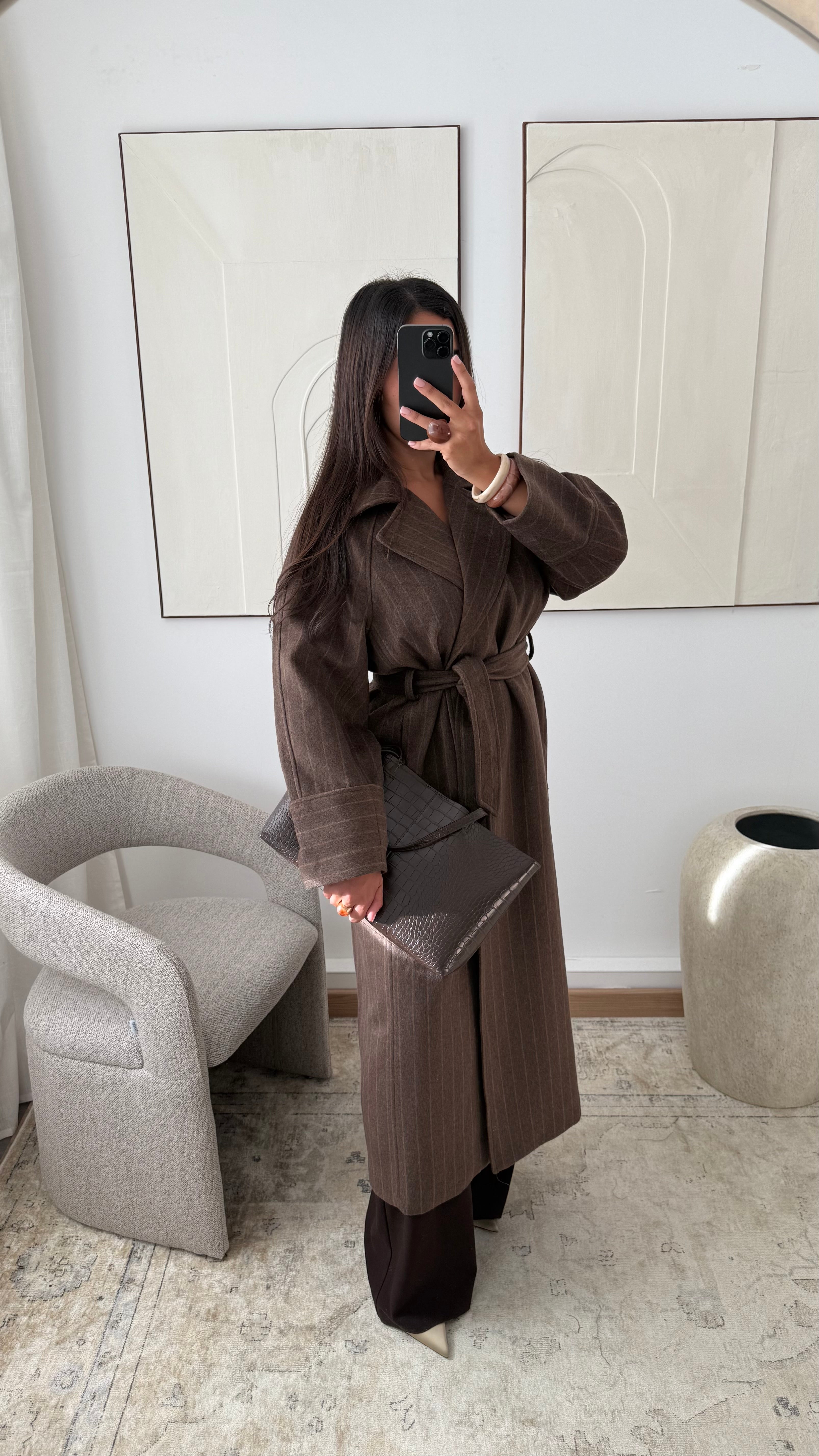 Manteau en laine véritable long à rayures LE TIMELESS I Chocolat