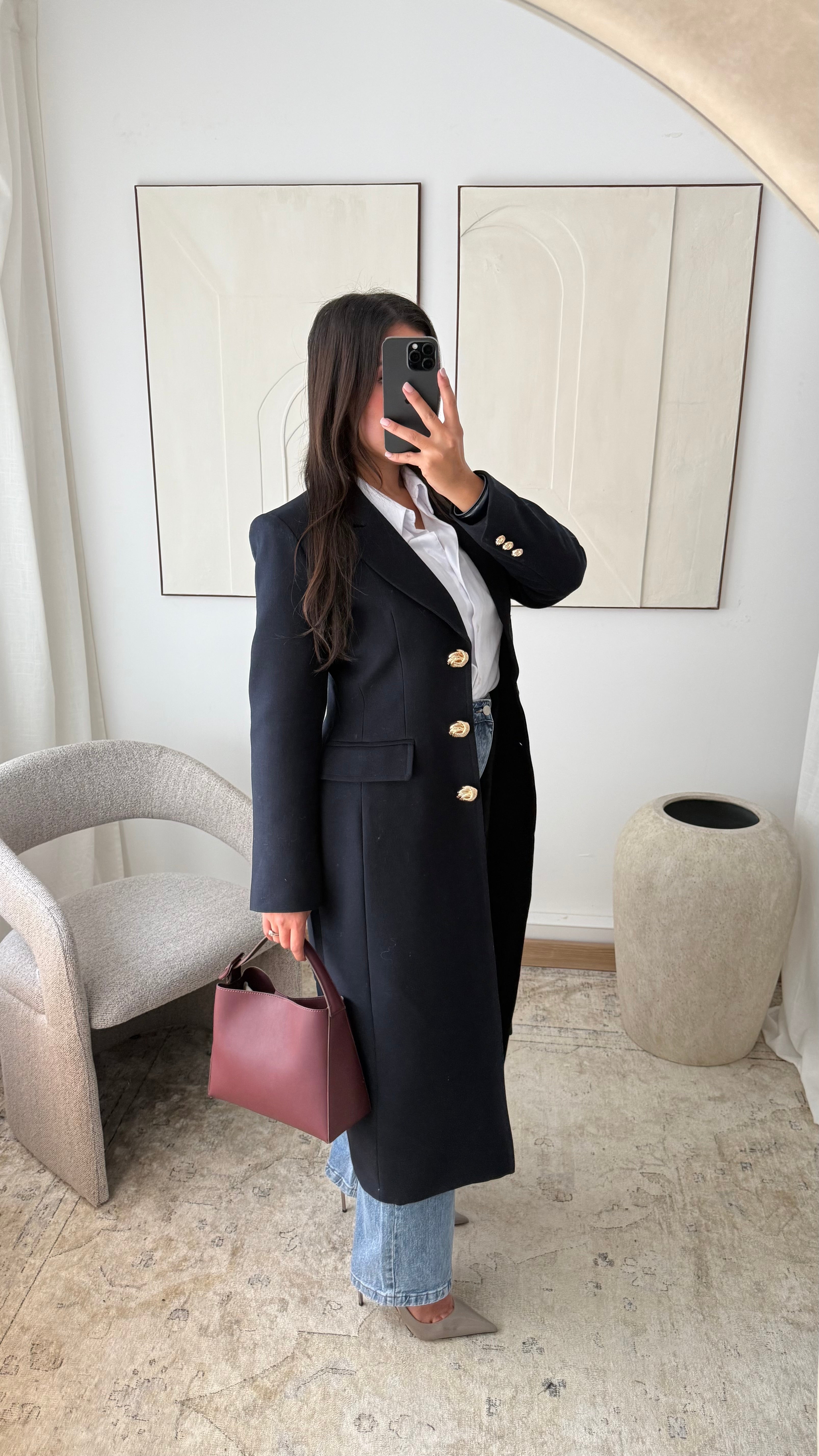 Manteau long légèrement cintré, orné de boutons dorés élégants. Sa coupe féminine structure la silhouette tout en offrant un confort optimal pour la saison. Une pièce chic et intemporelle à intégrer dans votre dressing automnal.
