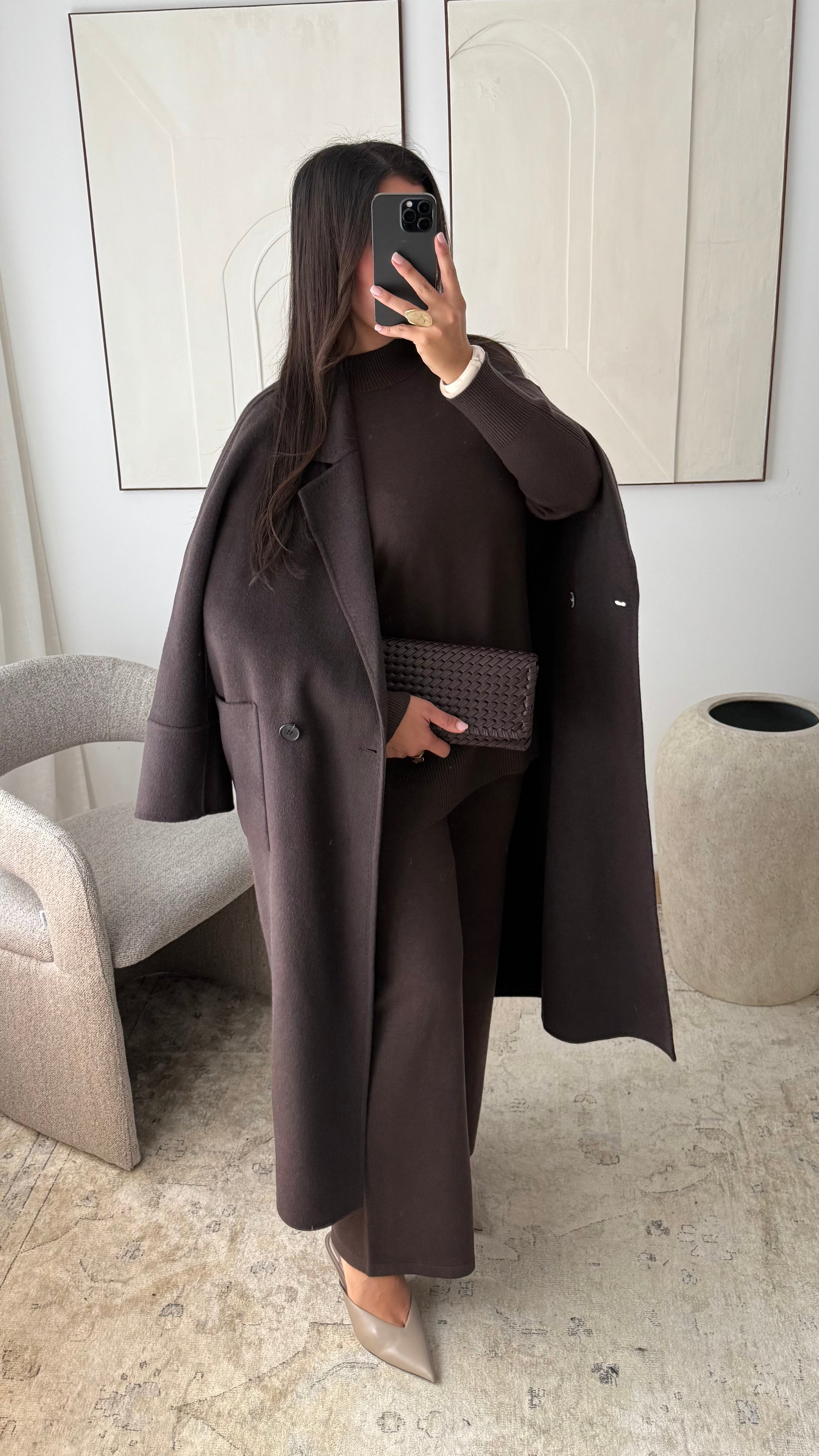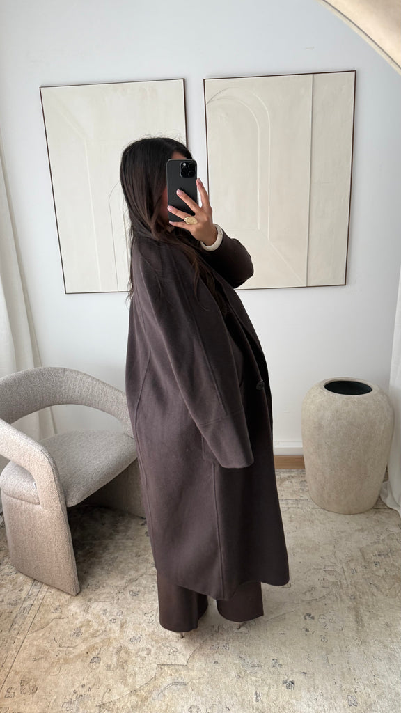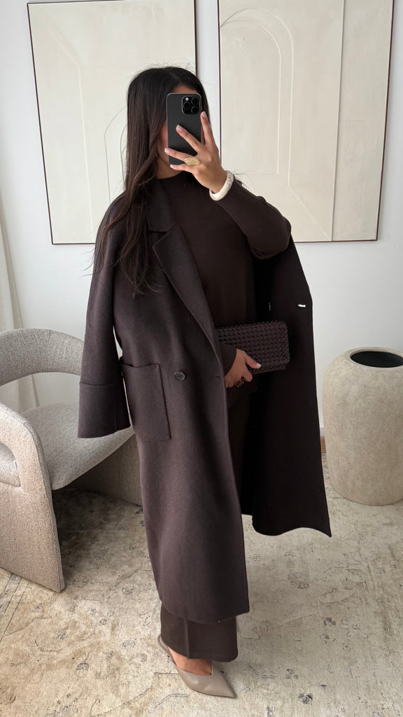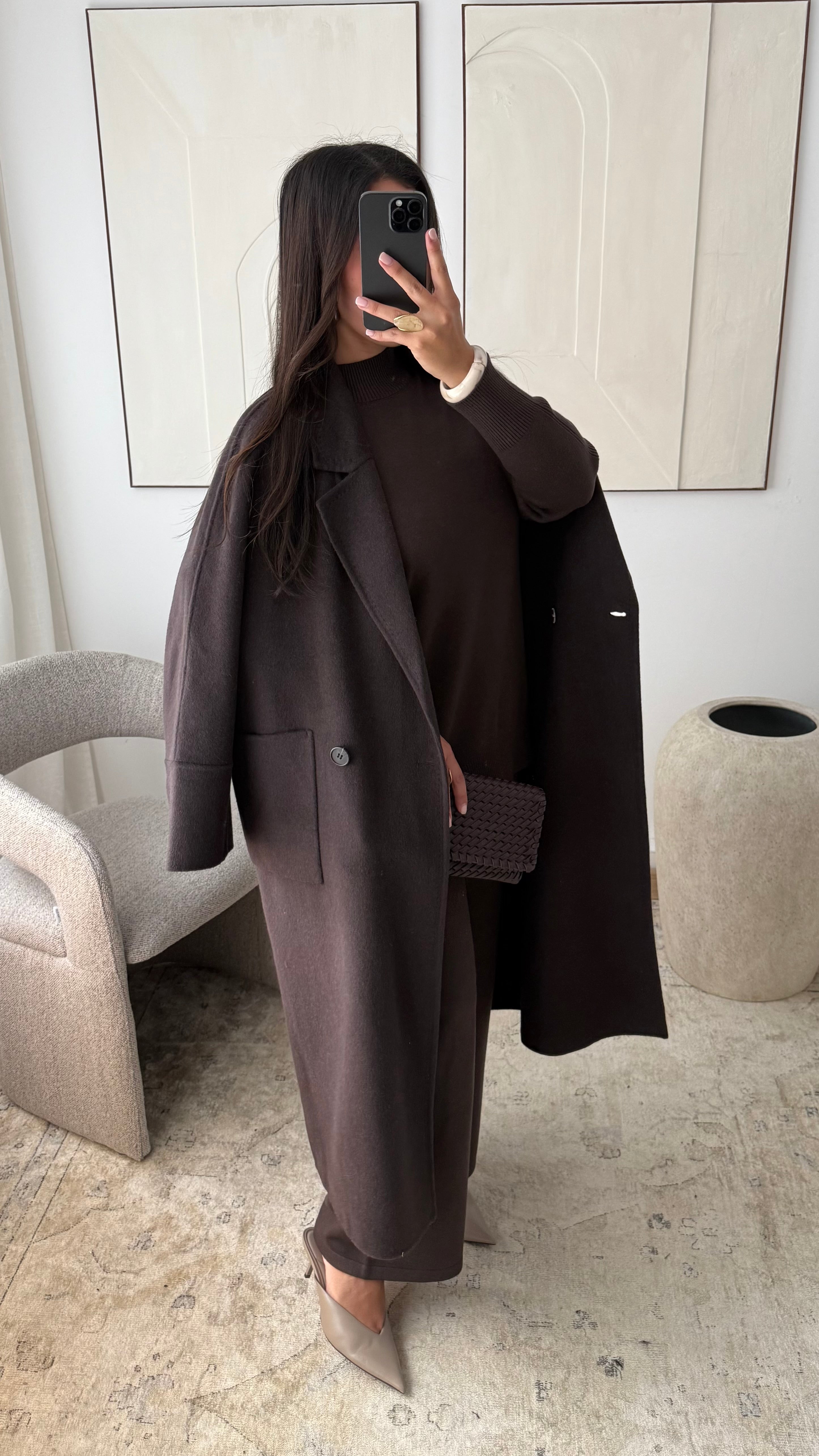 Manteau long à la coupe croisée, fermé par deux boutons à l’avant. Confectionné dans un mélange riche en laine, il offre chaleur et tenue tout en élégance. Sa coupe structurée en fait une pièce intemporelle à porter saison après saison.