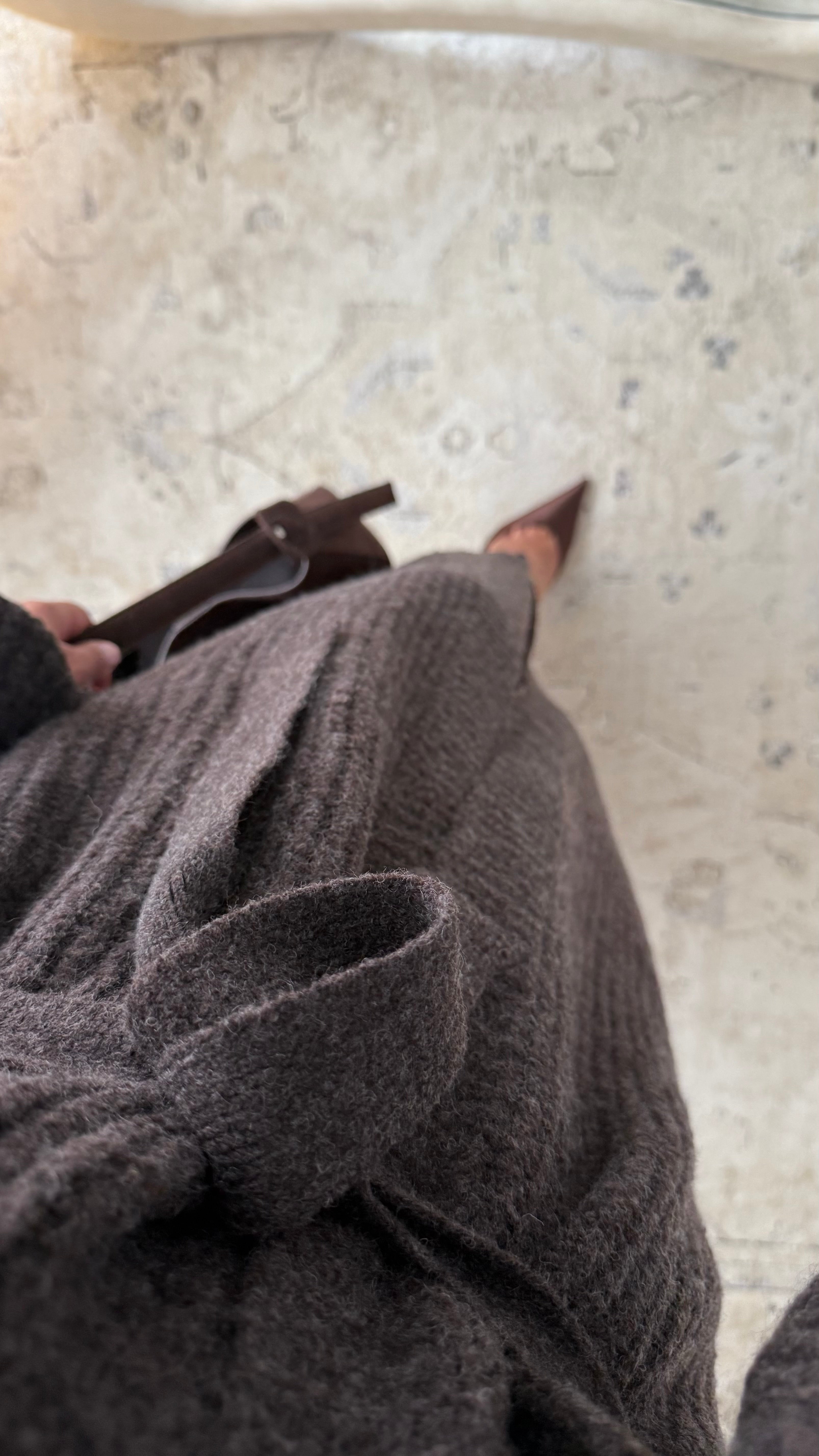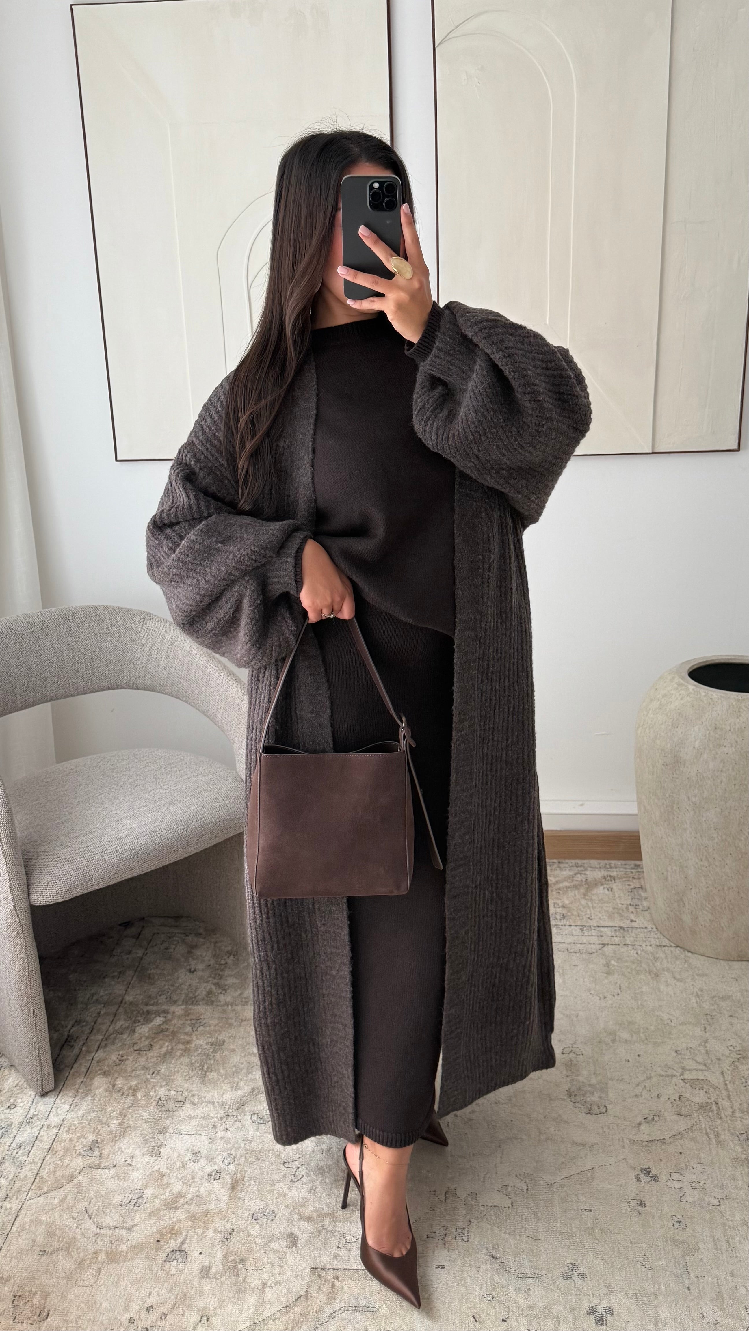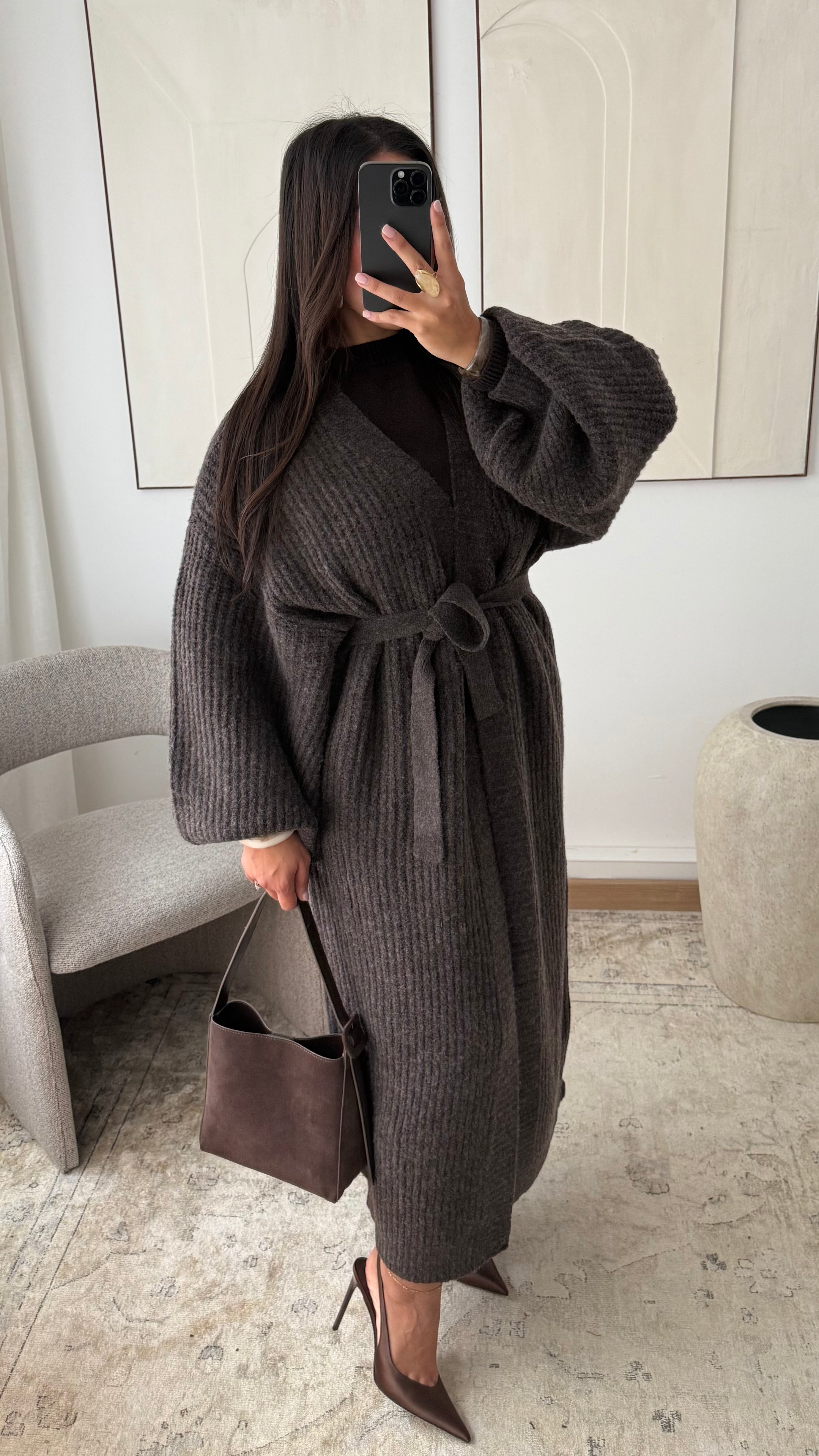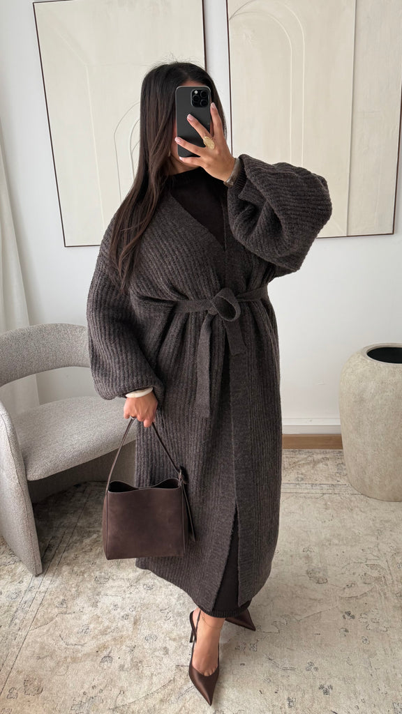 Cardigan long en maille douce avec ceinture à nouer, parfait pour ajouter une touche élégante et confortable à vos tenues. Sa coupe fluide et sa longueur couvrante en font une pièce idéale pour les looks modest fashion. Il peut se porter ouvert ou ceinturé pour structurer la silhouette.