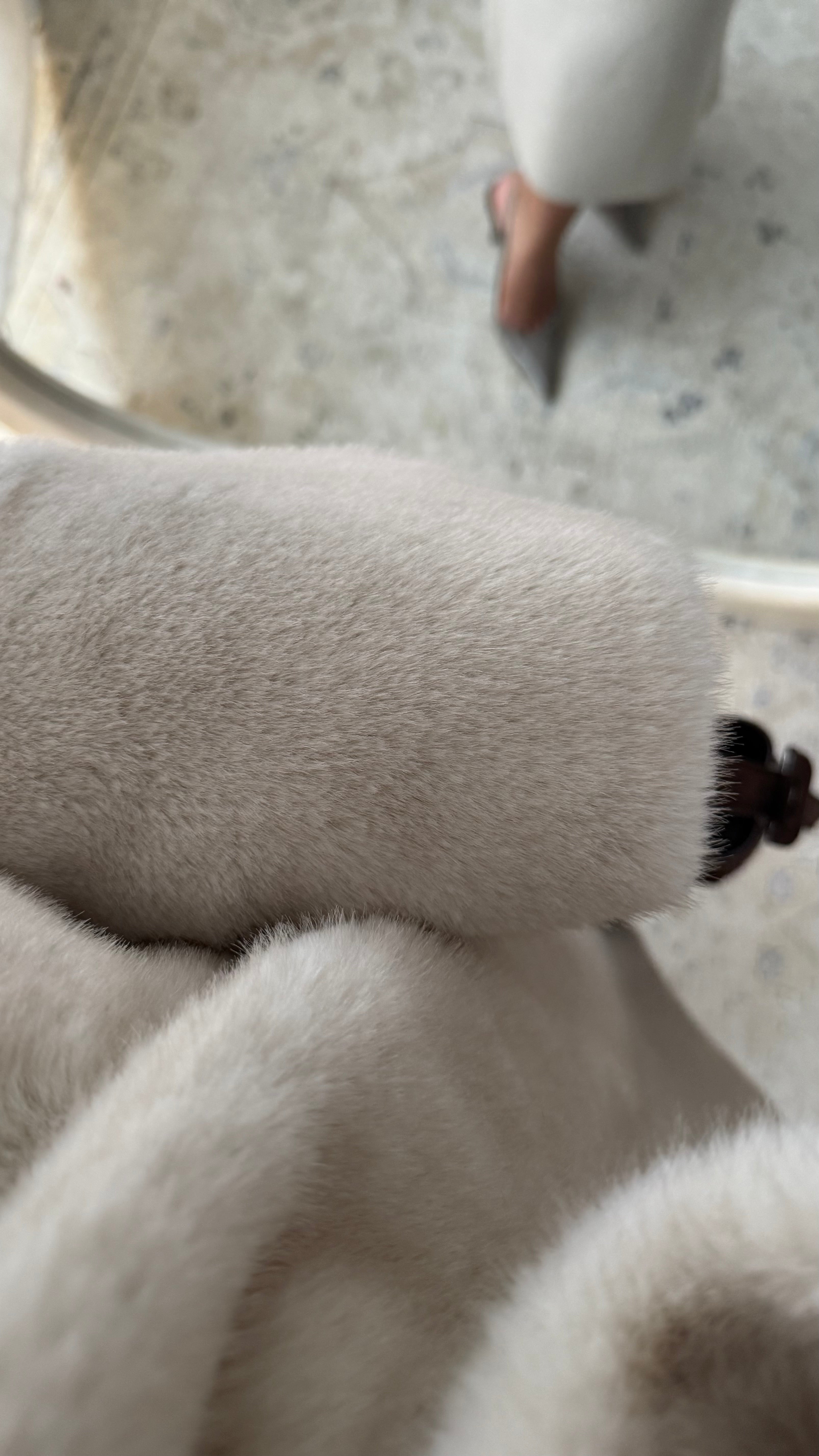 Veste mi-longue en fausse fourrure au coloris beige écru, douce et enveloppante. Conçue en 100% polyester, elle offre une chaleur confortable tout en apportant une touche chic et élégante à vos tenues. Une pièce cocooning et tendance pour affronter les journées froides avec style.