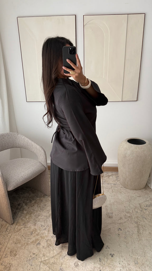 Un ensemble raffiné composé d’un top structuré à effet corset et d’une jupe longue fluide. Le top est ajusté, avec fermeture éclair au dos et liens à nouer façon corset pour souligner la taille avec élégance — attention, il taille petit. La jupe, en revanche, est ultra extensible à la taille et doublée pour un tombé fluide et agréable à porter. Idéal pour une occasion habillée.