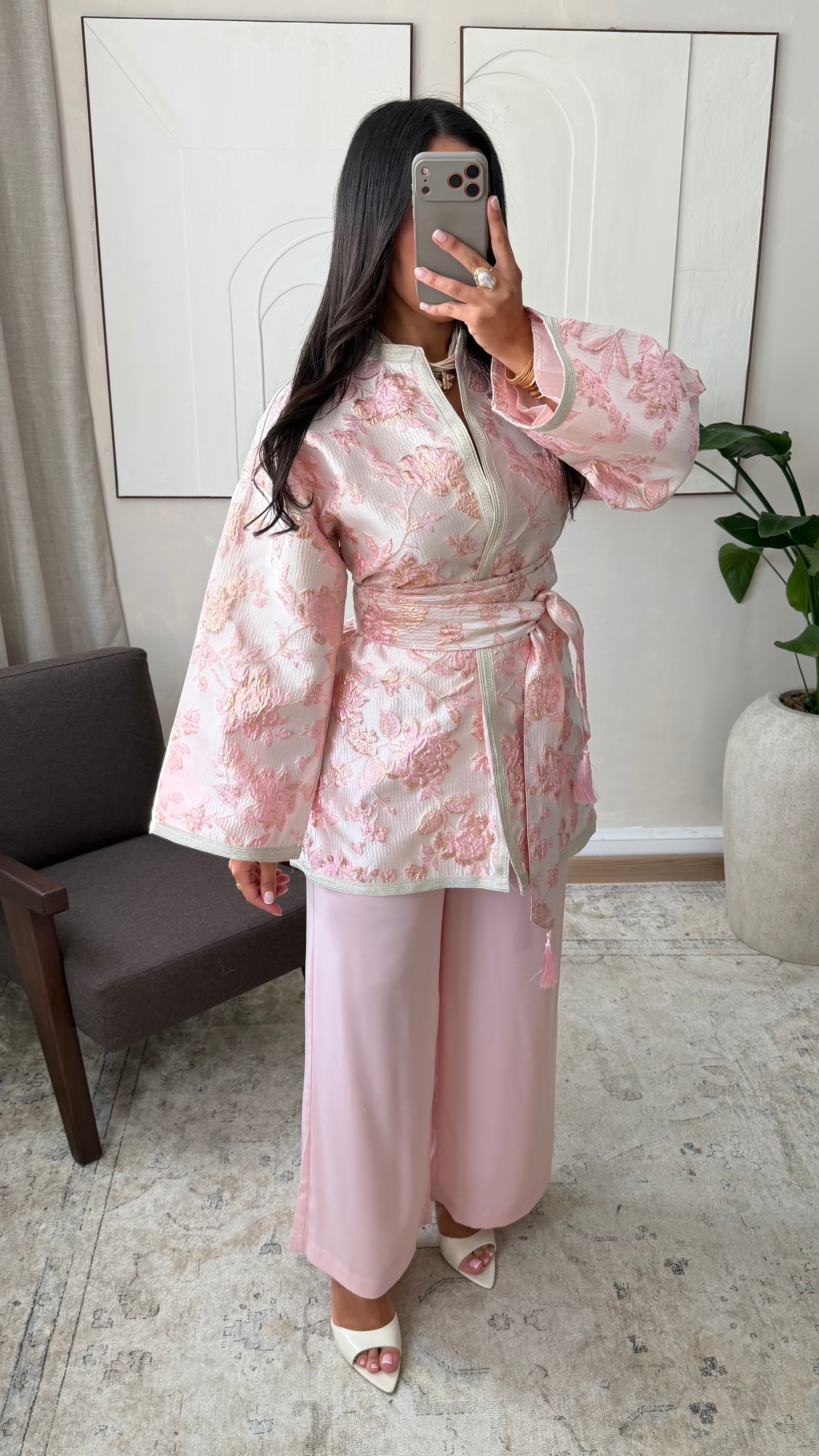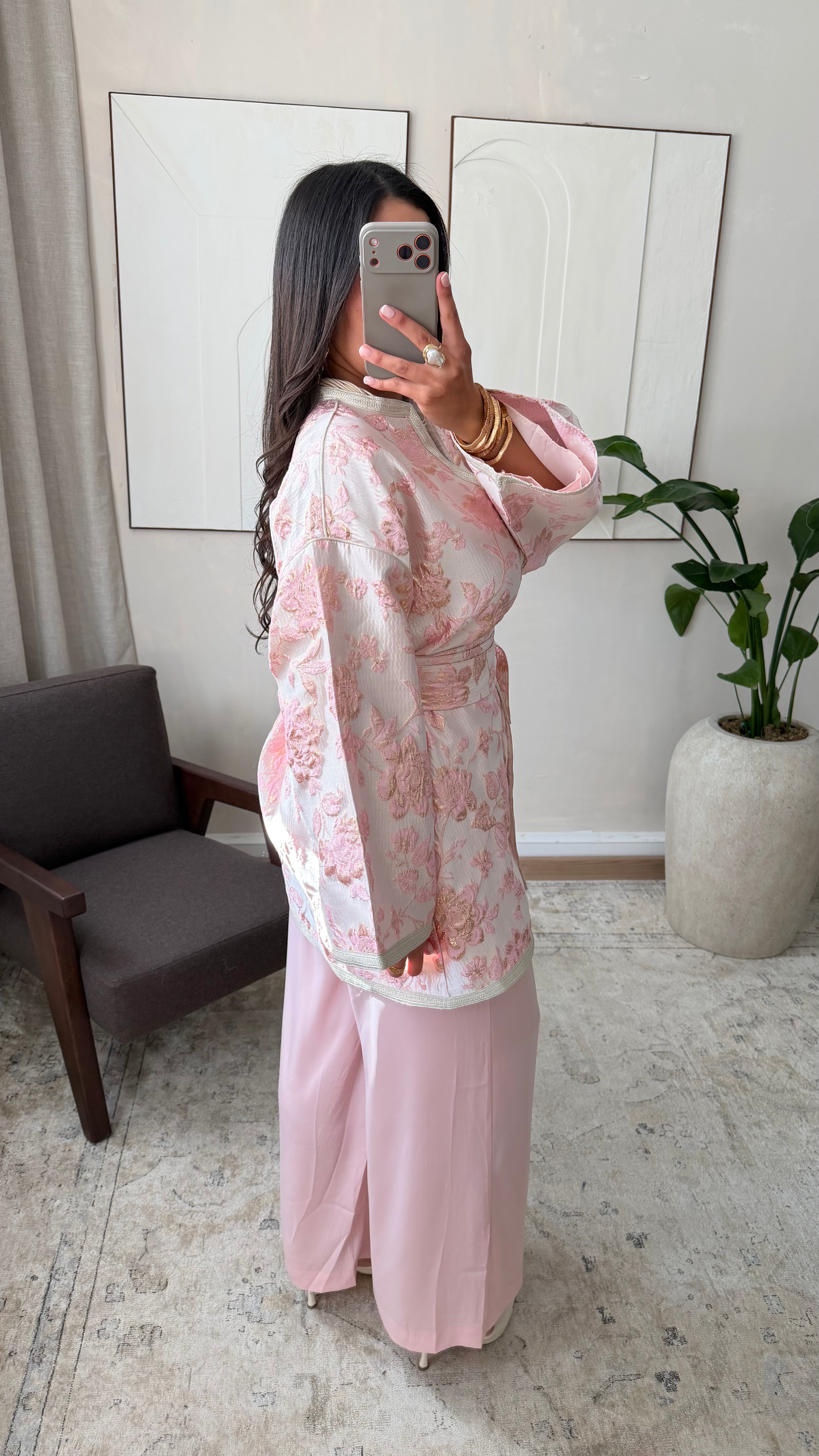 Idéal pour les cérémonies, fêtes traditionnelles ou événements élégants. Le contraste entre le haut structuré et le pantalon fluide crée une silhouette équilibrée et sophistiquée. À assortir avec des accessoires sobres et des chaussures élégantes pour un look traditionnel raffiné.