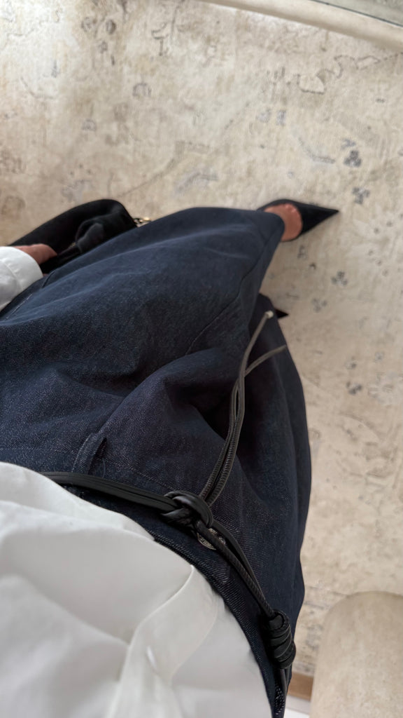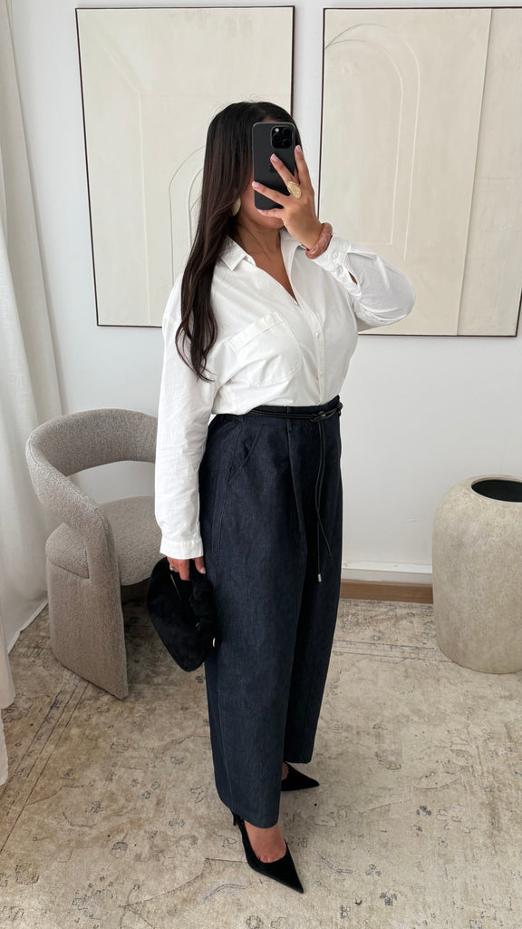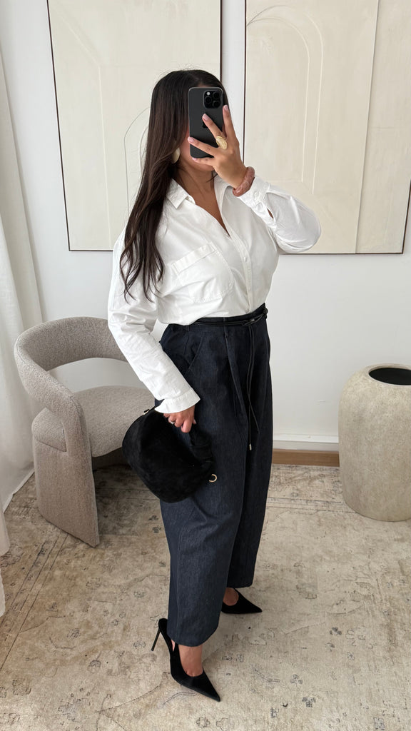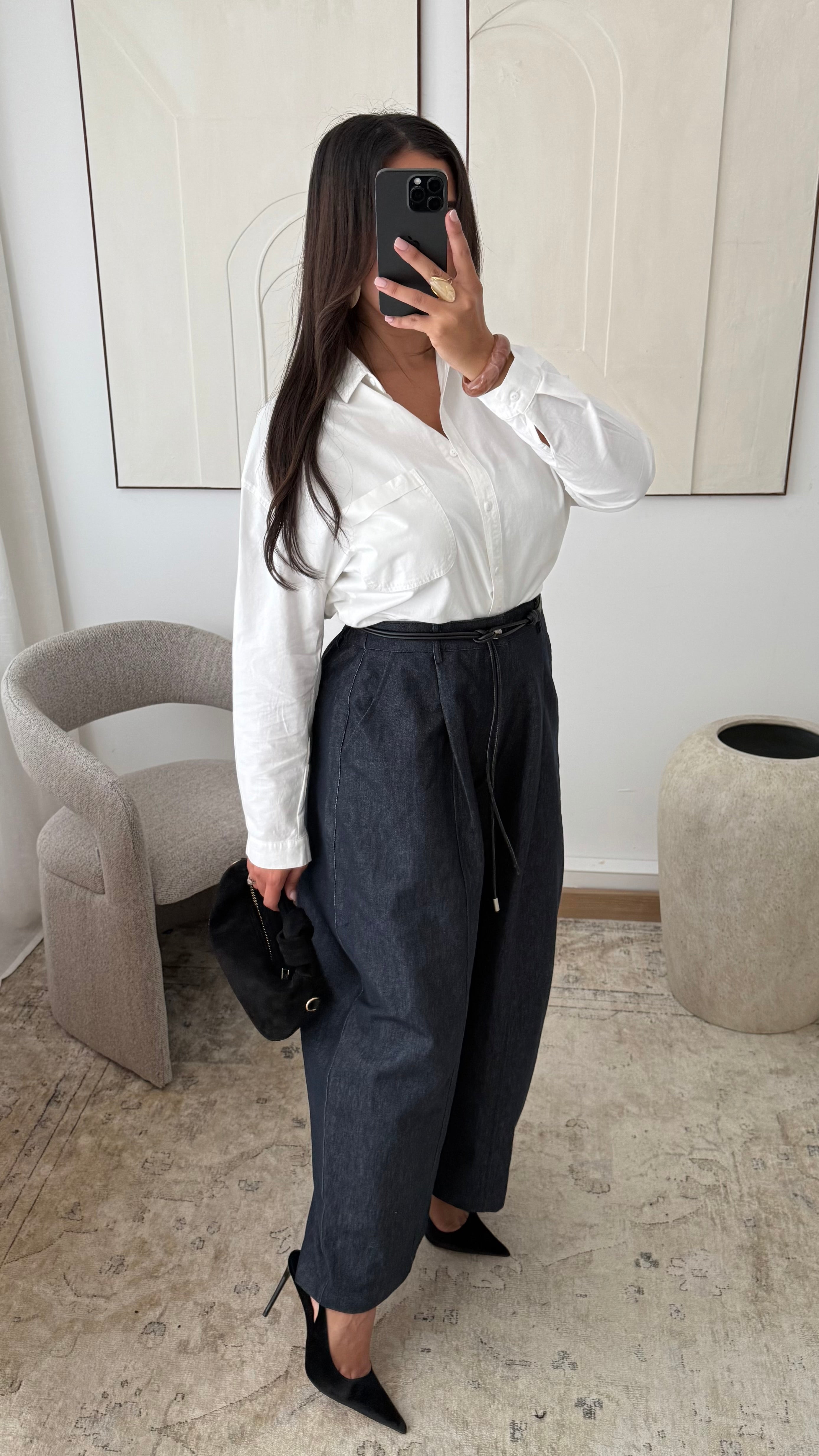 Ce pantalon bouffant en jean revisite un classique du dressing avec une touche moderne et confortable. Sa coupe ample et fluide apporte un volume structuré, parfait pour un look casual affirmé. Confectionné dans un denim doux et léger, il est doté d’une ceinture à nouer à la taille pour souligner la silhouette tout en offrant un confort optimal.