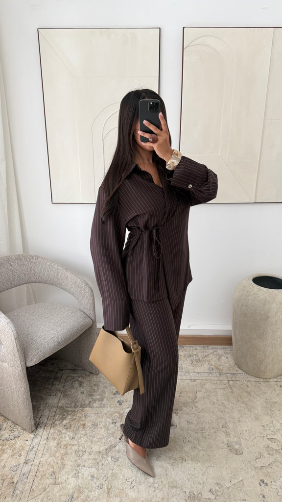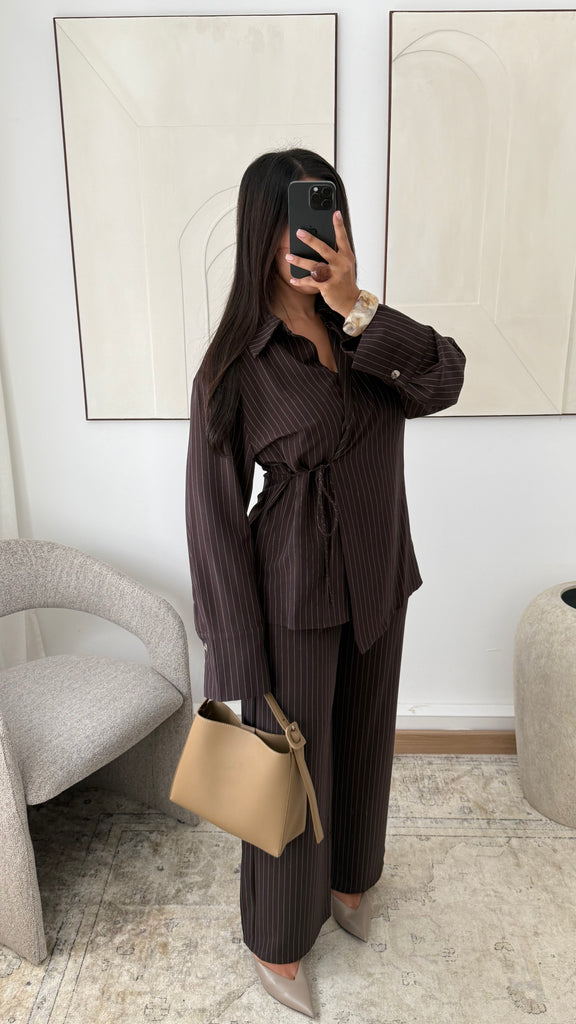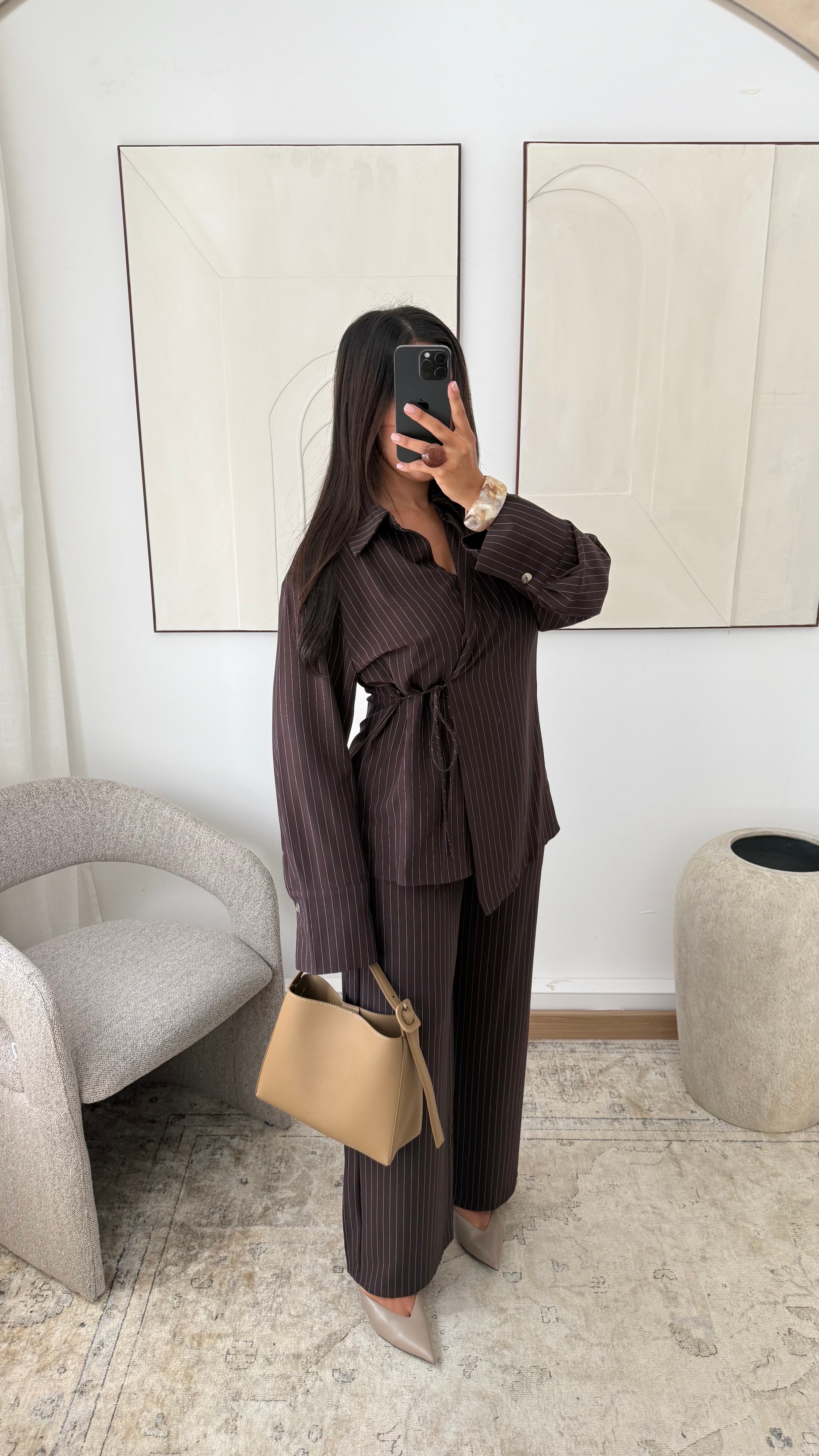 Pantalon fluide à rayures fines, à la taille structurée avec bouton et fermeture éclair. Léger, confortable et élégant, il forme un ensemble raffiné avec sa chemise, ou se porte seul pour un look sobre et chic.