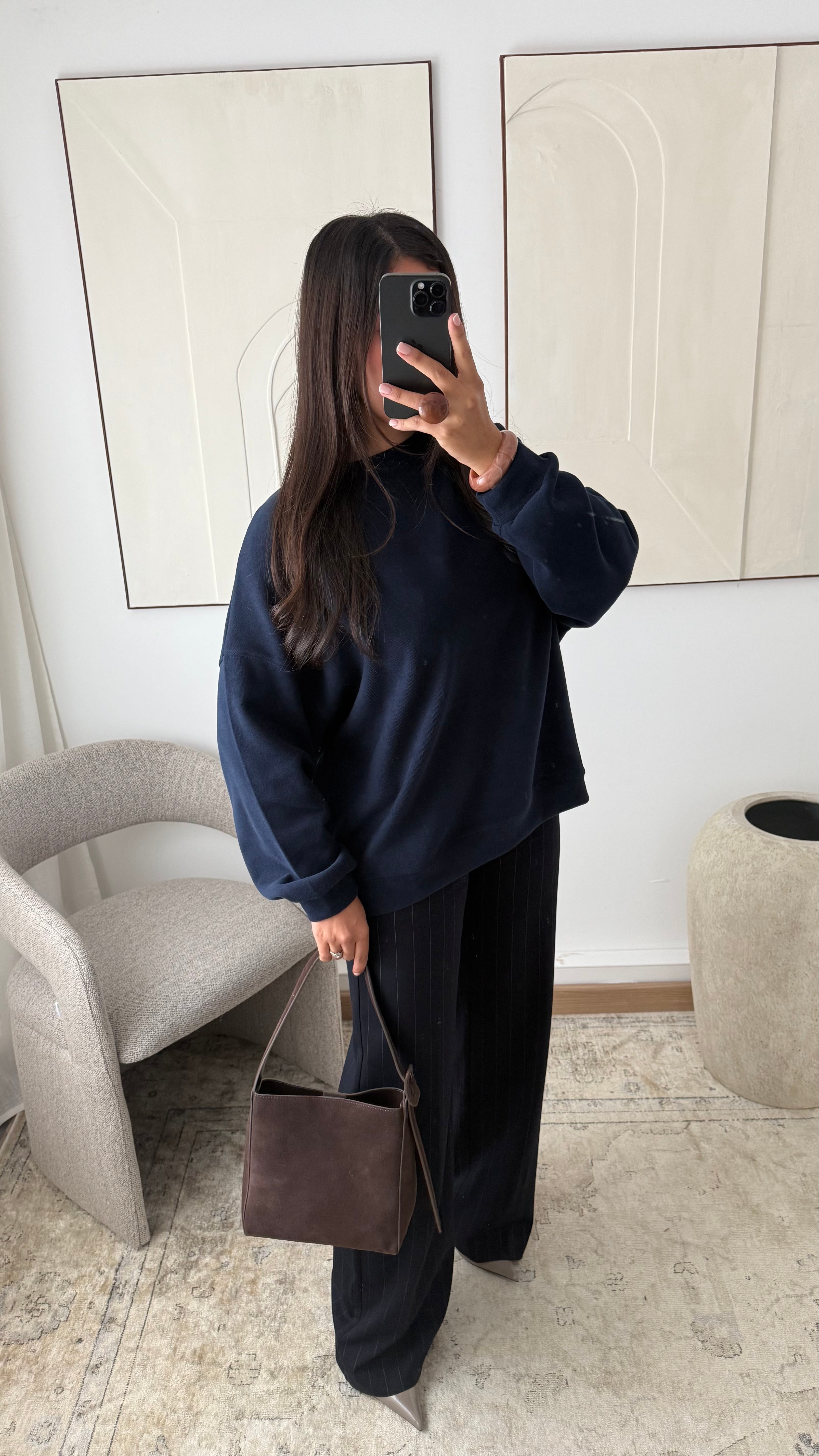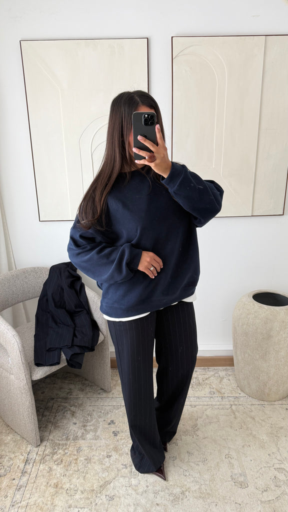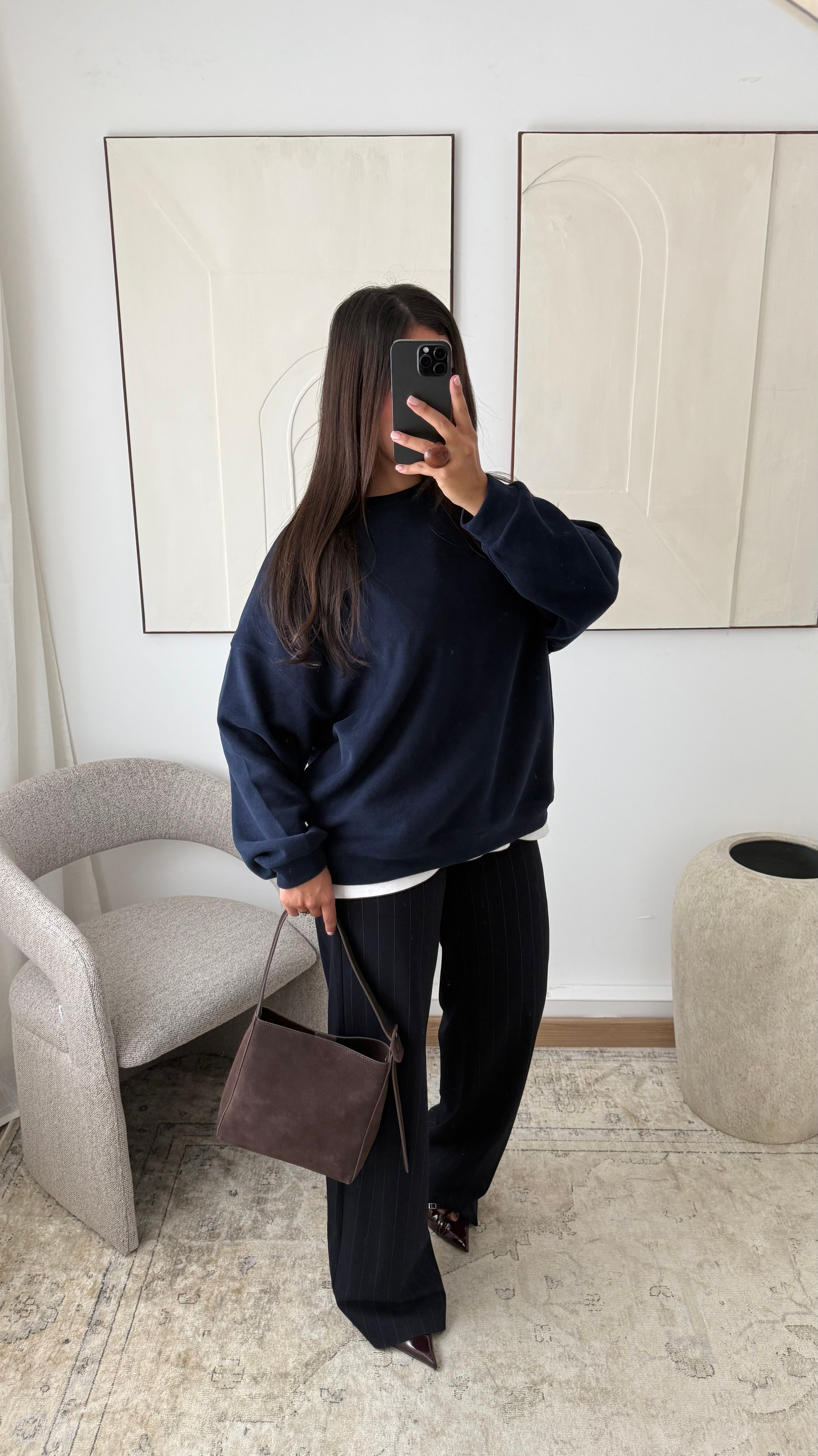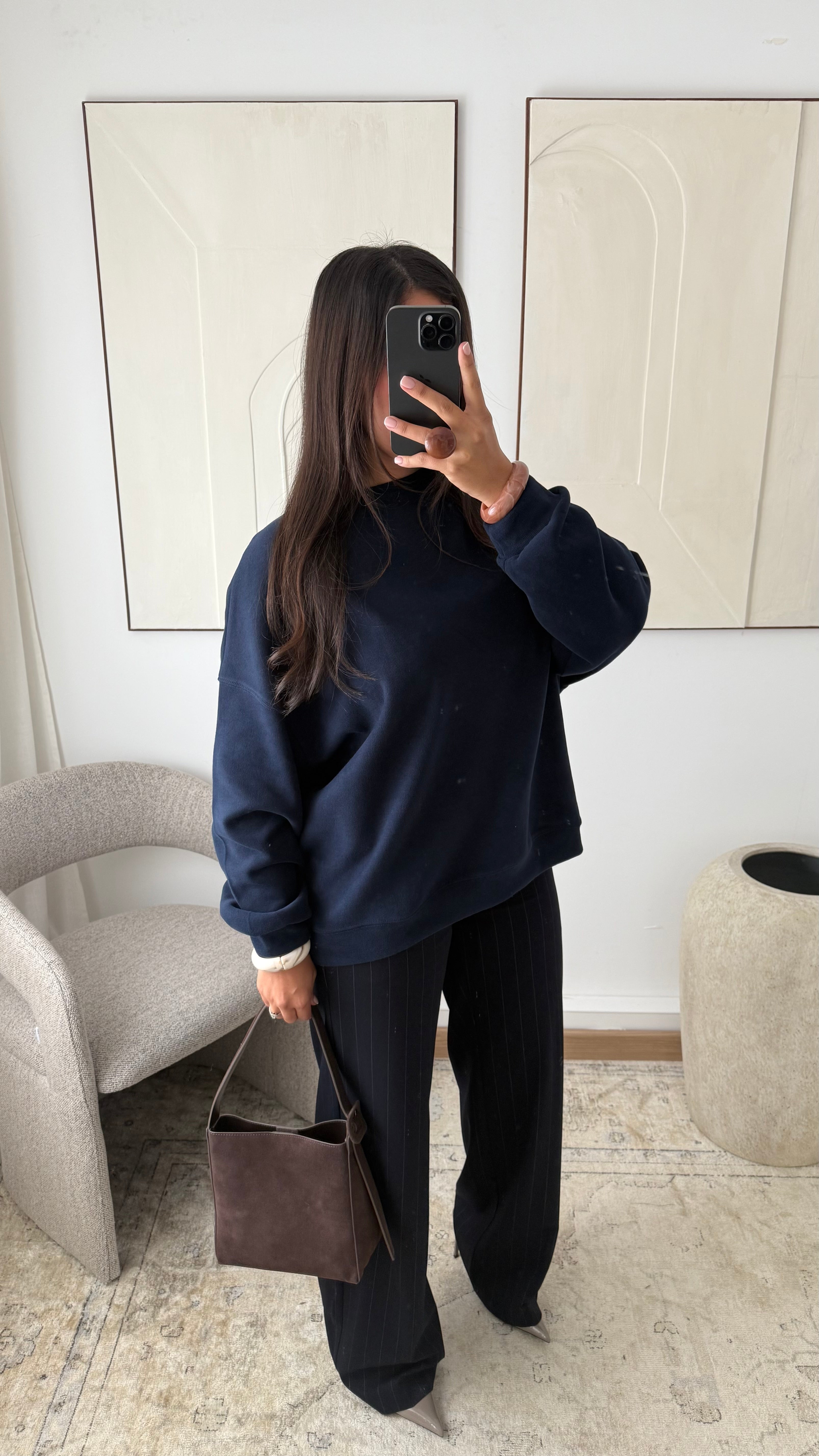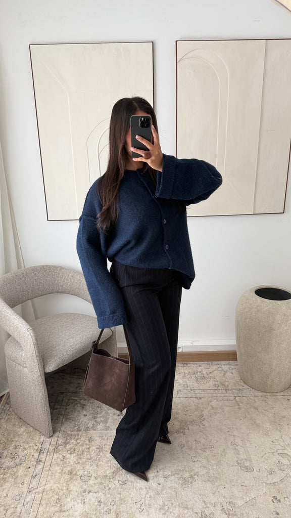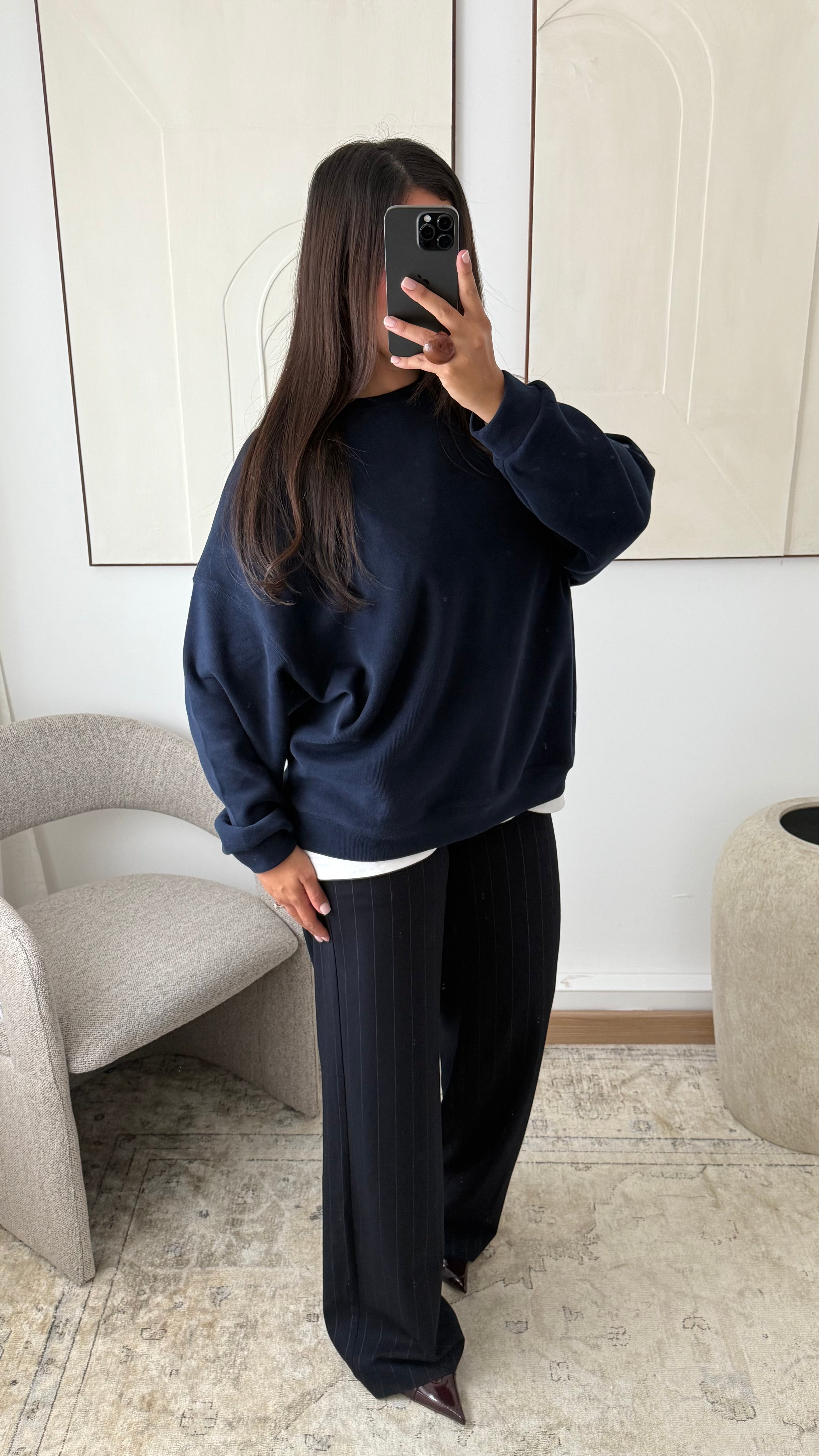 Pantalon droit à rayures marine, au tombé fluide et élégant. Sa matière douce et légèrement extensible offre un confort optimal tout au long de la journée. Une pièce idéale pour un look professionnel, habillé ou casual mastour.