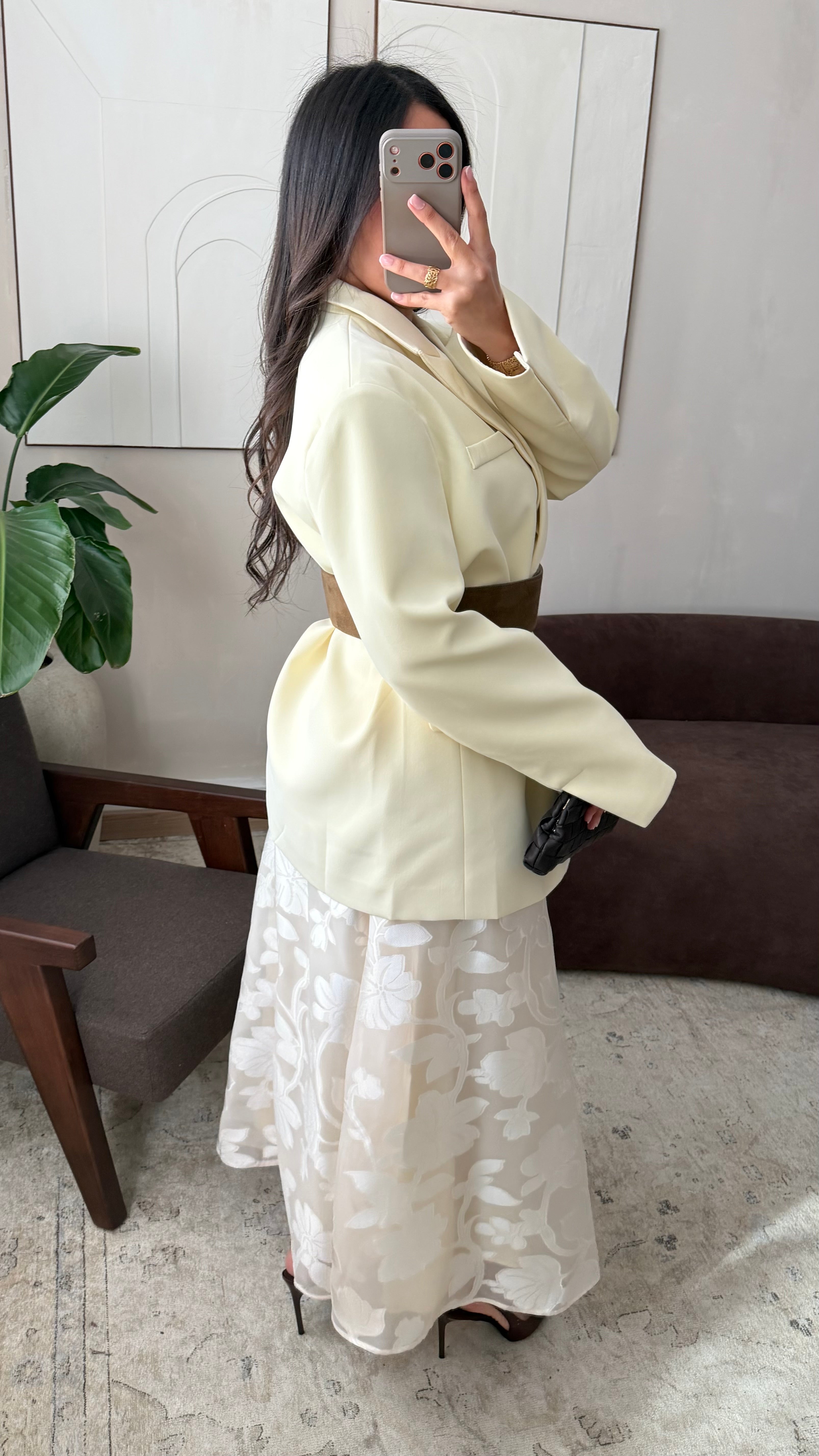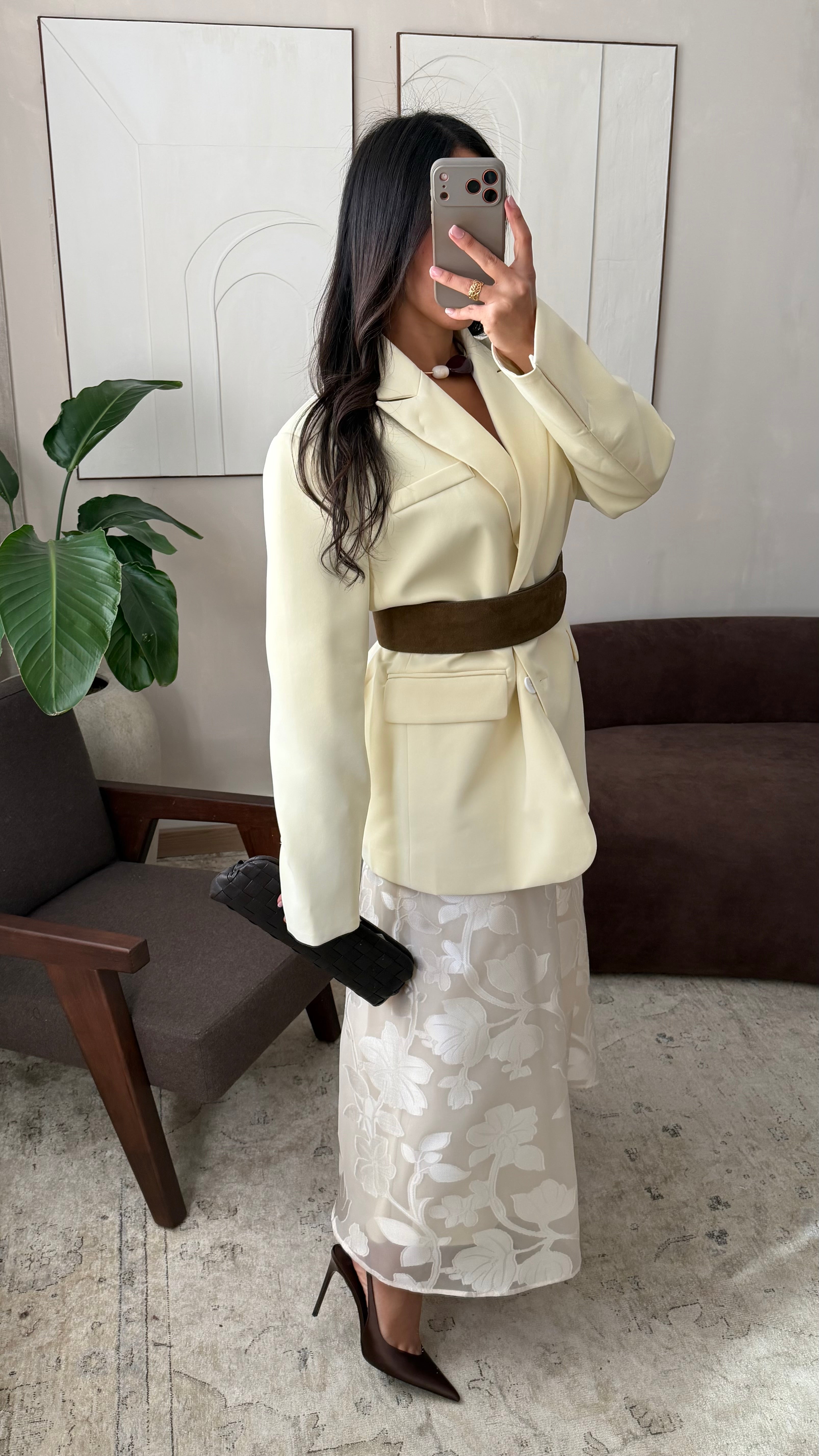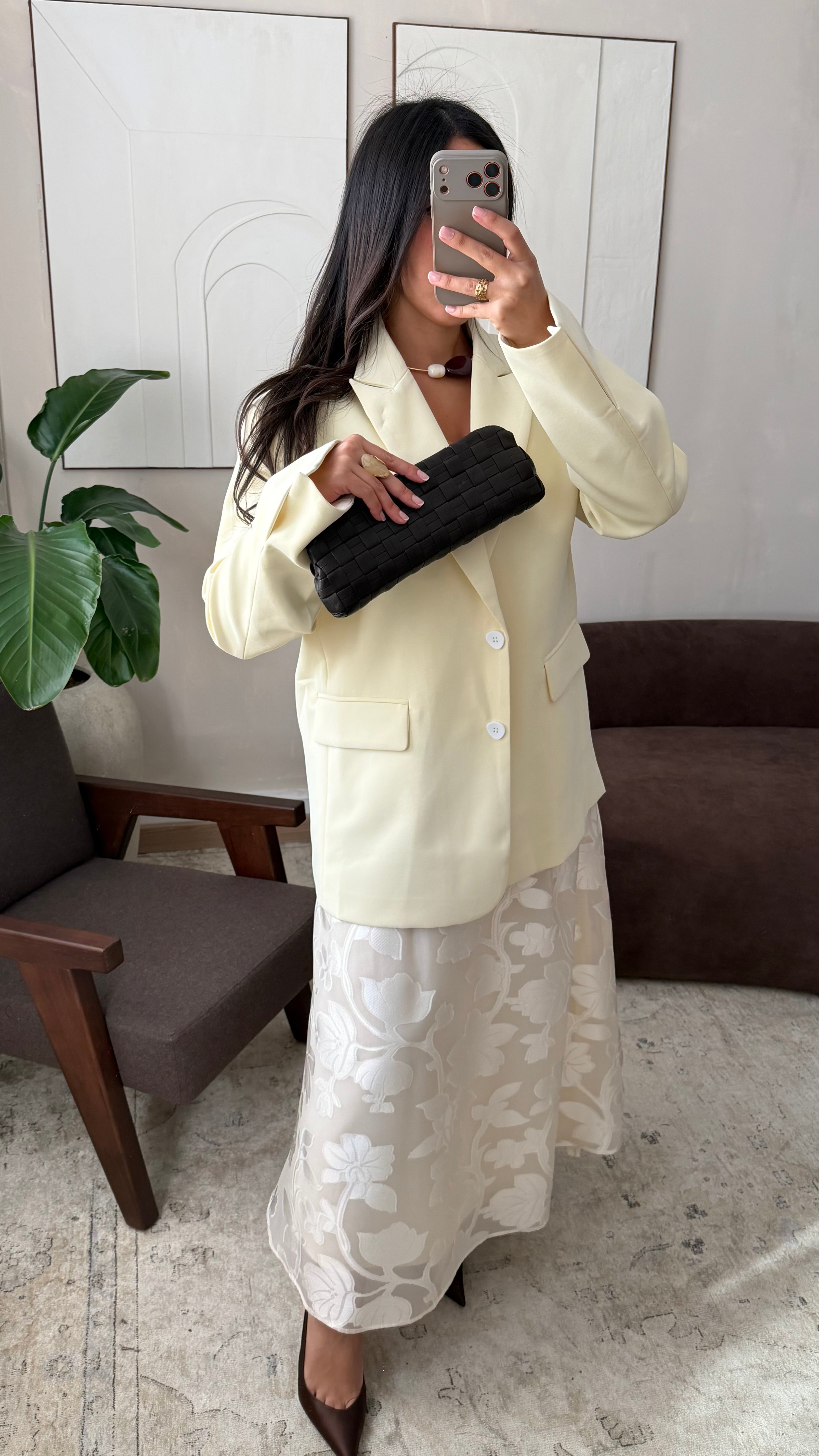 Le mannequin mesure 1m68, porte habituellement du 38/40. Le blazer taille grand, sa coupe oversize permet un confort maximal et un style décontracté.