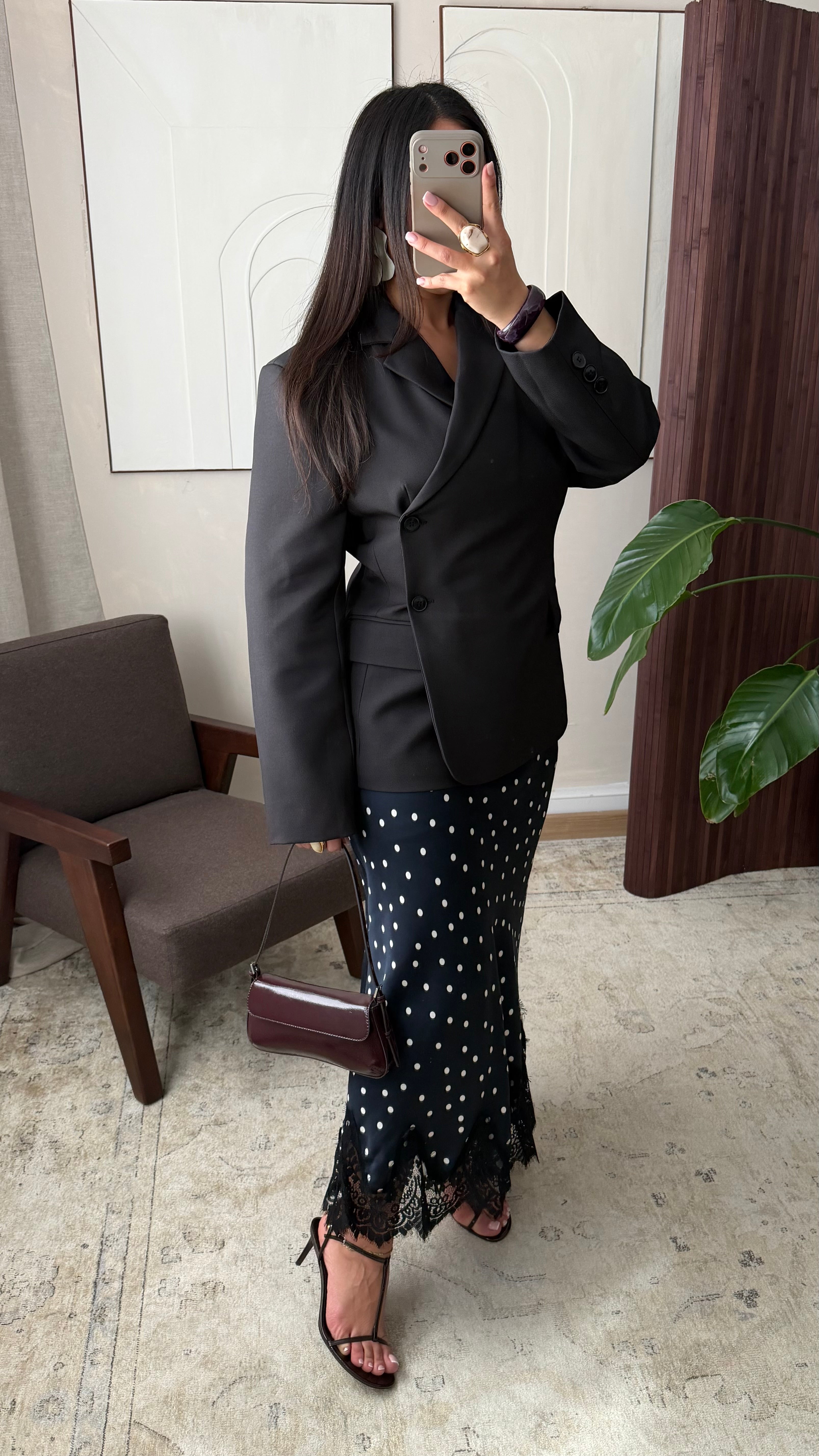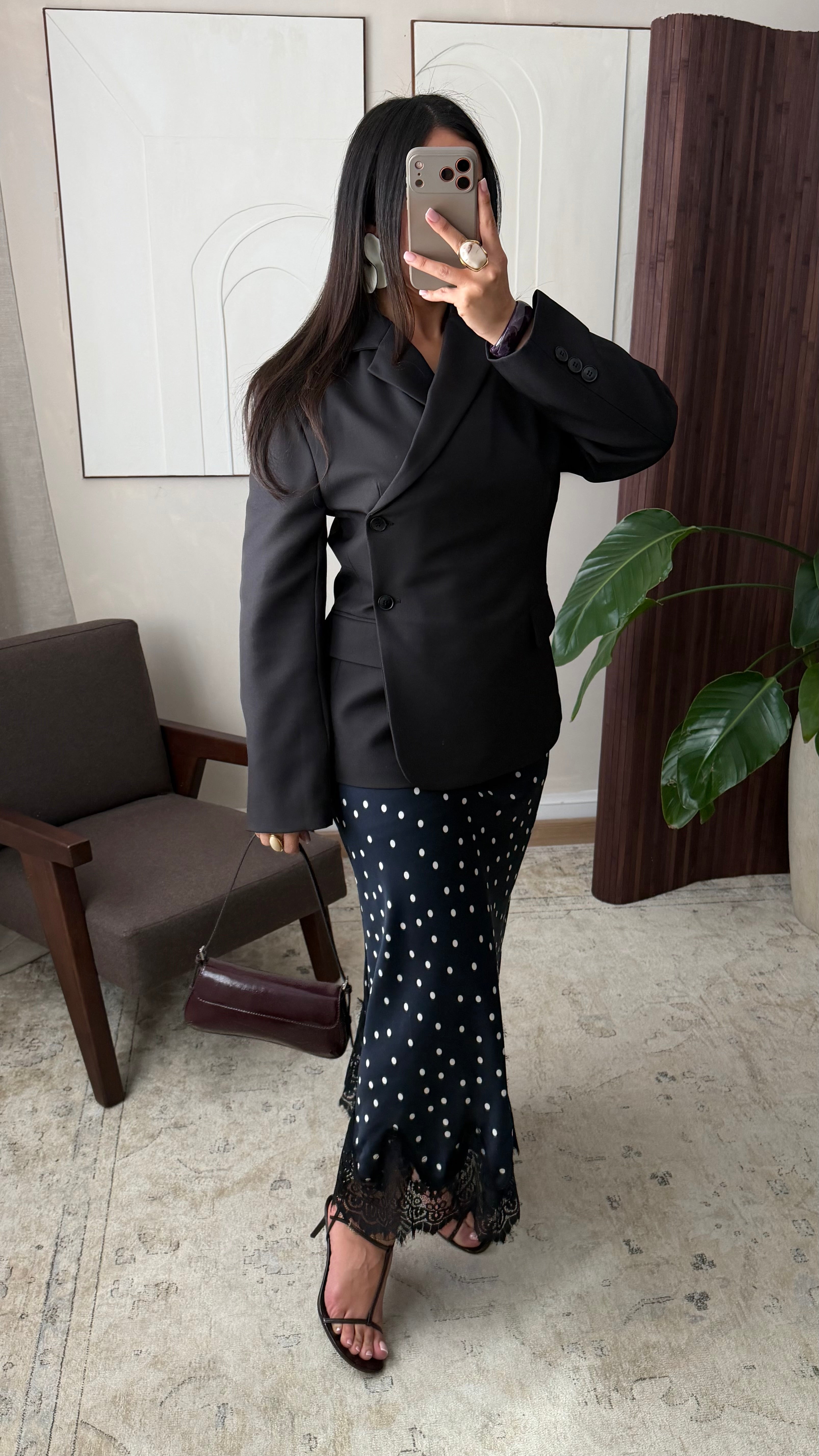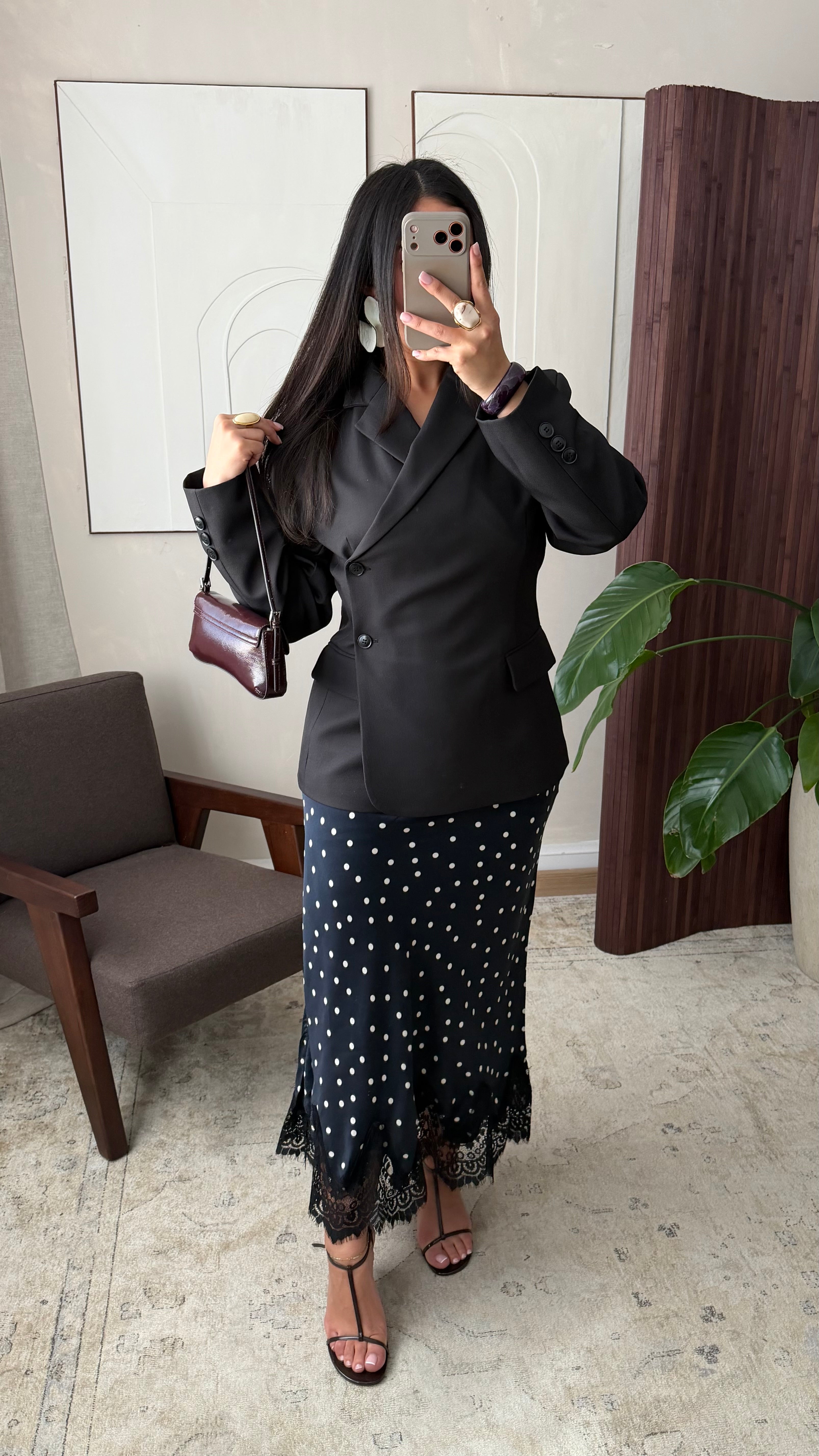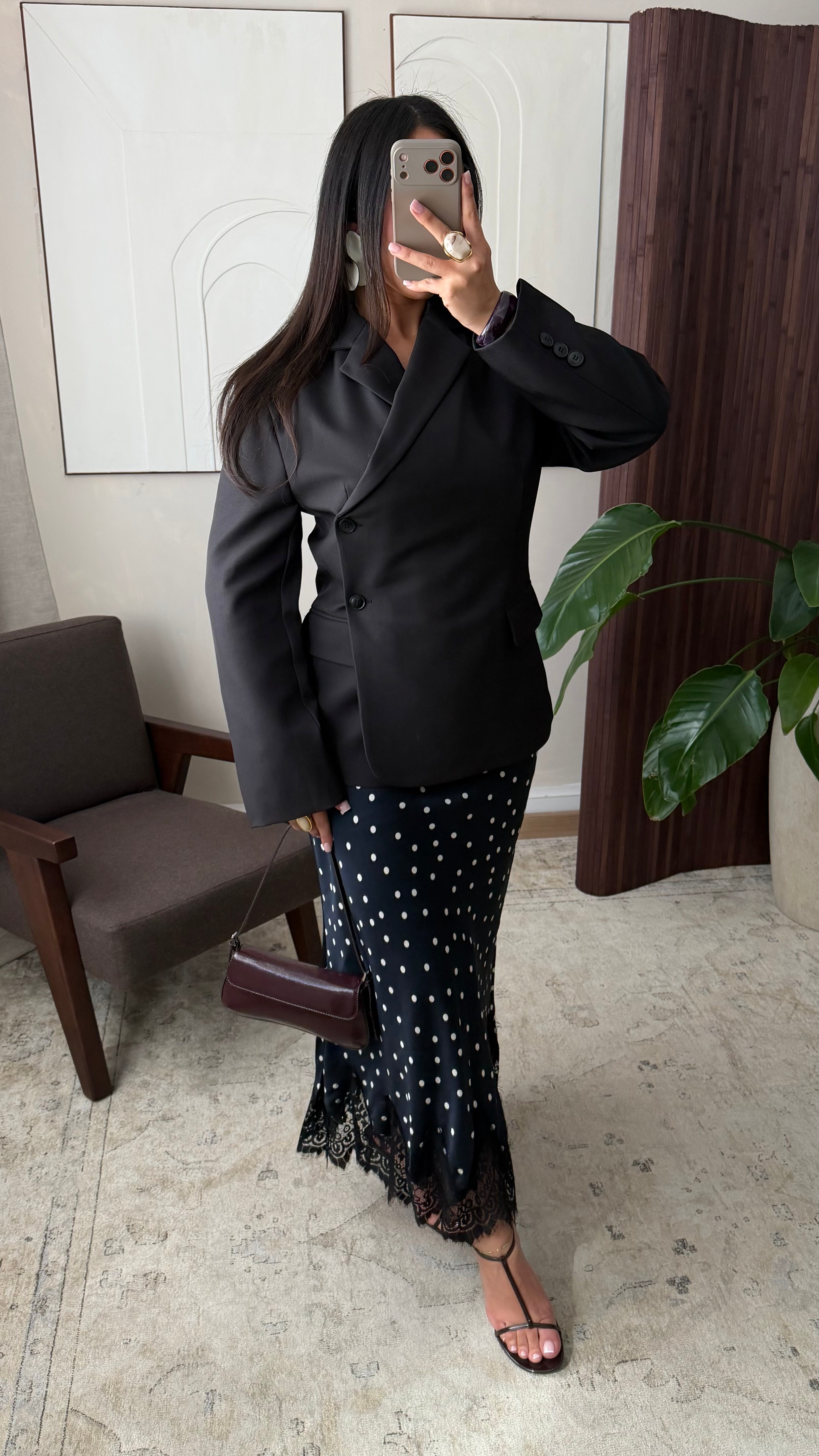Ce blazer élégant est une pièce incontournable qui allie sophistication et modernité. Sa coupe droite et sa longueur étudiée offrent une allure chic et structurée, idéale pour compléter vos tenues professionnelles ou habillées. Un basique raffiné à avoir dans son dressing.