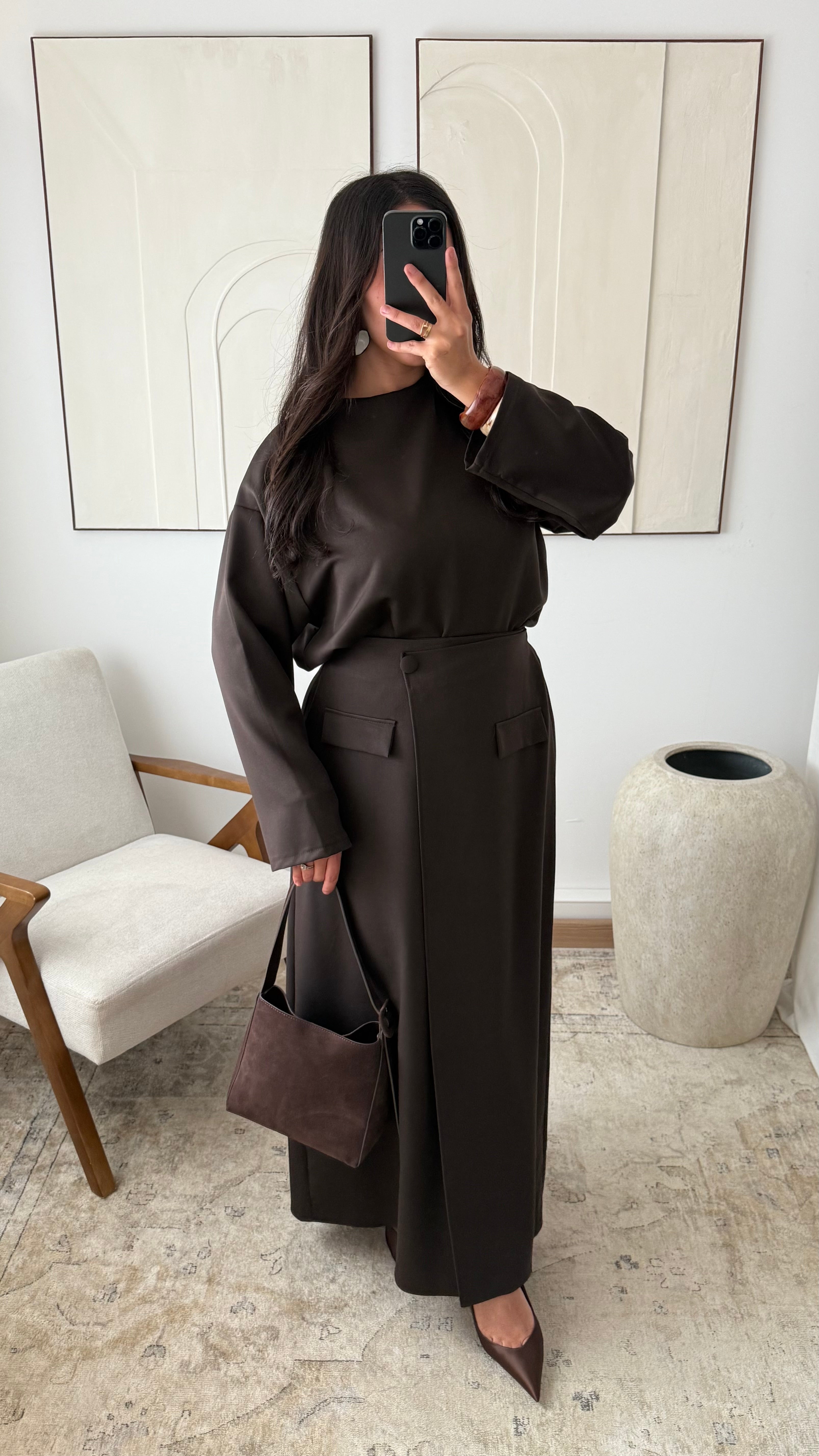 Le top long et la jupe effet portefeuille s’accordent parfaitement pour créer une silhouette équilibrée et raffinée.