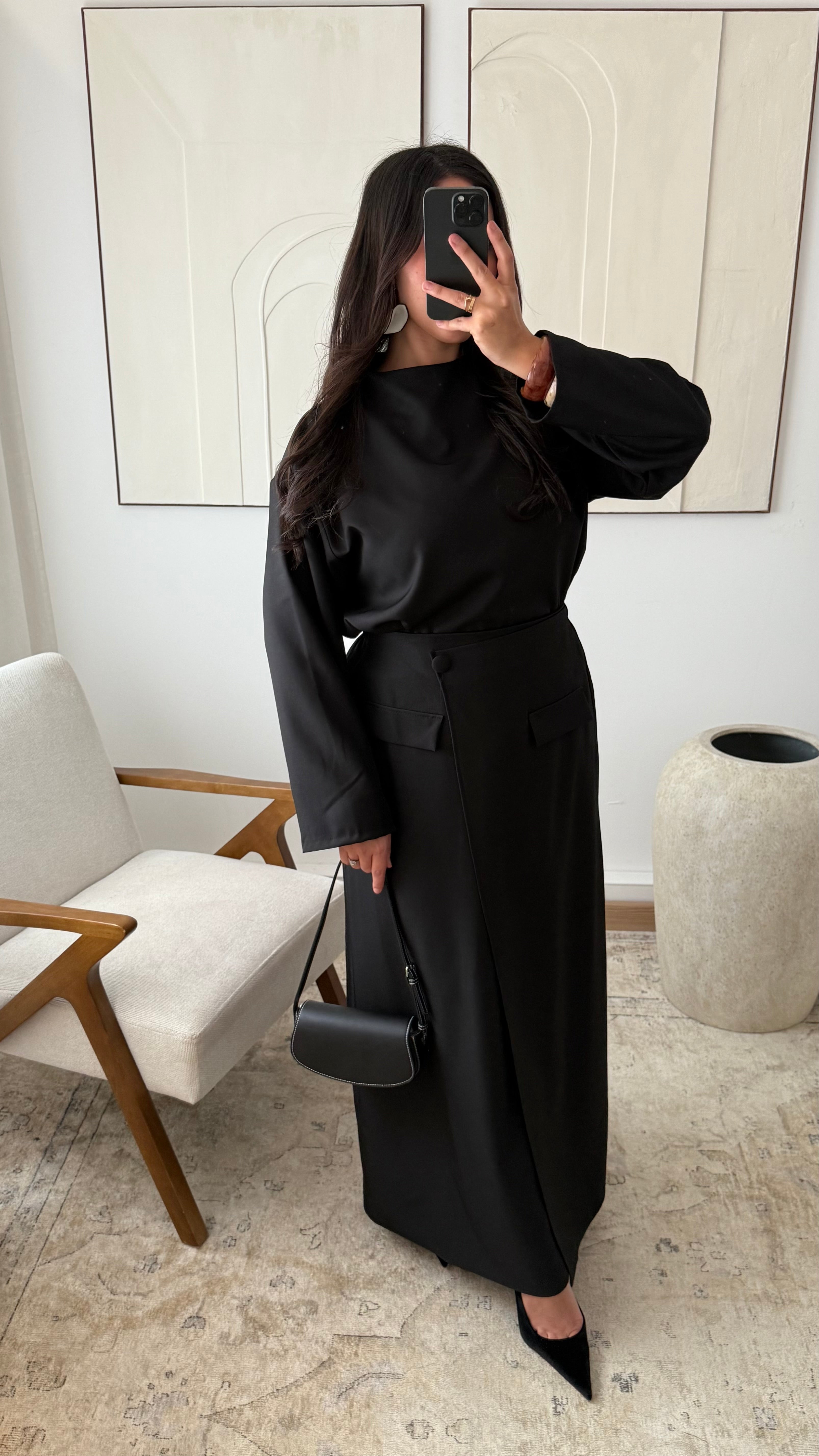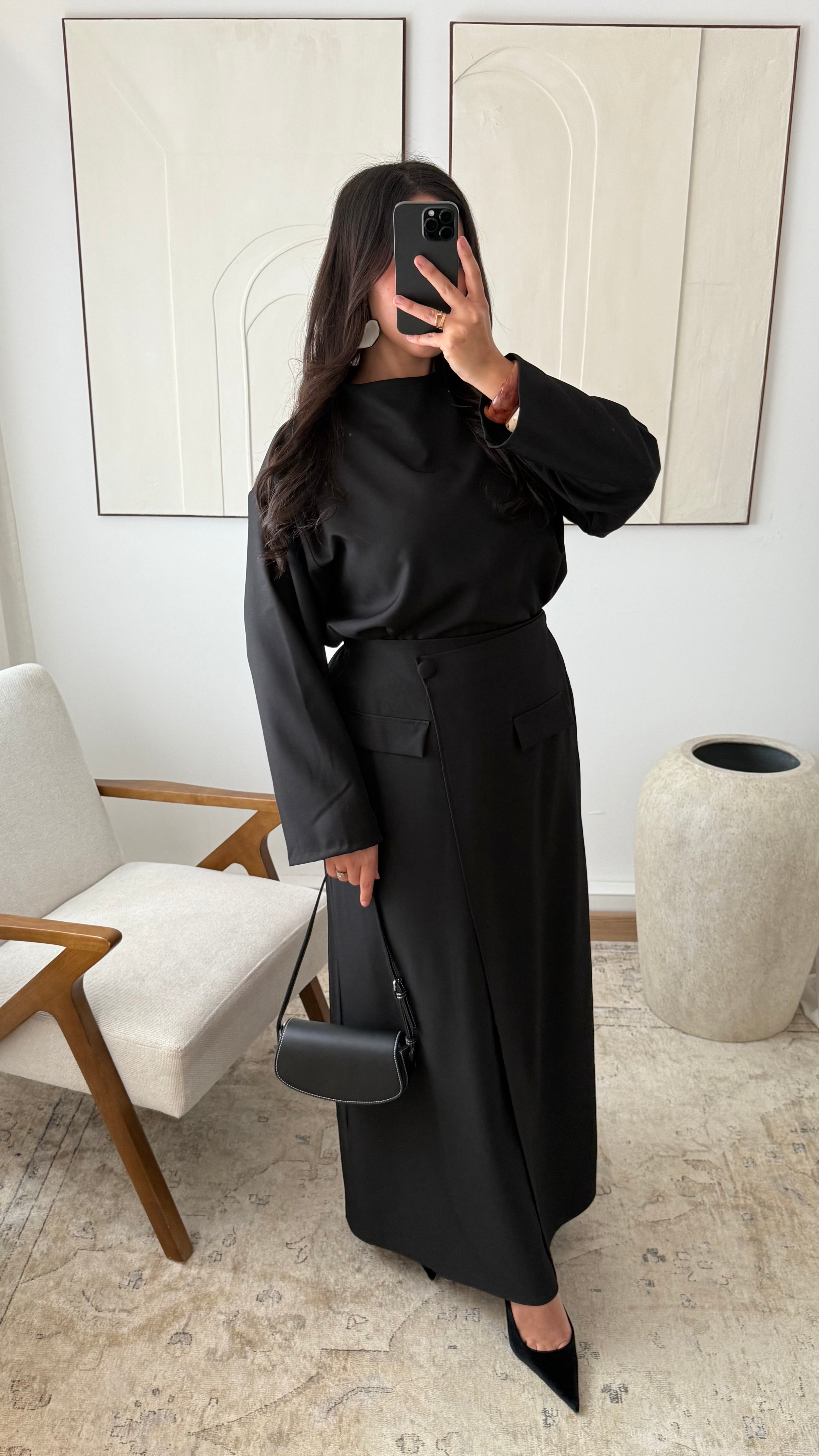 Le top long et la jupe effet portefeuille s’accordent parfaitement pour créer une silhouette équilibrée et raffinée.