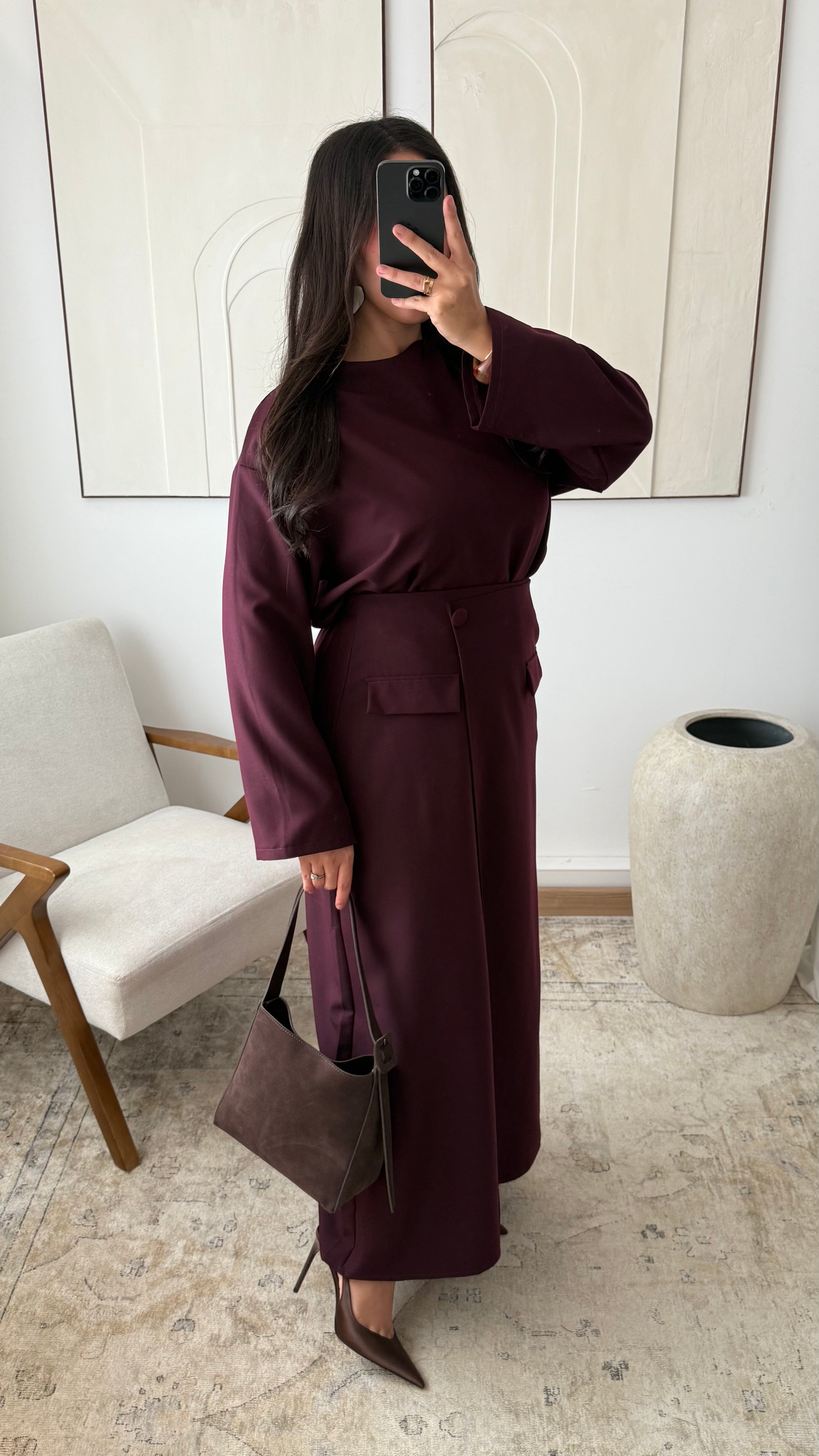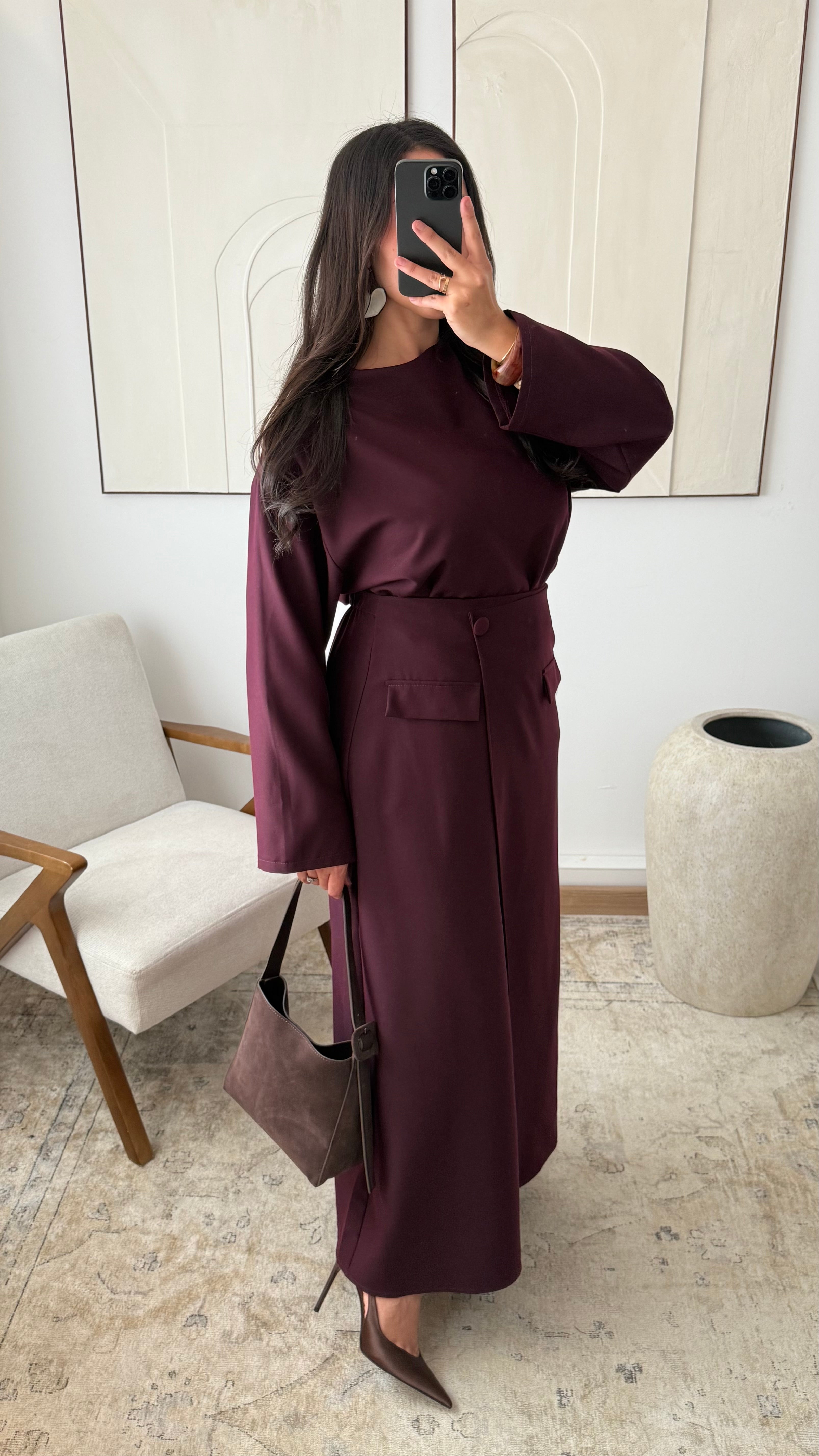 Le top long et la jupe effet portefeuille s’accordent parfaitement pour créer une silhouette équilibrée et raffinée.