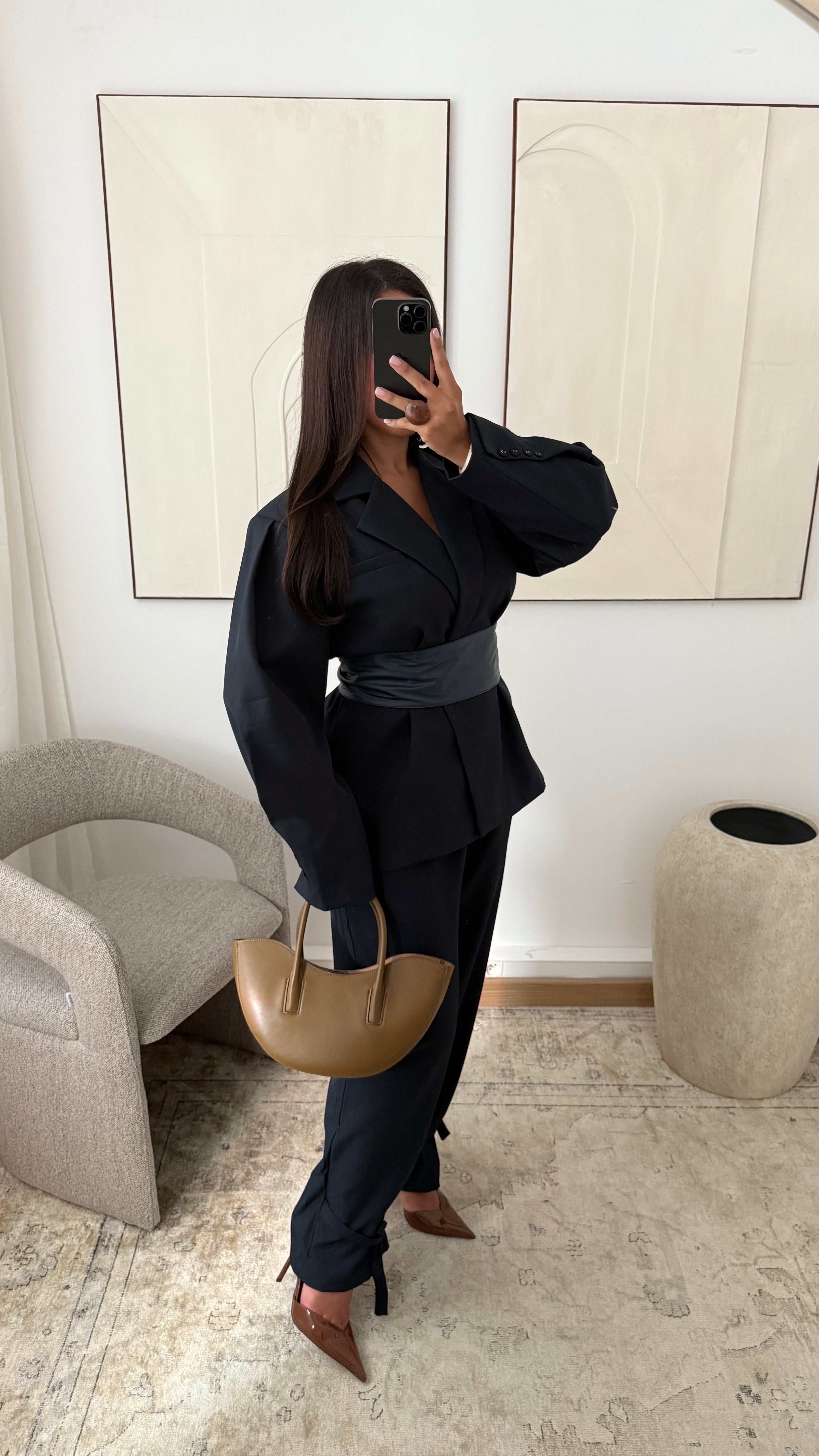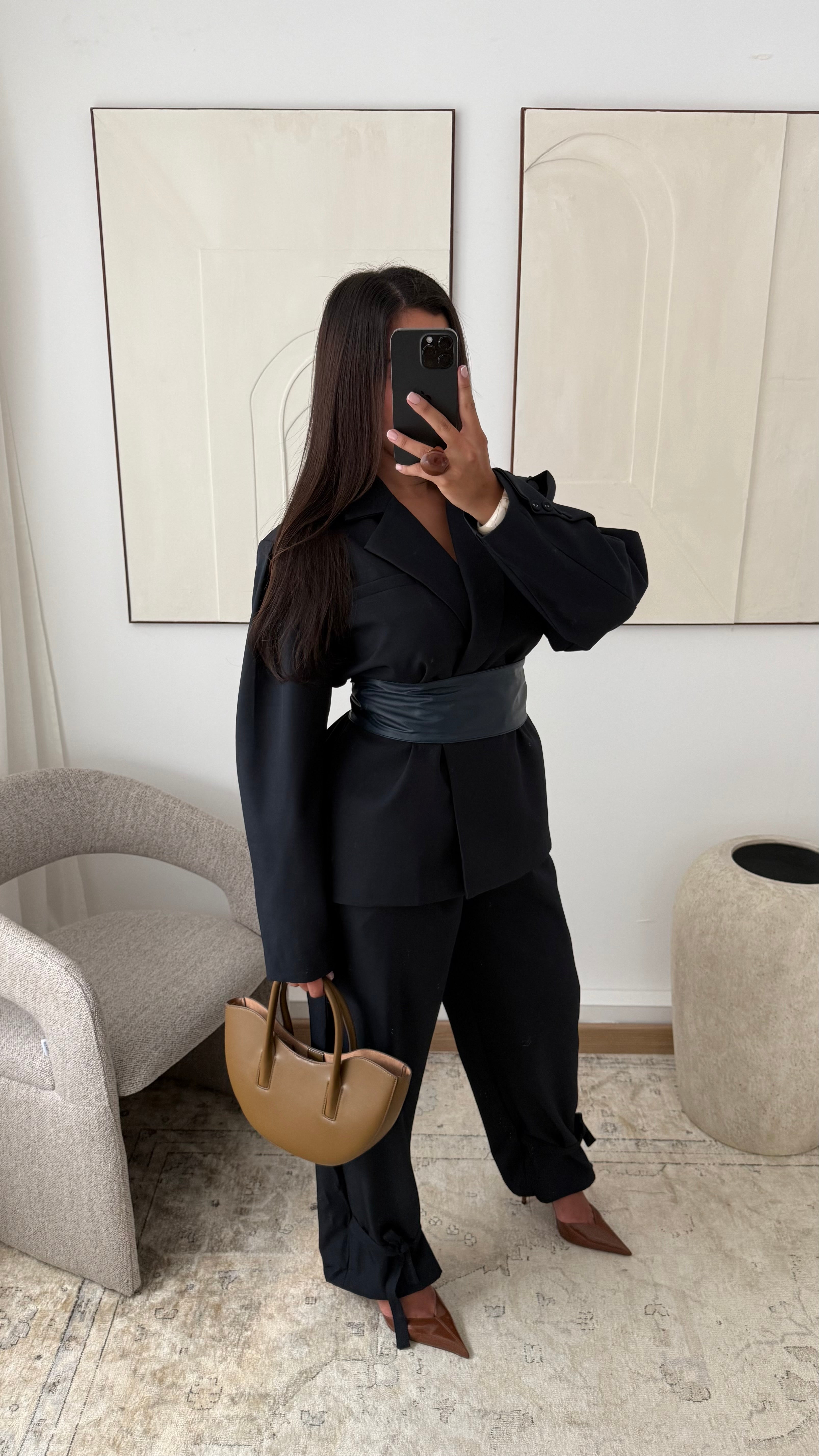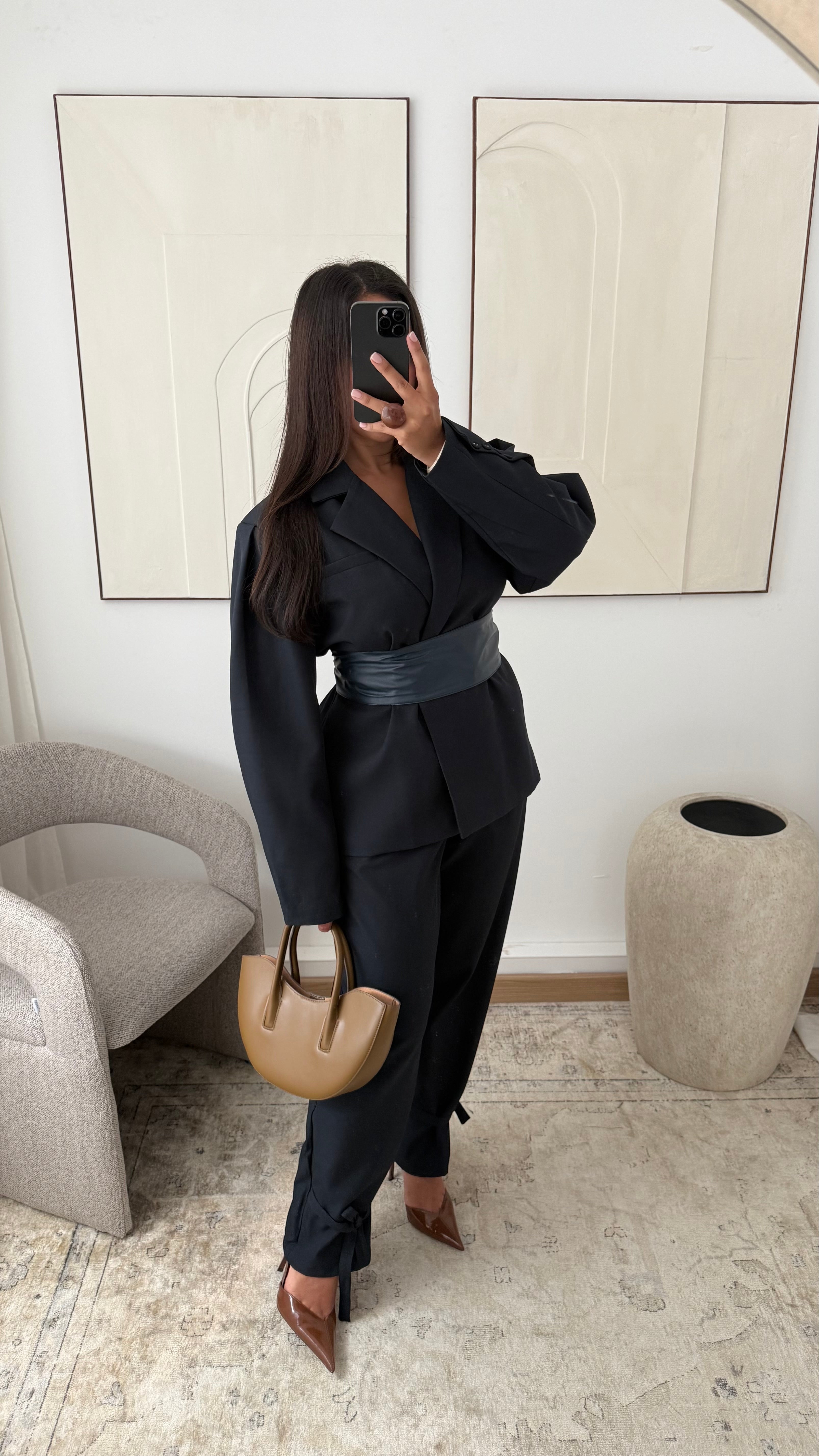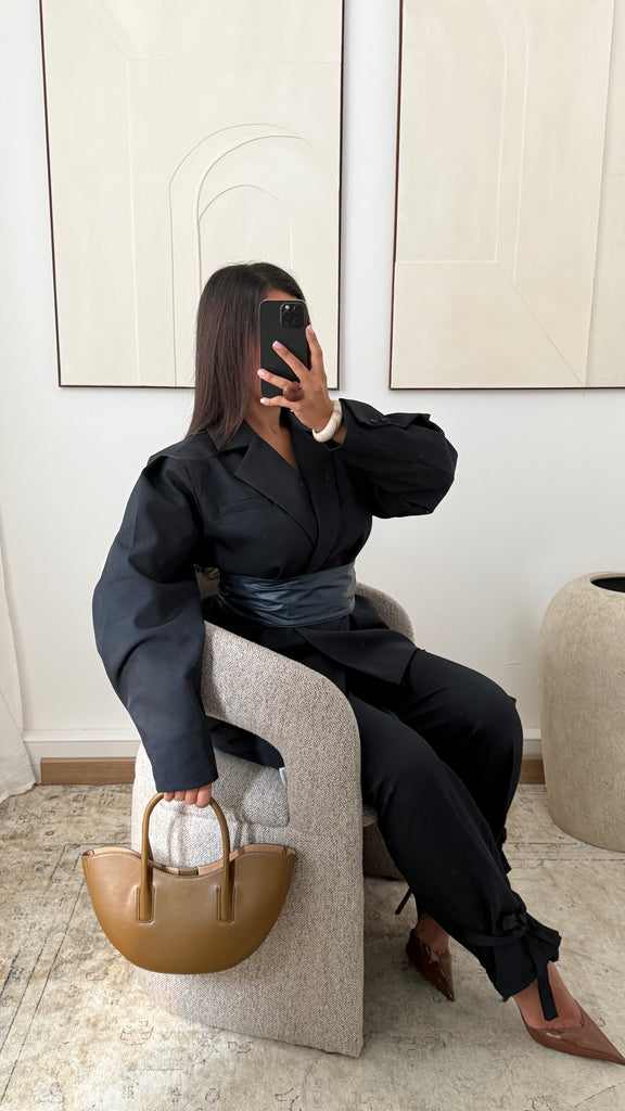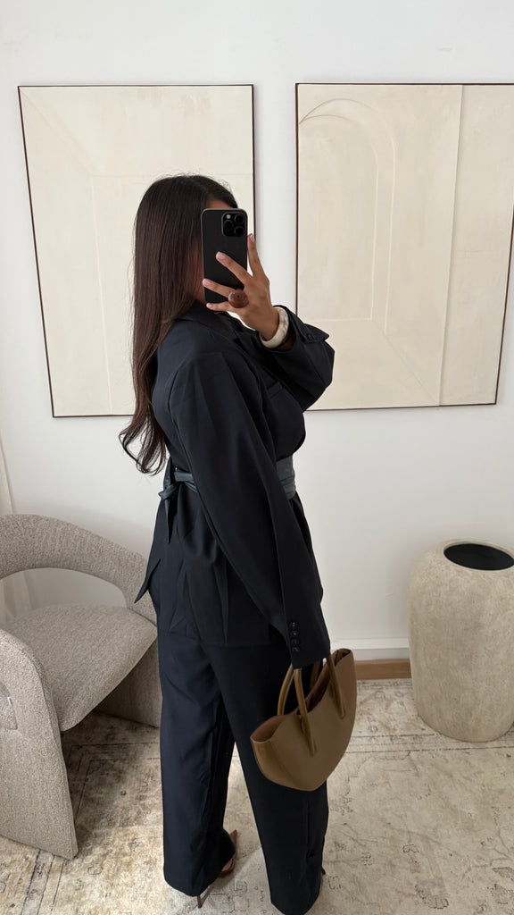 Blazer oversize à boutonnage croisé, accompagné d'une ceinture effet cuir à nouer. Il mêle une coupe structurée et ample à un détail ceinturé féminin, pour une silhouette élégante et affirmée. Idéal pour revisiter le tailleur classique avec modernité.