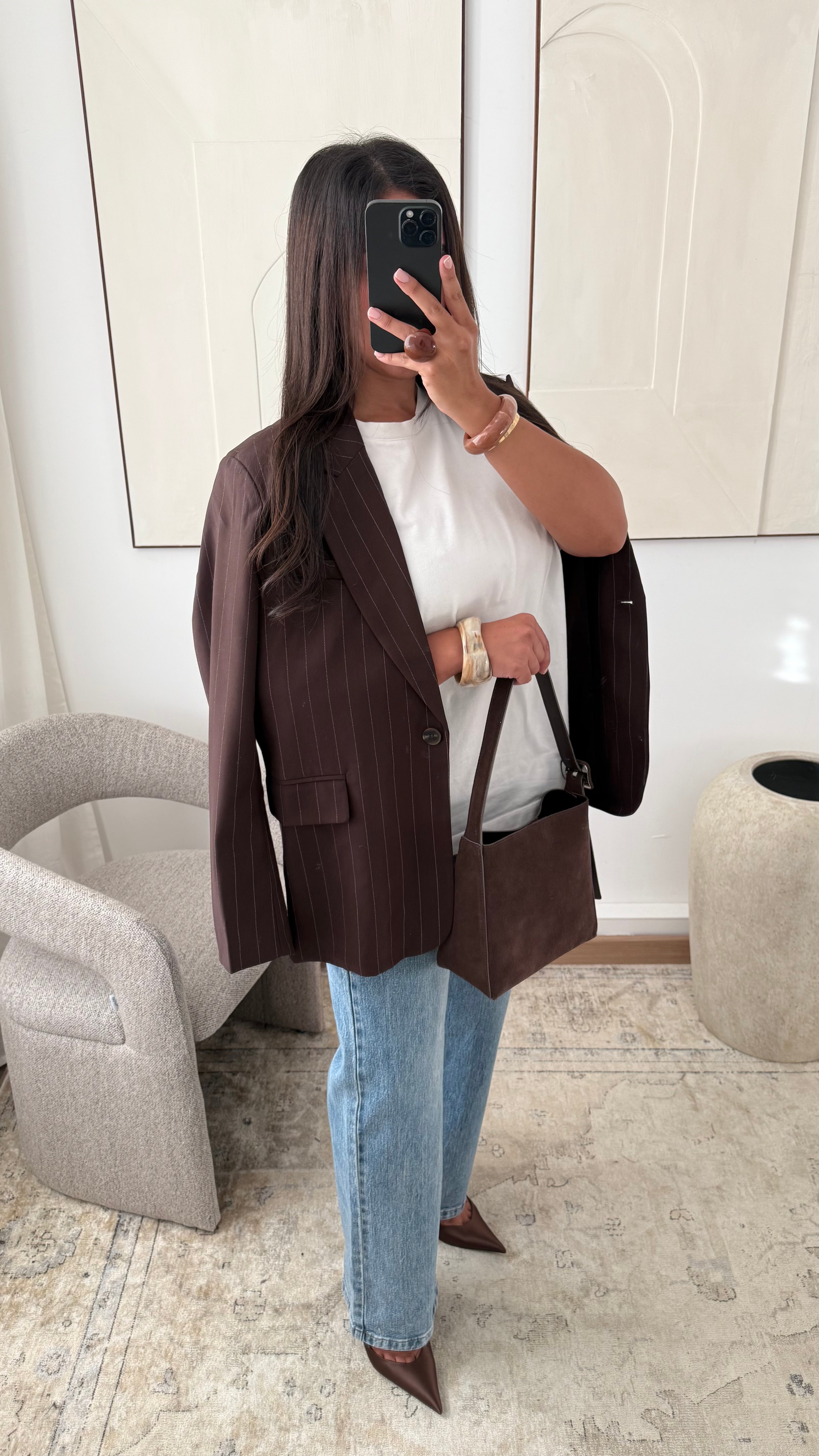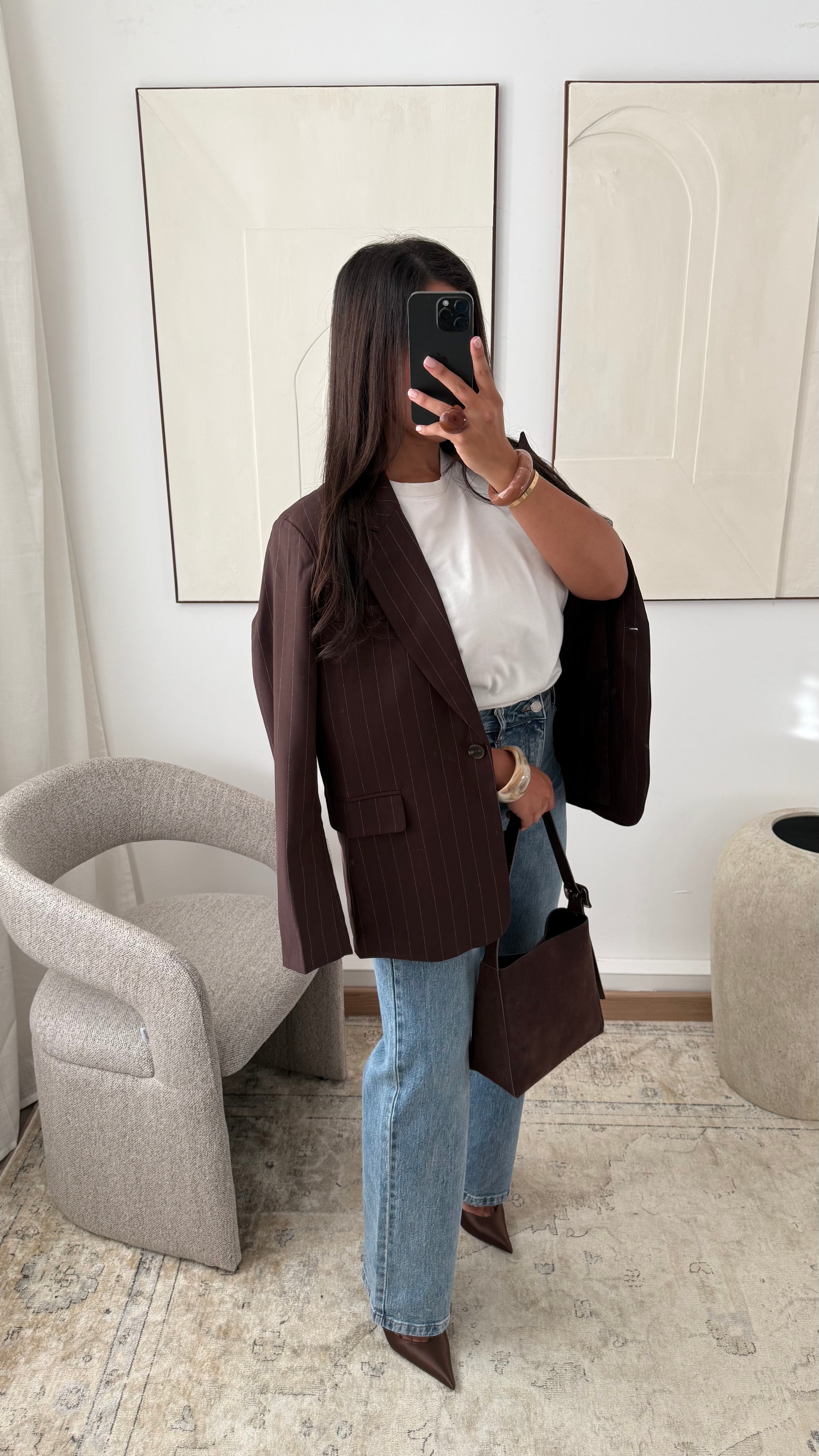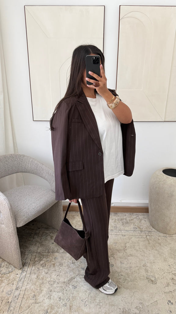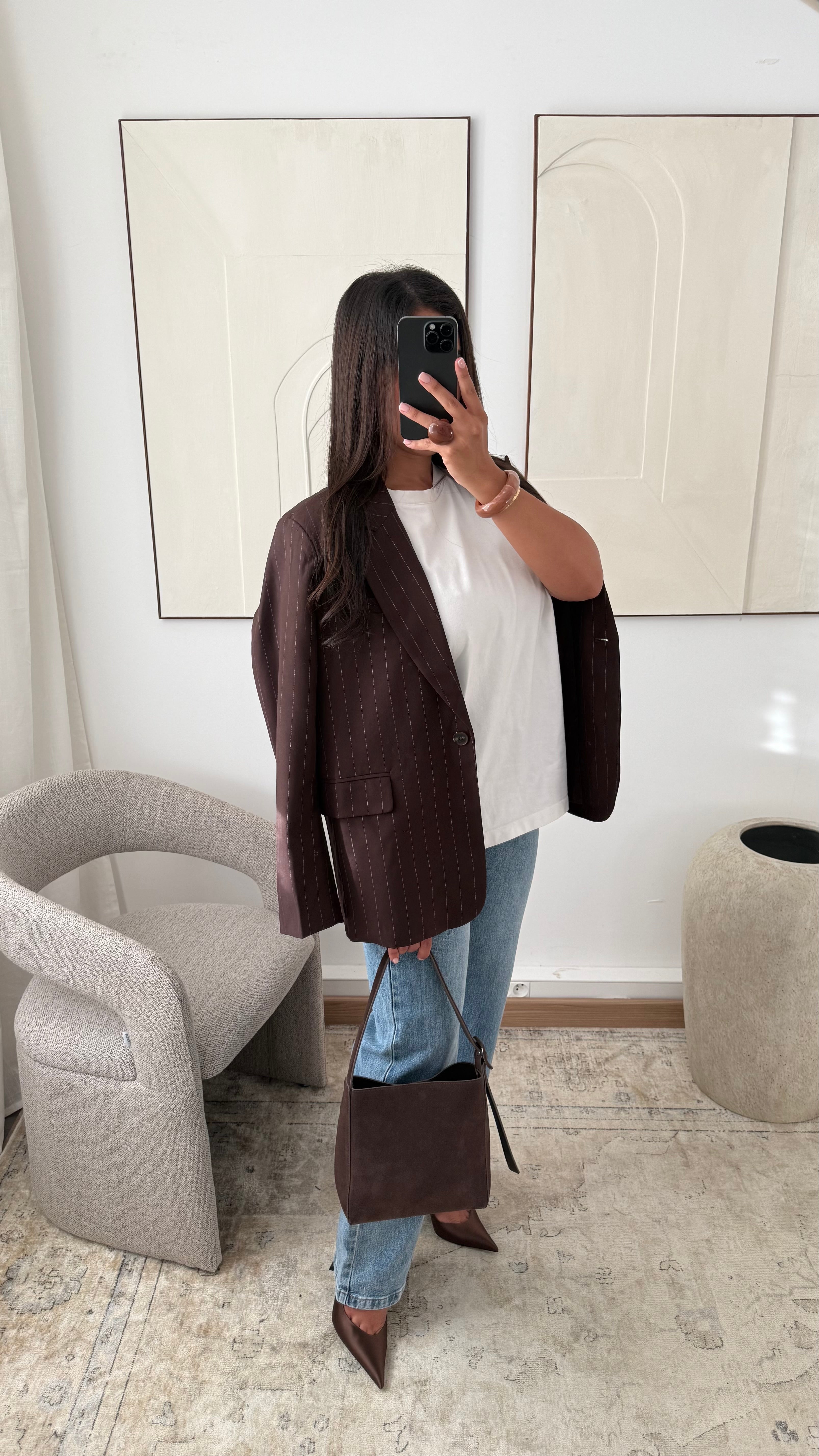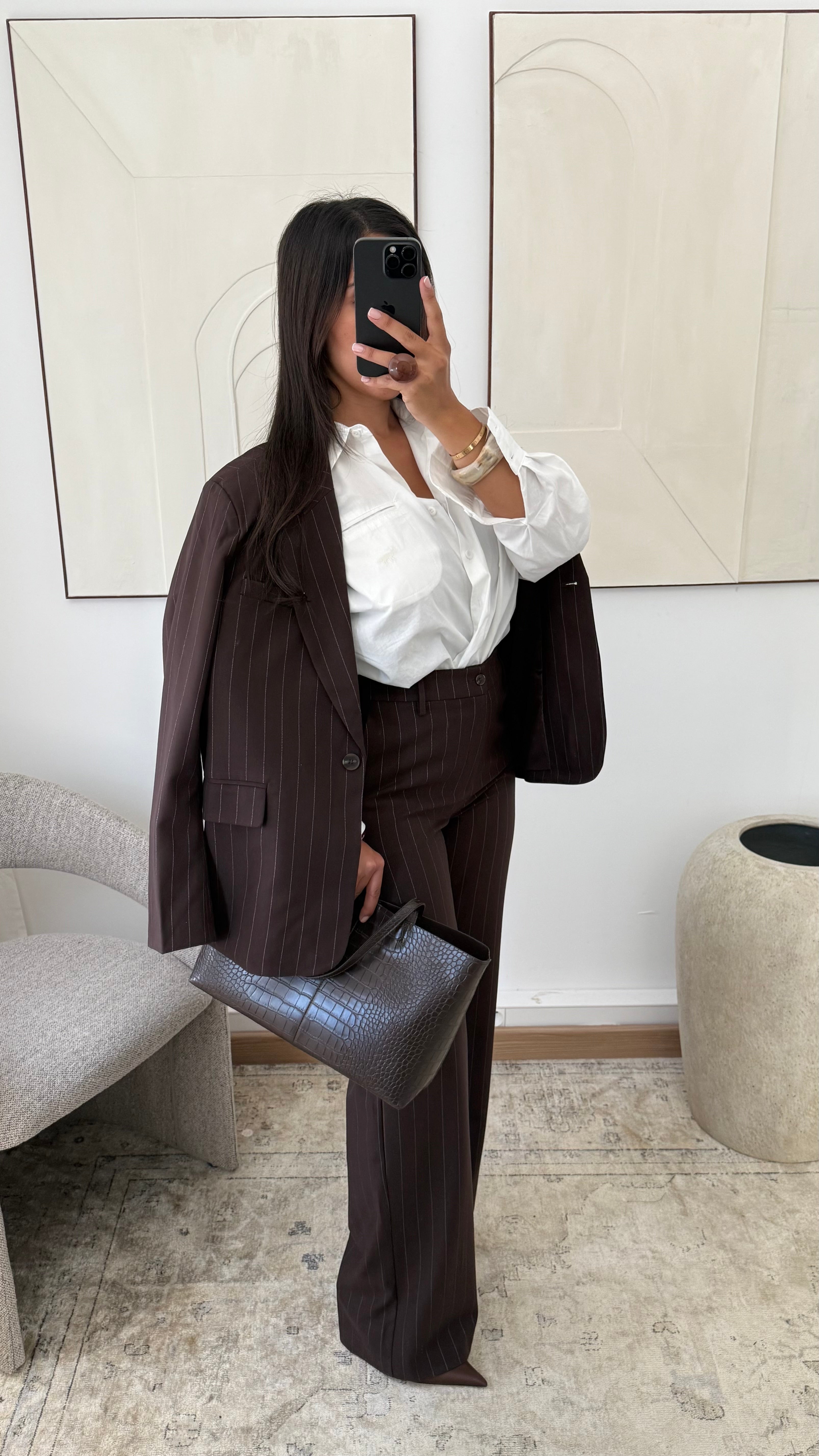 Blazer à rayures blanches à la coupe droite, structuré et élégant. Son design minimaliste avec un seul bouton apporte une touche de modernité tout en restant intemporel. Idéal pour vos looks de bureau ou vos sorties plus habillées.