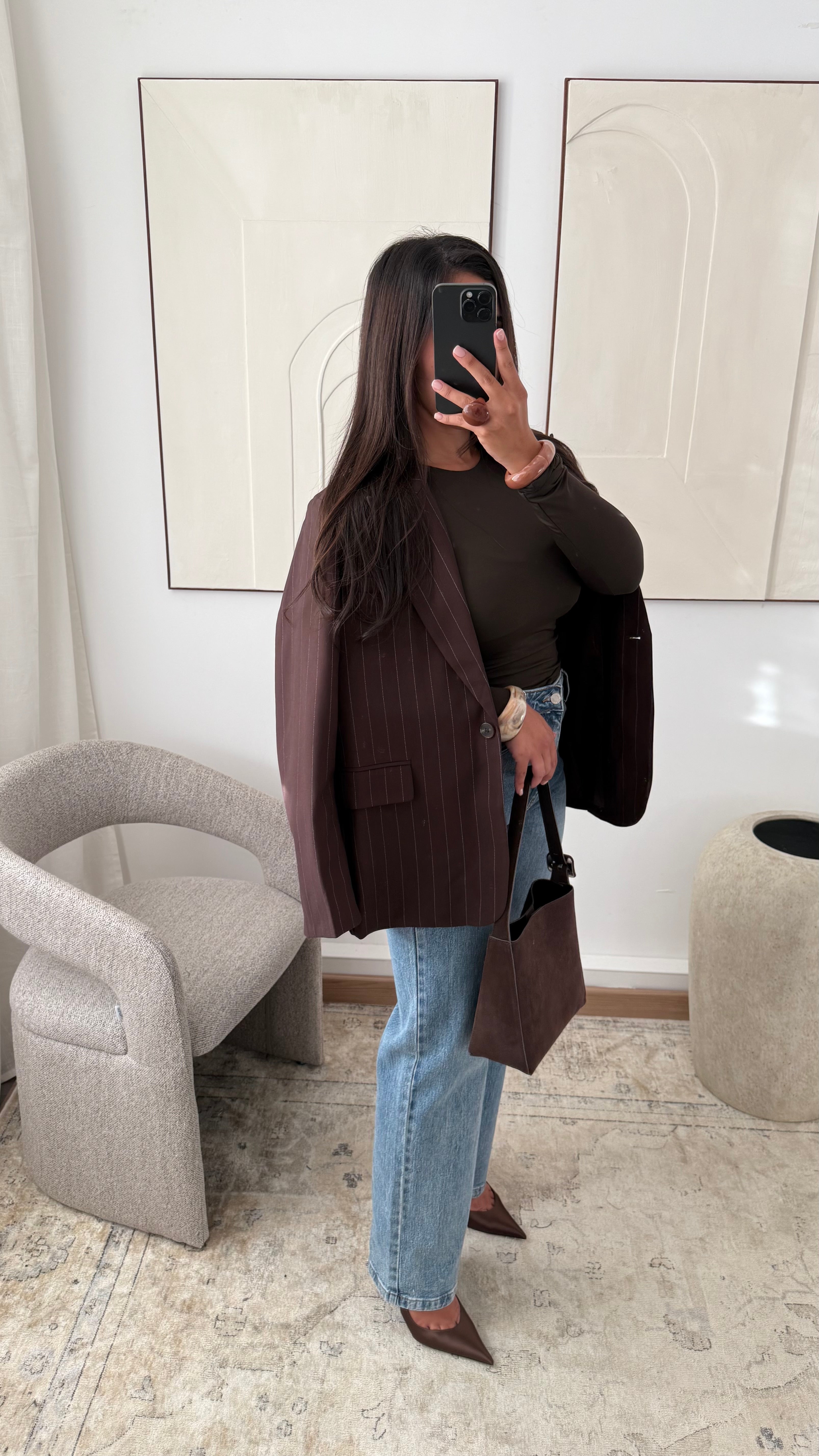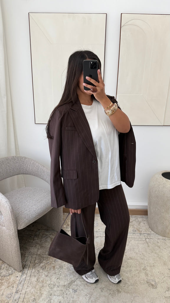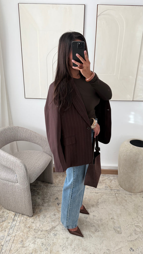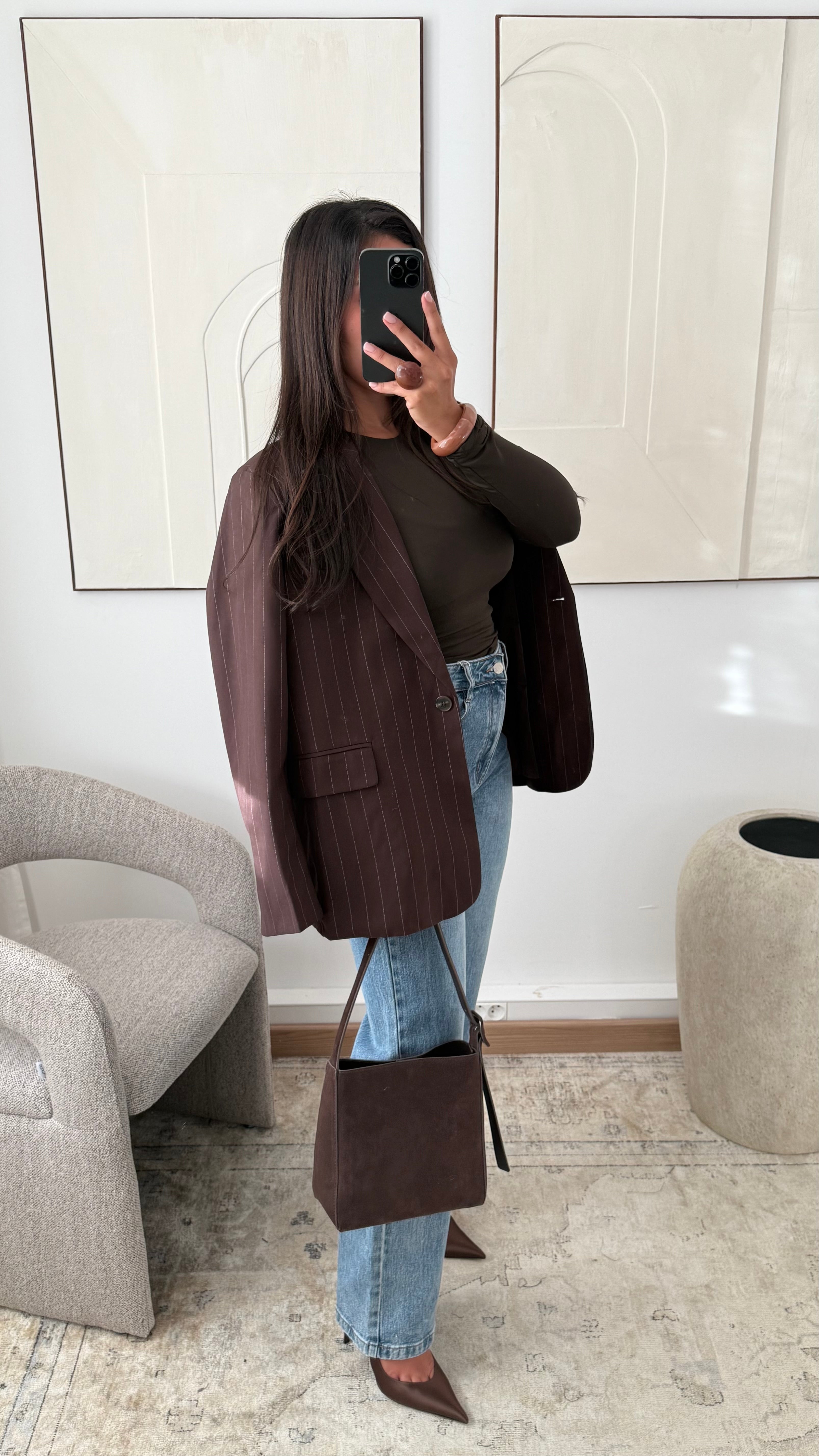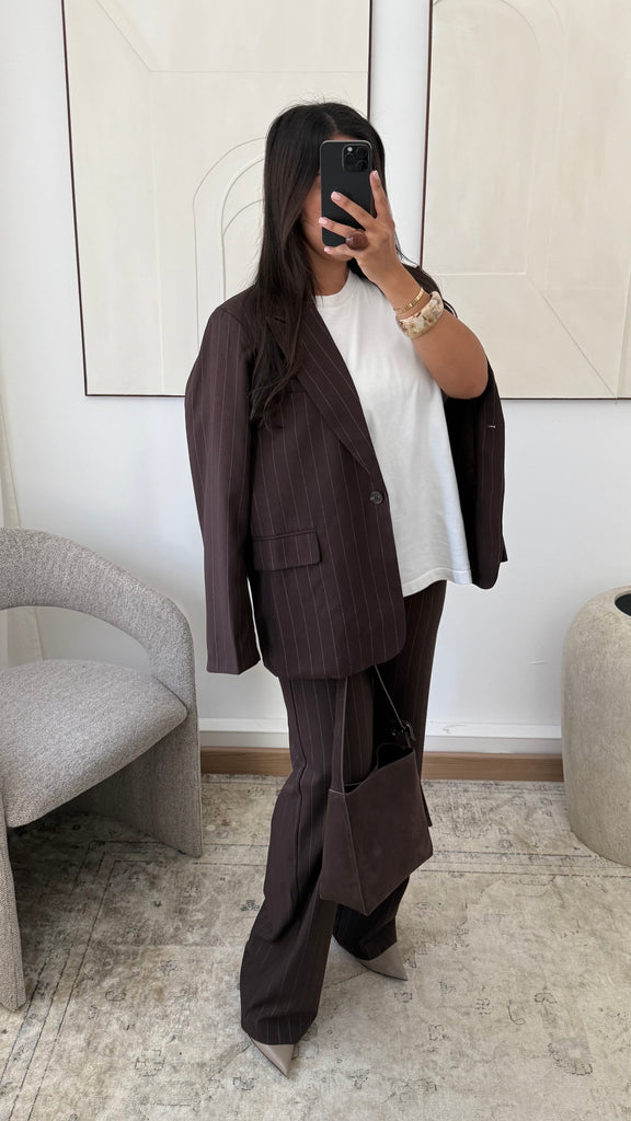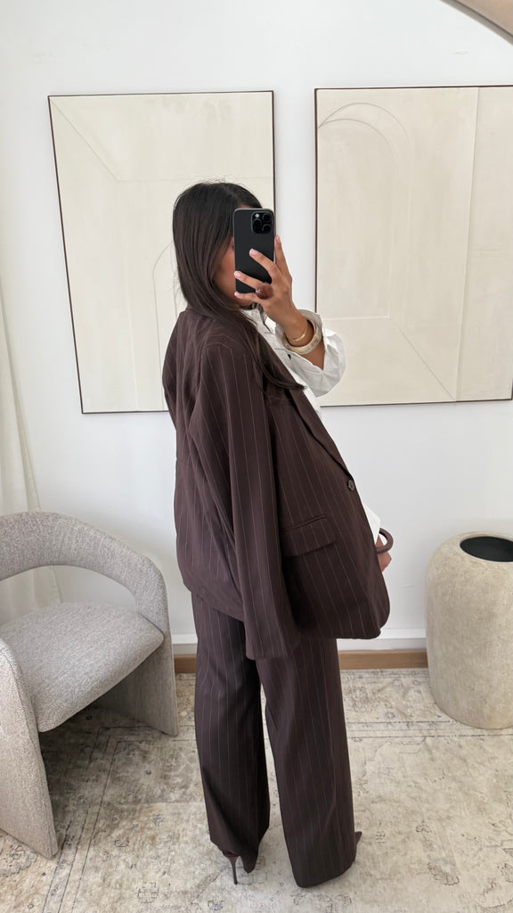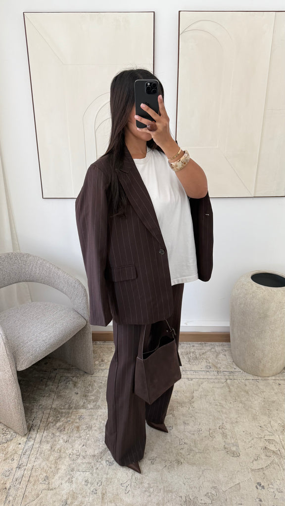 Blazer à rayures blanches à la coupe droite, structuré et élégant. Son design minimaliste avec un seul bouton apporte une touche de modernité tout en restant intemporel. Idéal pour vos looks de bureau ou vos sorties plus habillées.