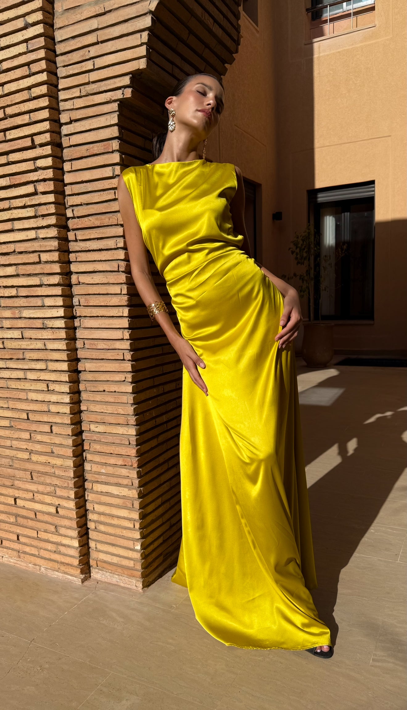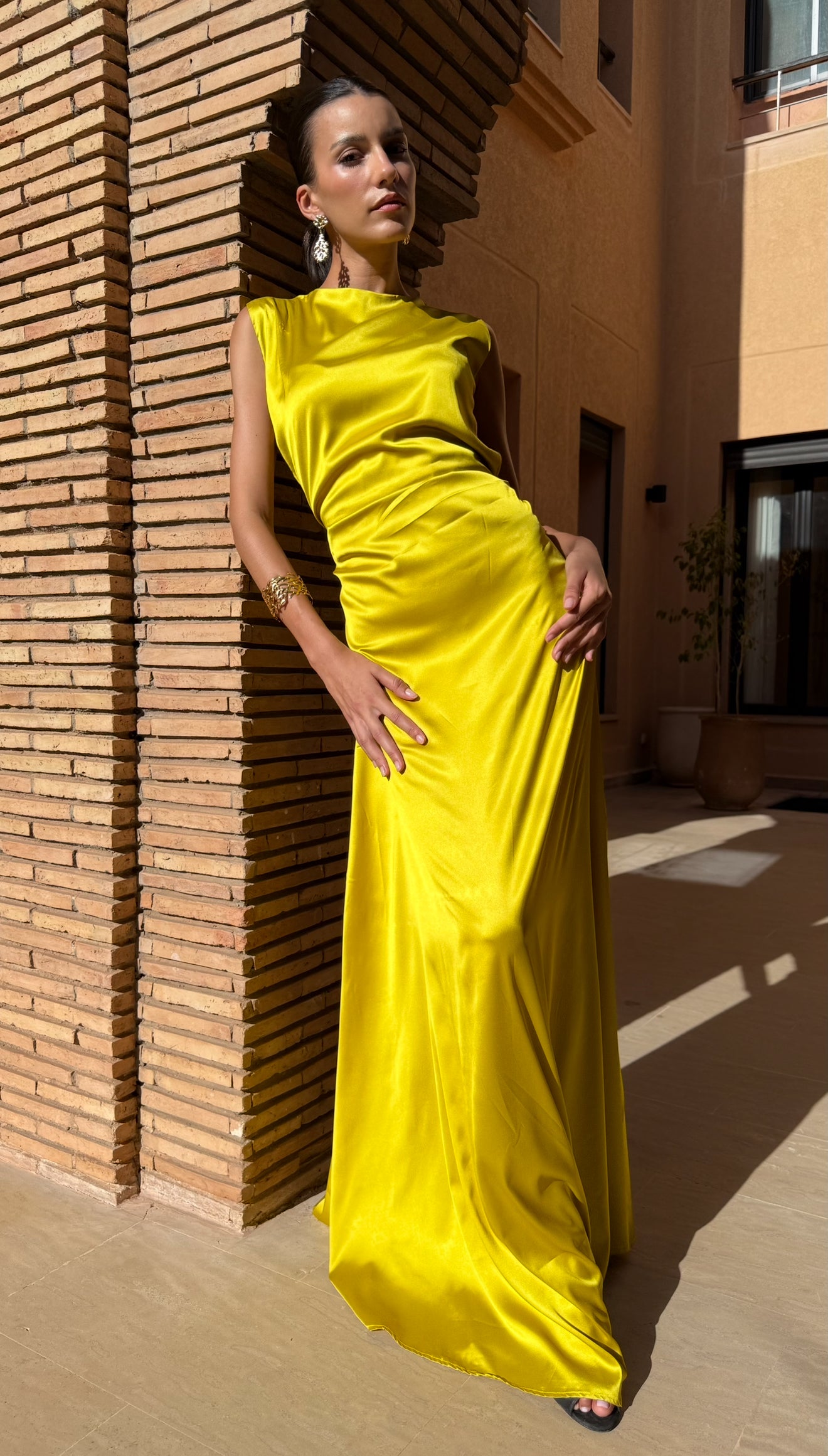 La robe SYNTELLA est une ode à la féminité. Sa coupe évasée et son tissu satiné fluide épousent le corps sans le mouler, pour un tombé naturel et une allure intemporelle.