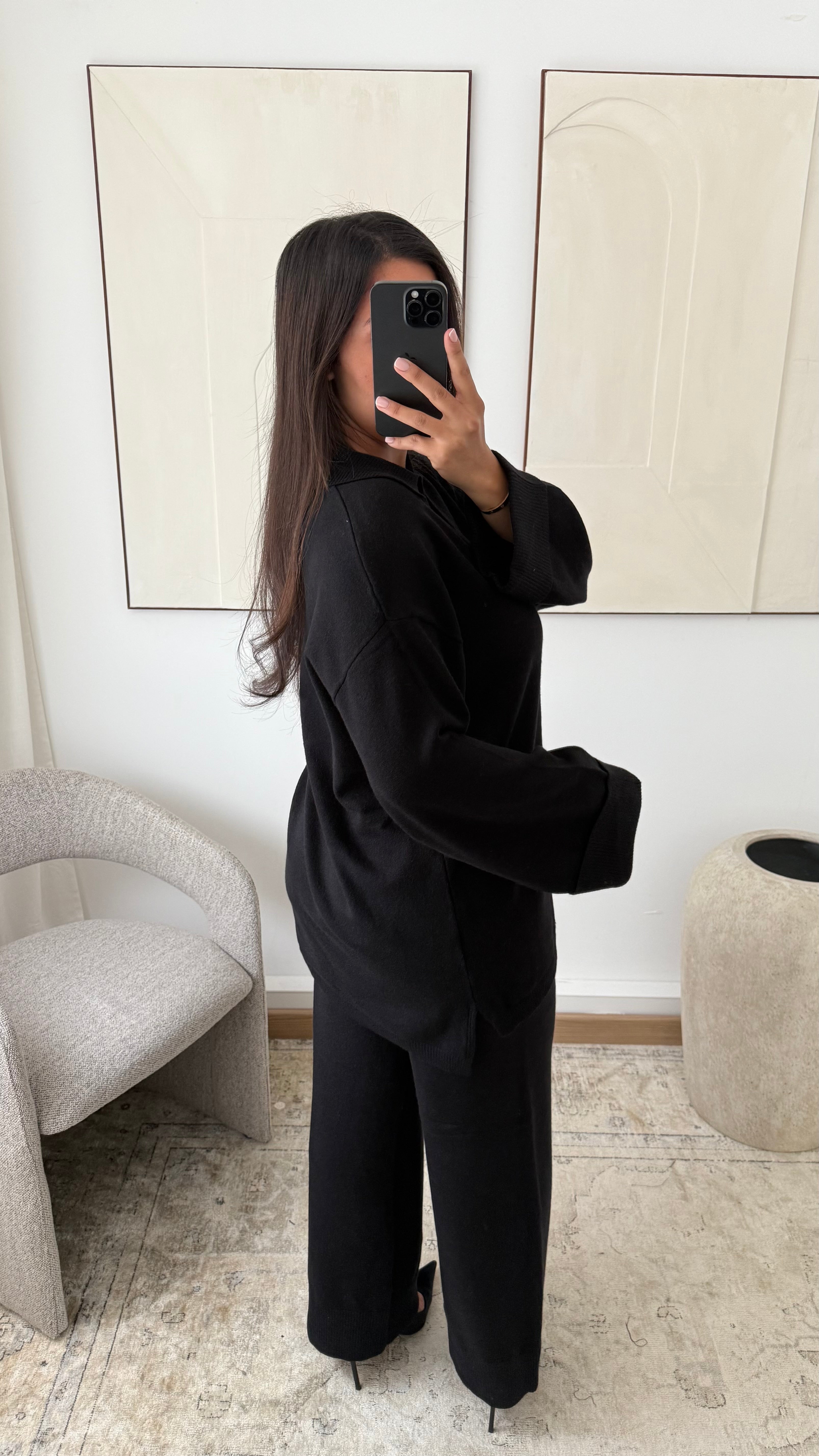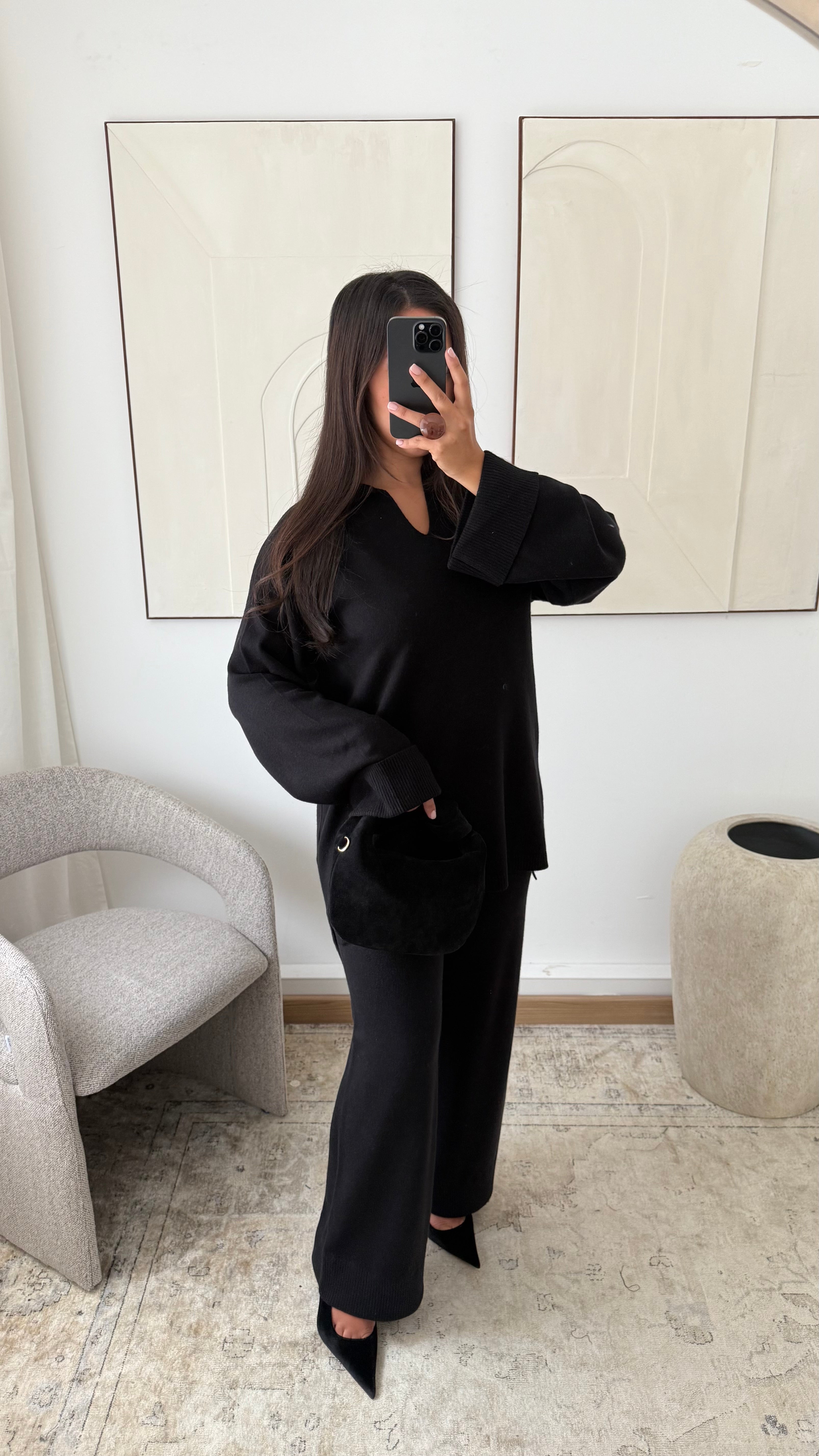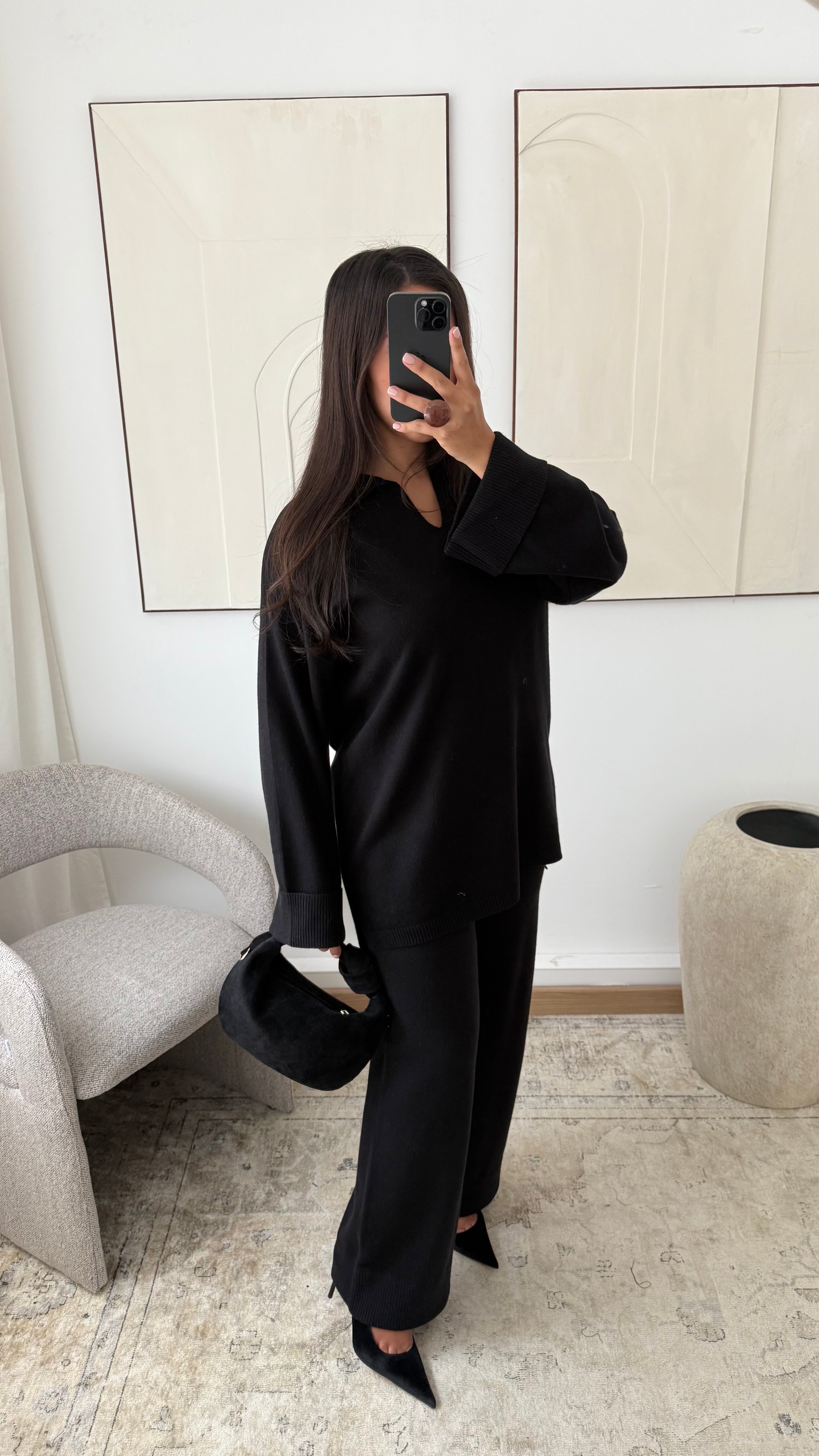 Ensemble deux pièces composé d’un pull col V avec revers et d’un pantalon fluide assorti. Les finitions aux poignets et à l’encolure apportent une touche structurée à cette tenue cosy, idéale pour l’automne.