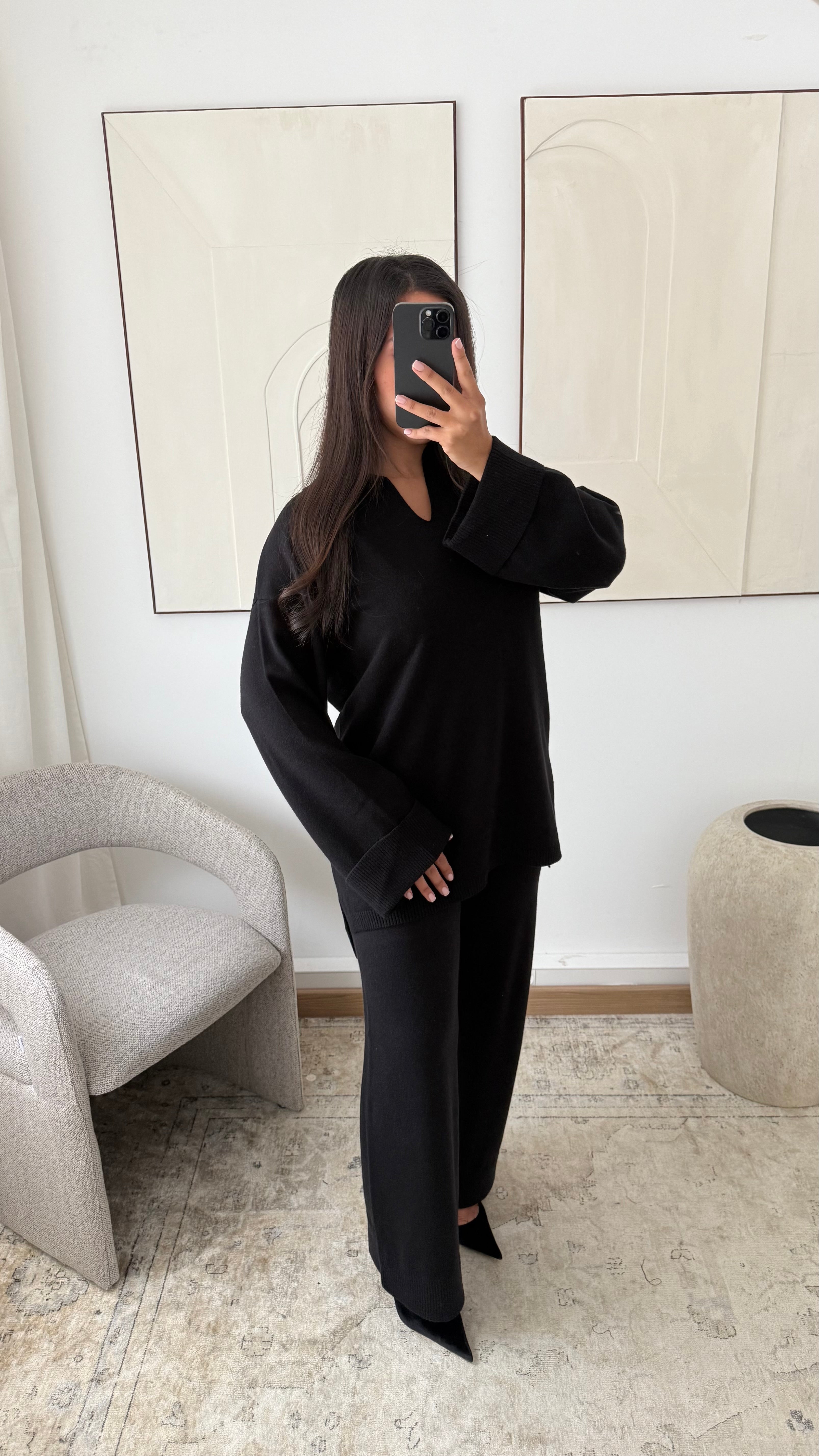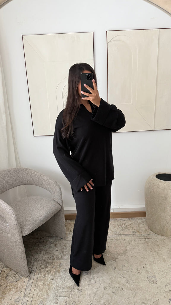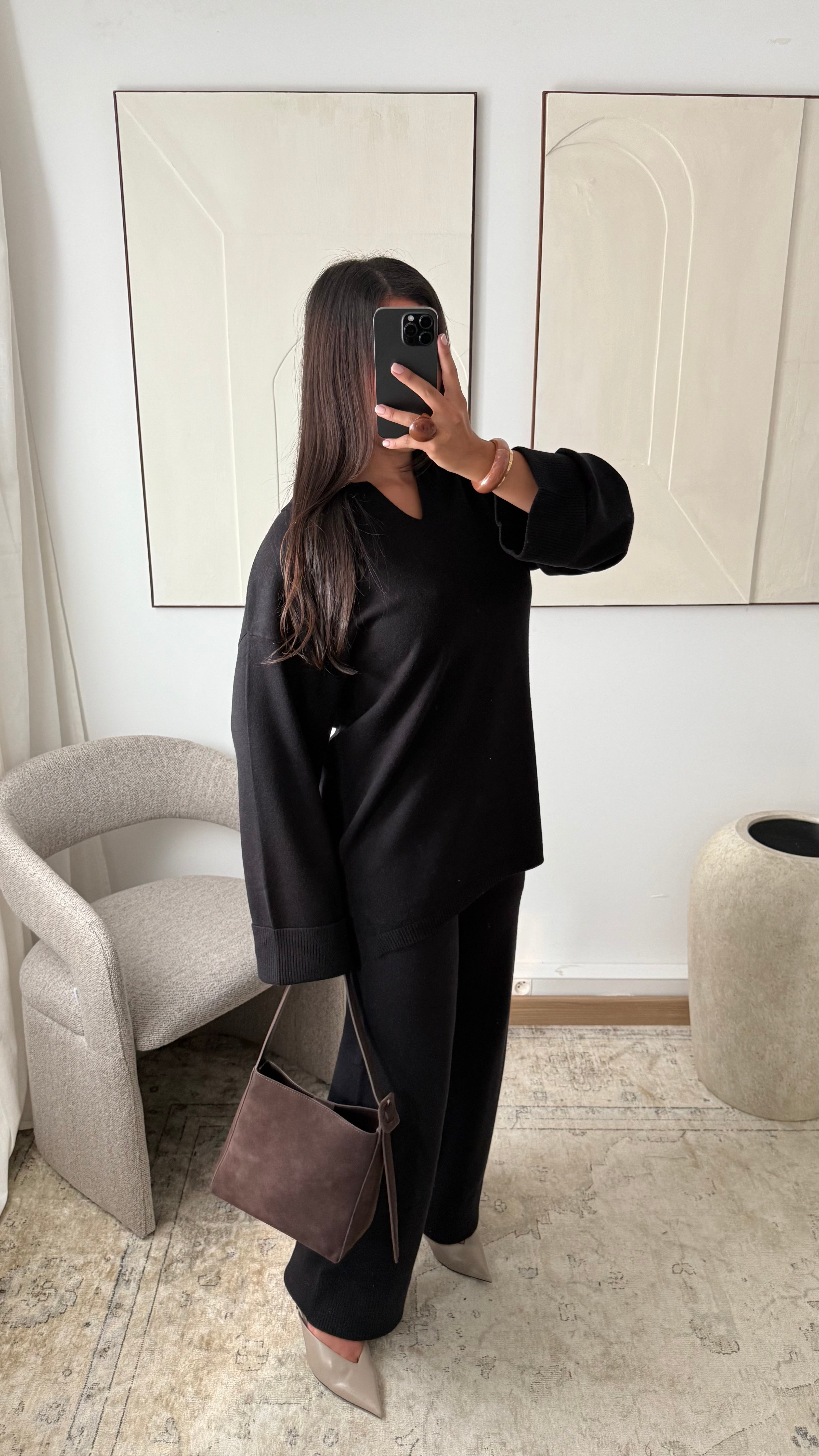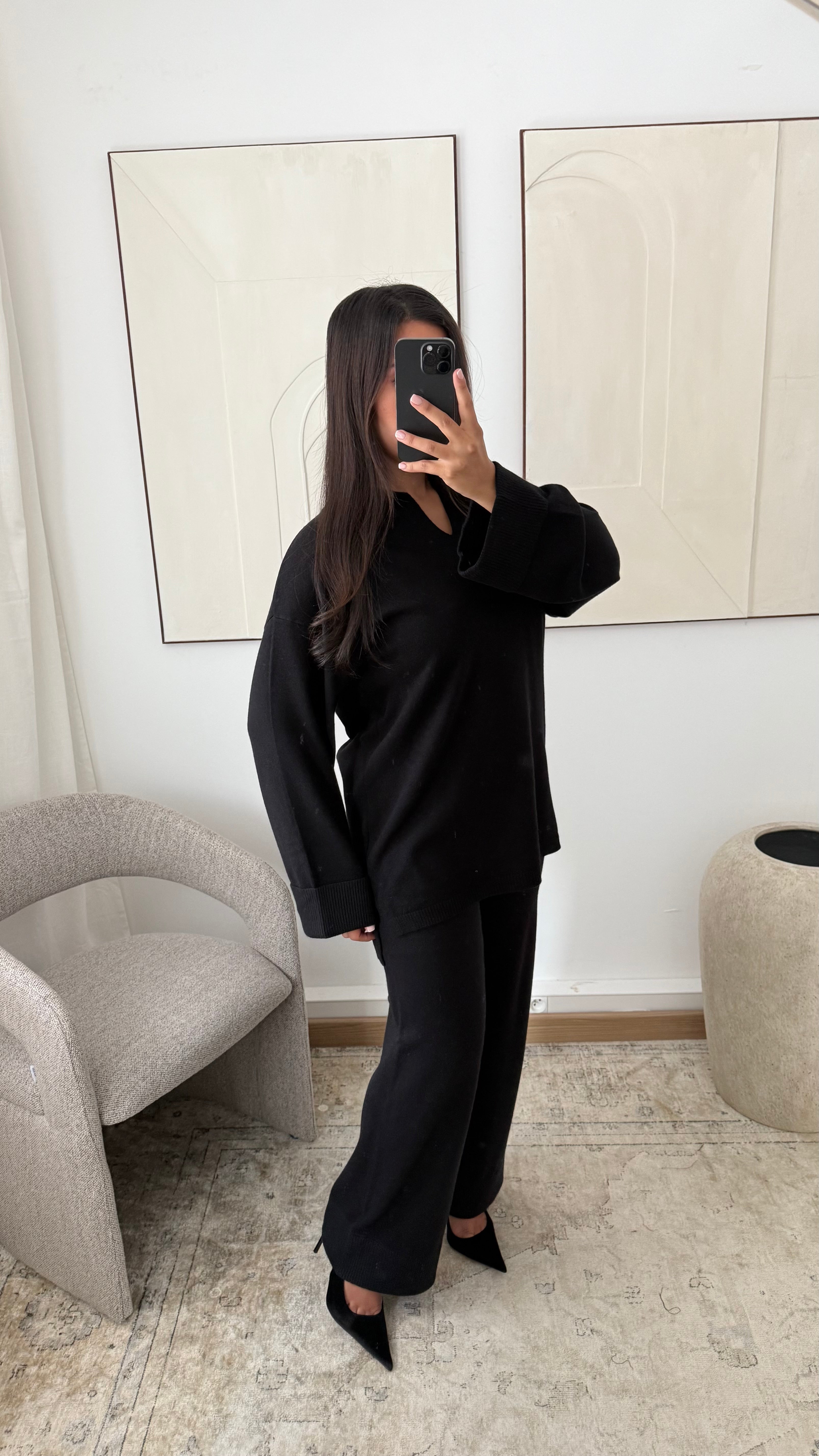Ensemble deux pièces composé d’un pull col V avec revers et d’un pantalon fluide assorti. Les finitions aux poignets et à l’encolure apportent une touche structurée à cette tenue cosy, idéale pour l’automne.