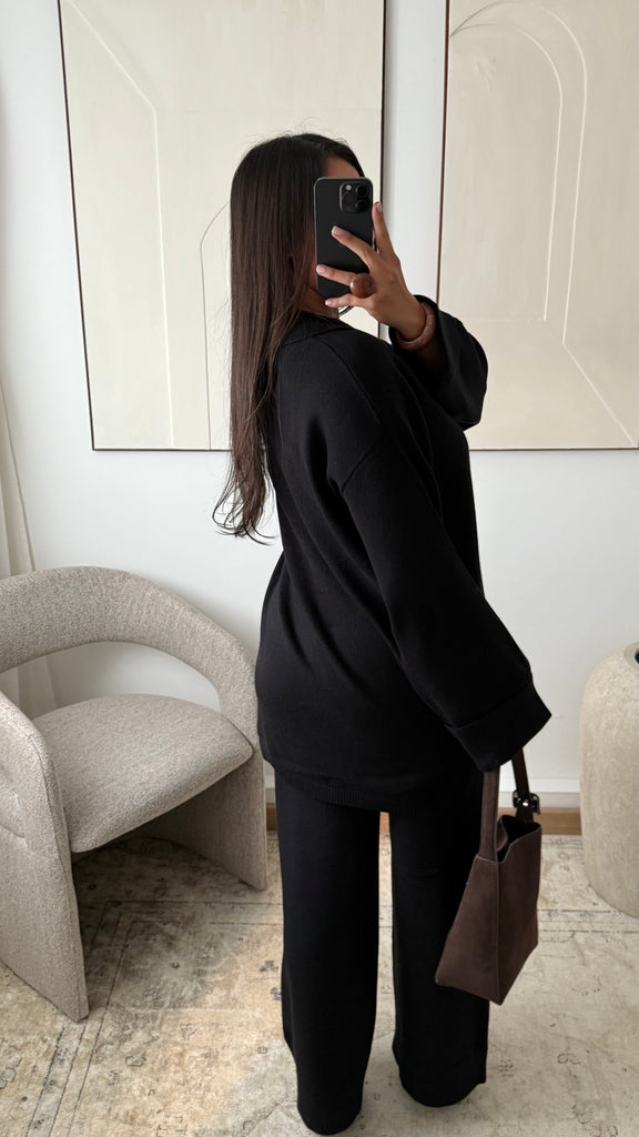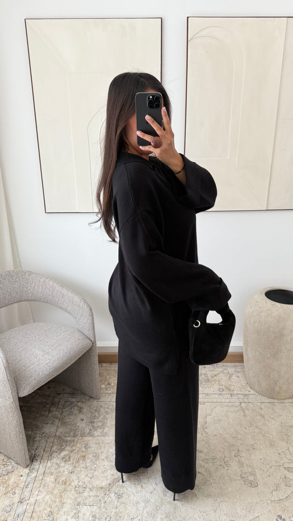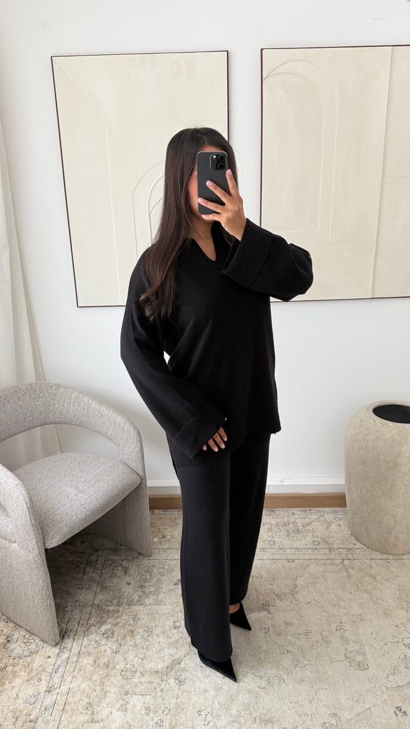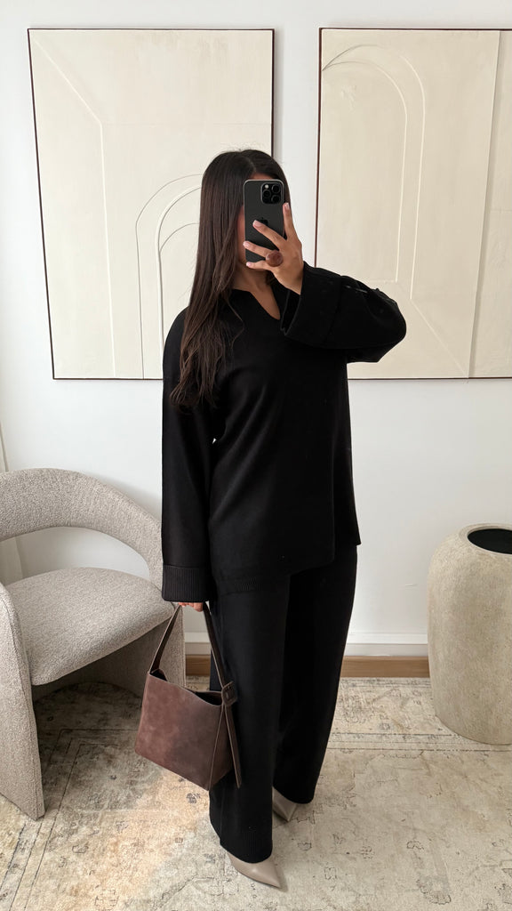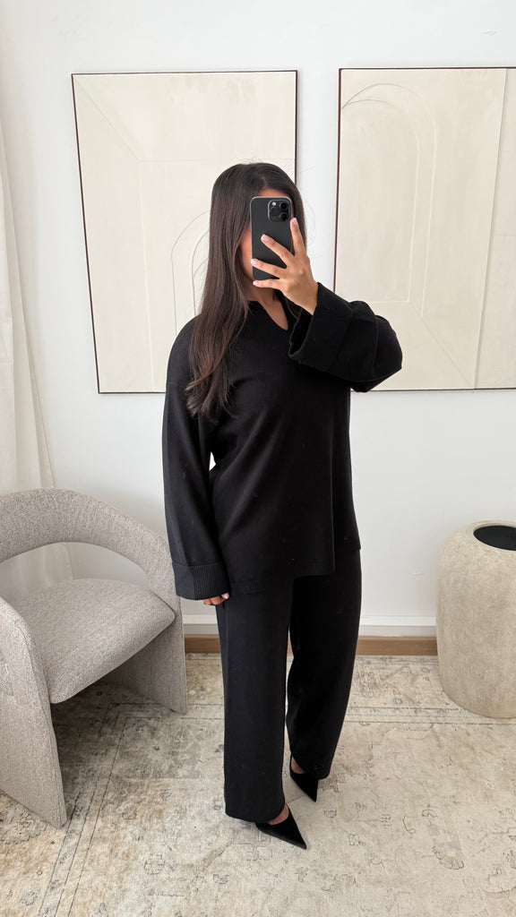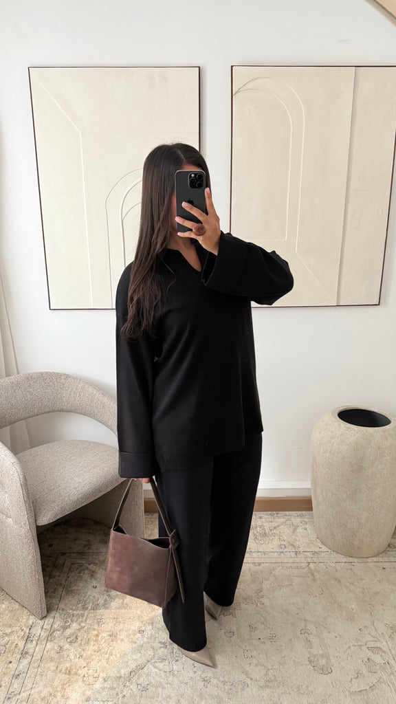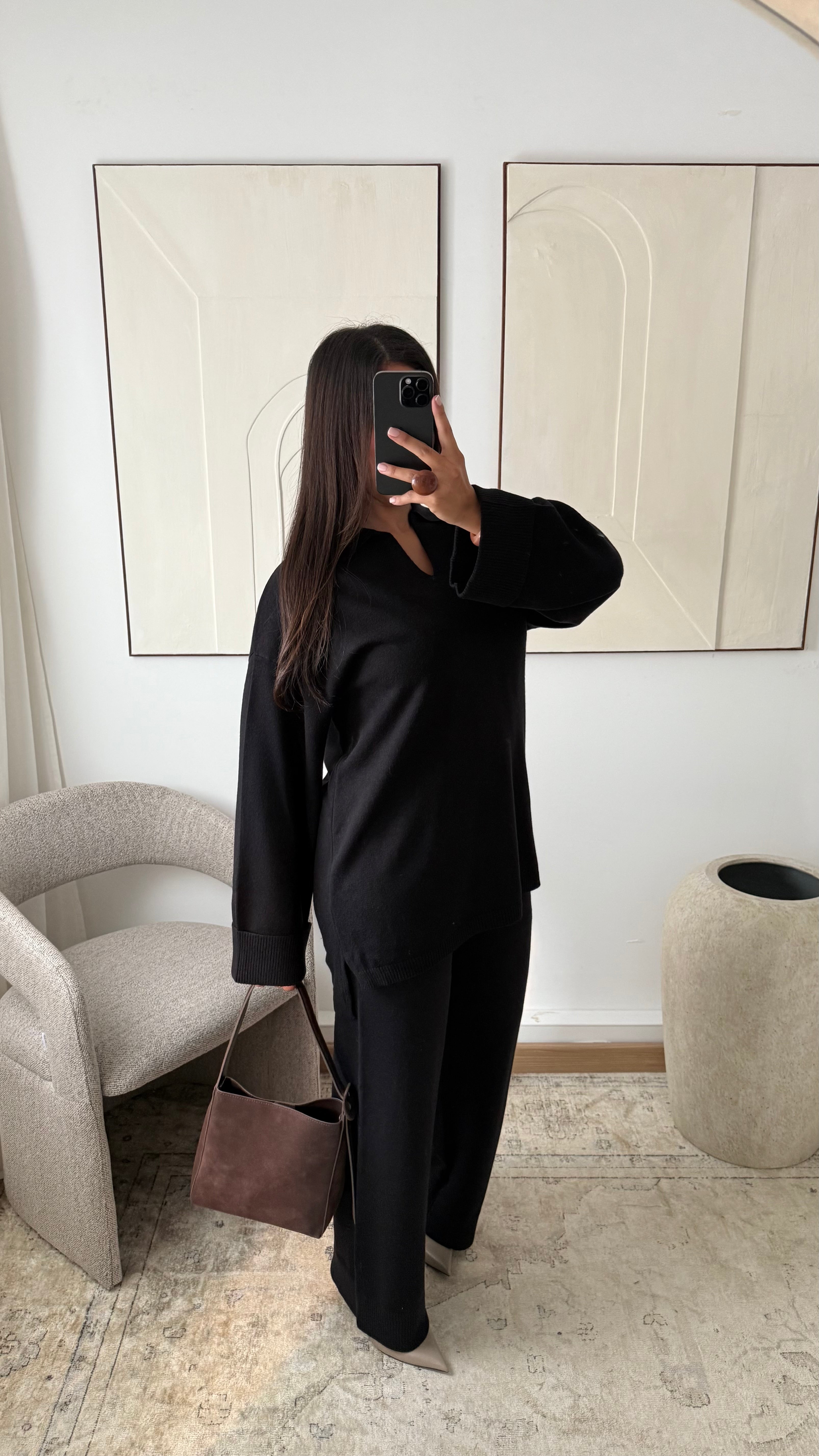 Ensemble deux pièces composé d’un pull col V avec revers et d’un pantalon fluide assorti. Les finitions aux poignets et à l’encolure apportent une touche structurée à cette tenue cosy, idéale pour l’automne.