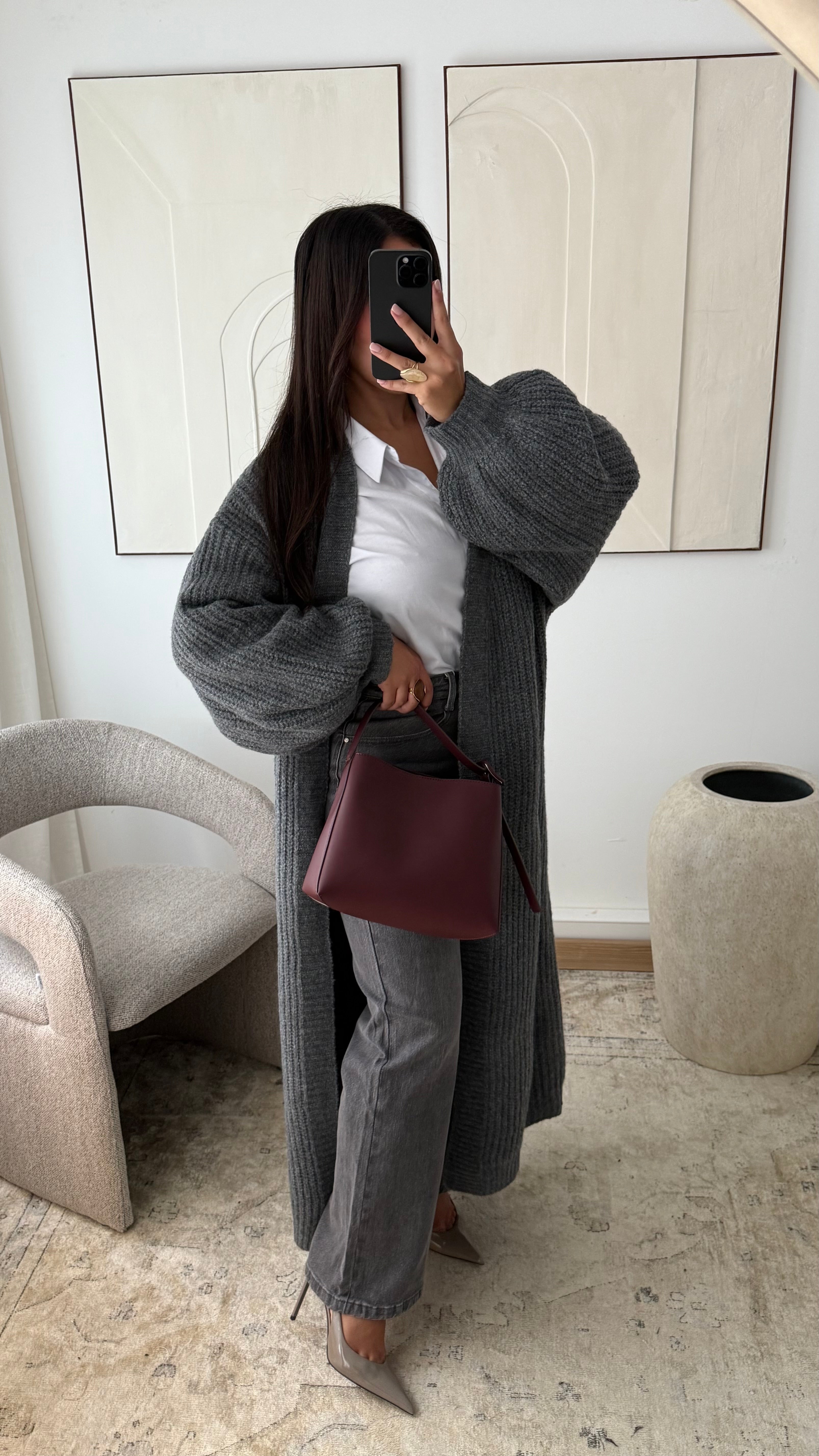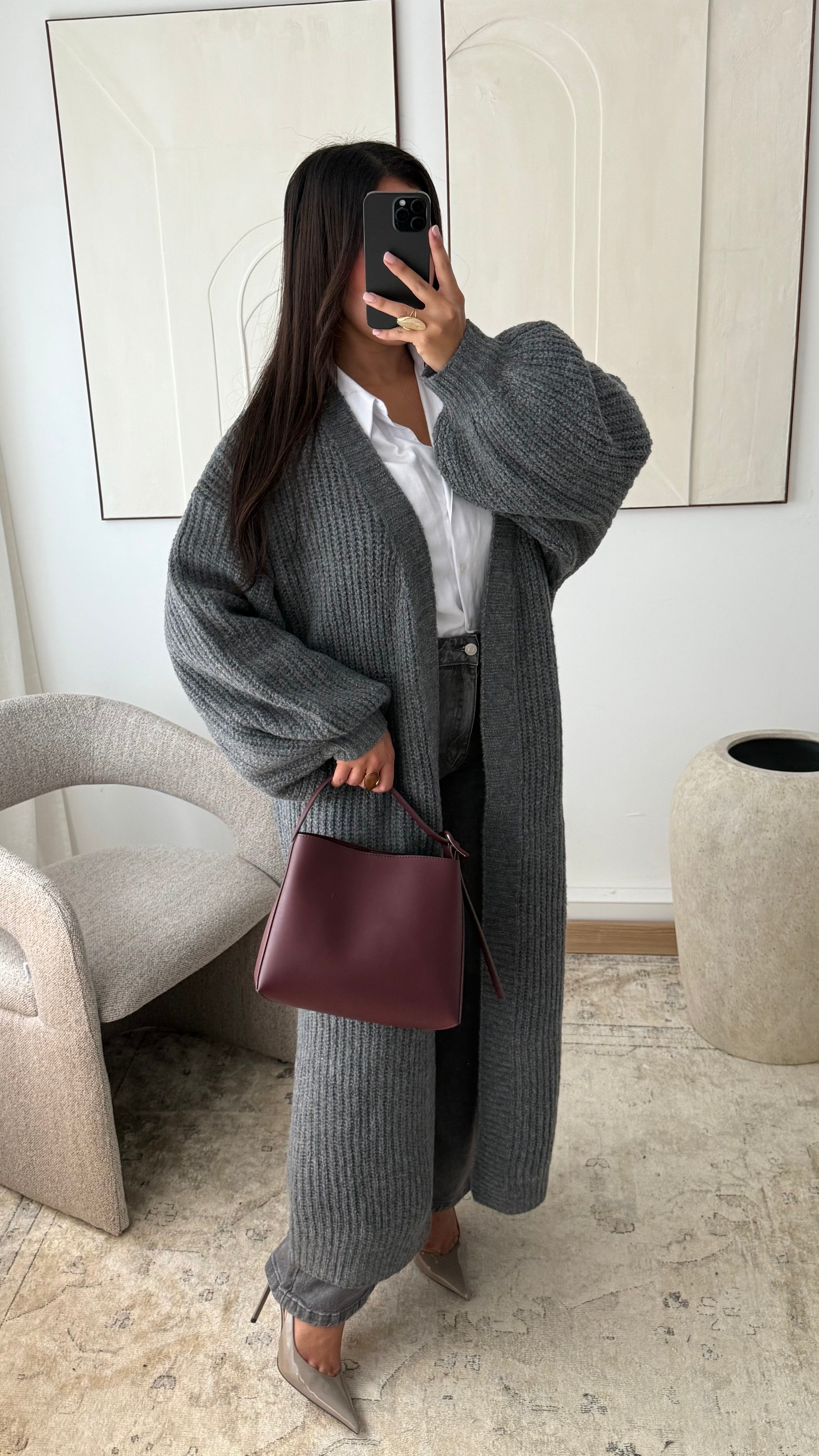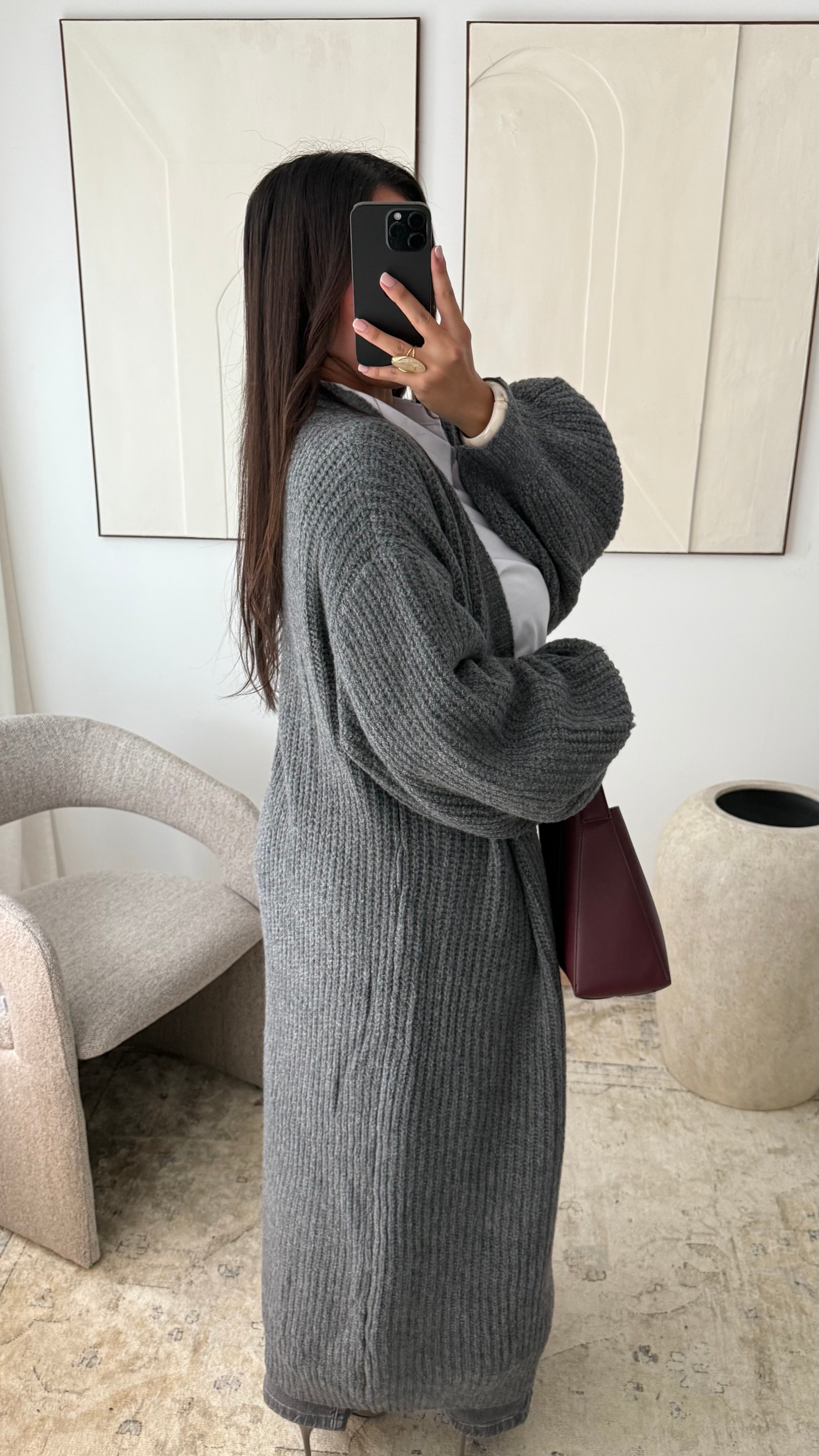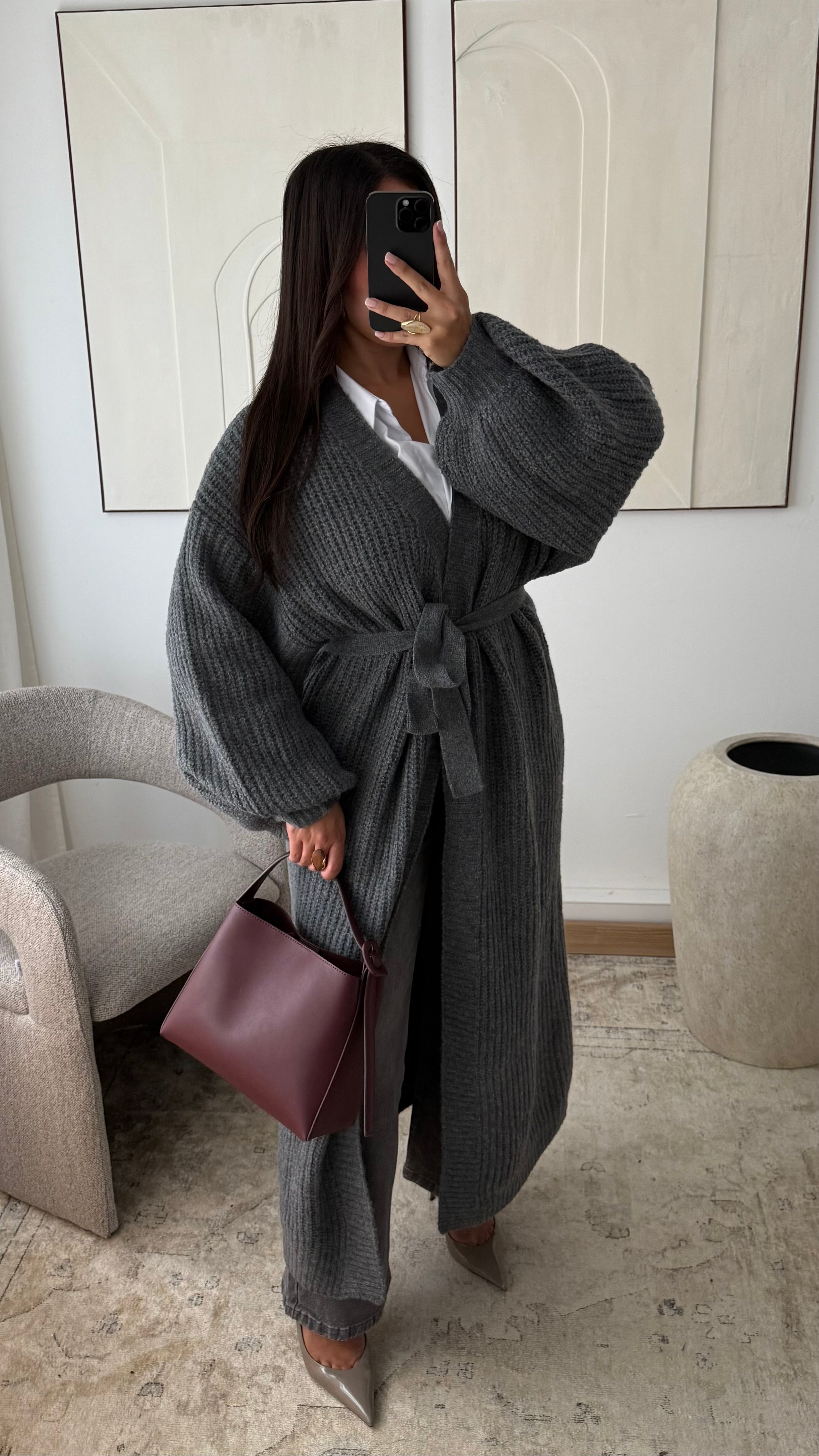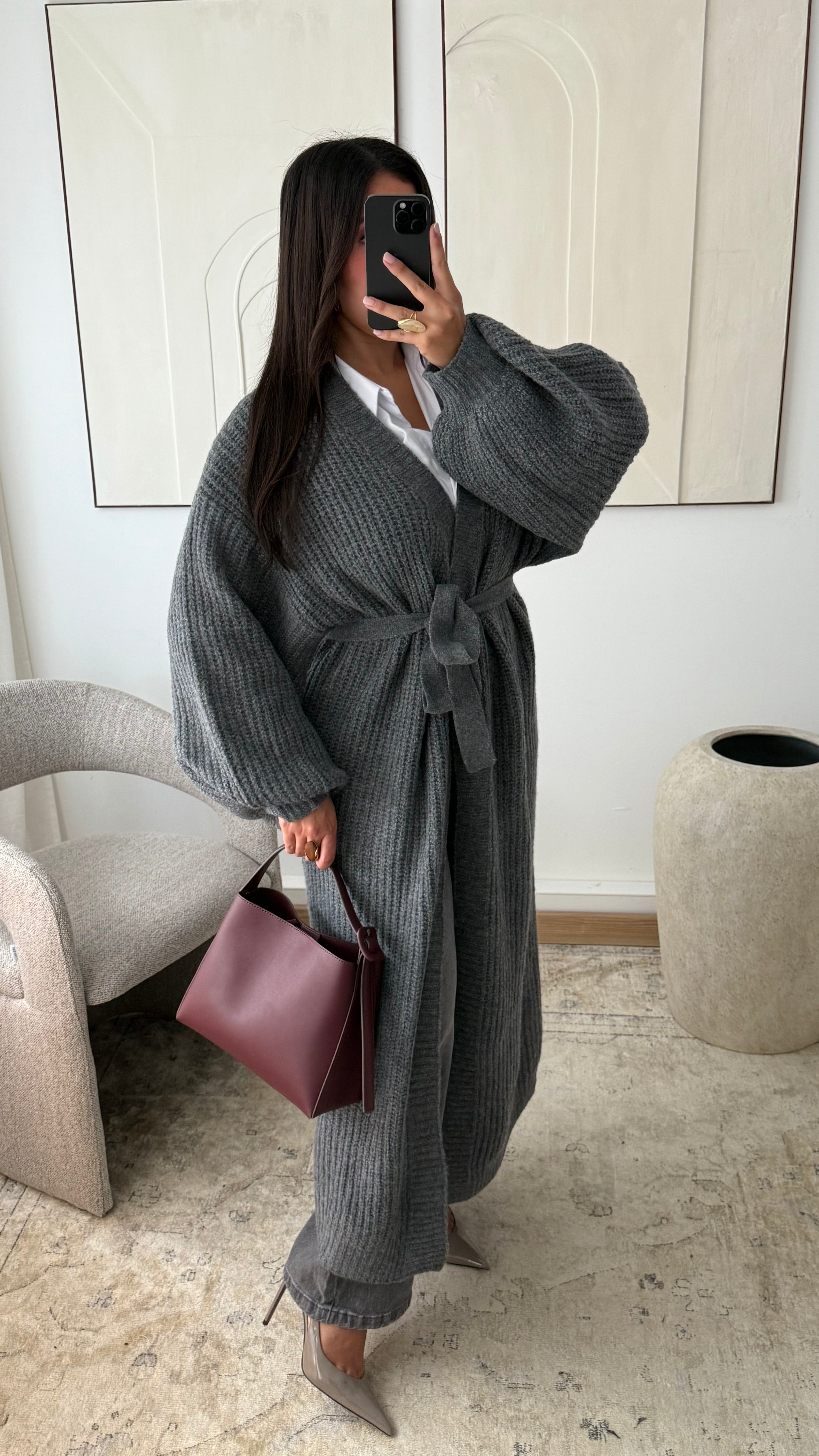 Cardigan long en maille douce avec ceinture à nouer, parfait pour ajouter une touche élégante et confortable à vos tenues. Sa coupe fluide et sa longueur couvrante en font une pièce idéale pour les looks modest fashion. Il peut se porter ouvert ou ceinturé pour structurer la silhouette.